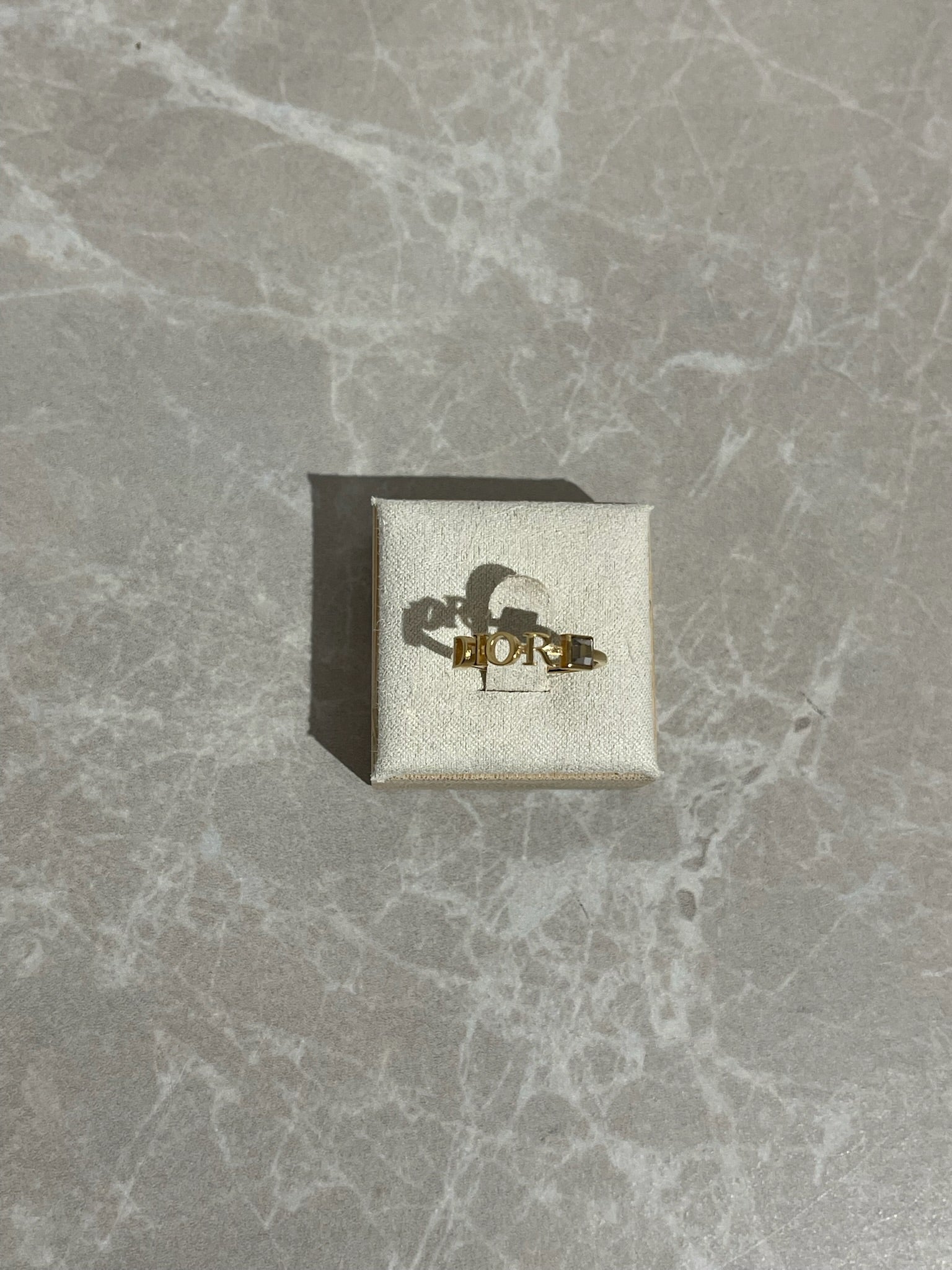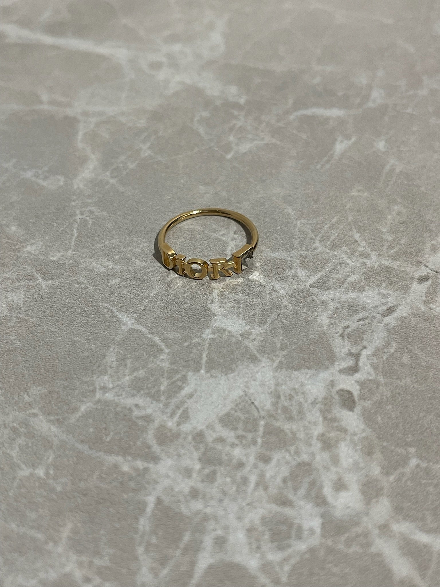 Bague en métal doré ornée de l'écriture Dior avec un strass argenté.