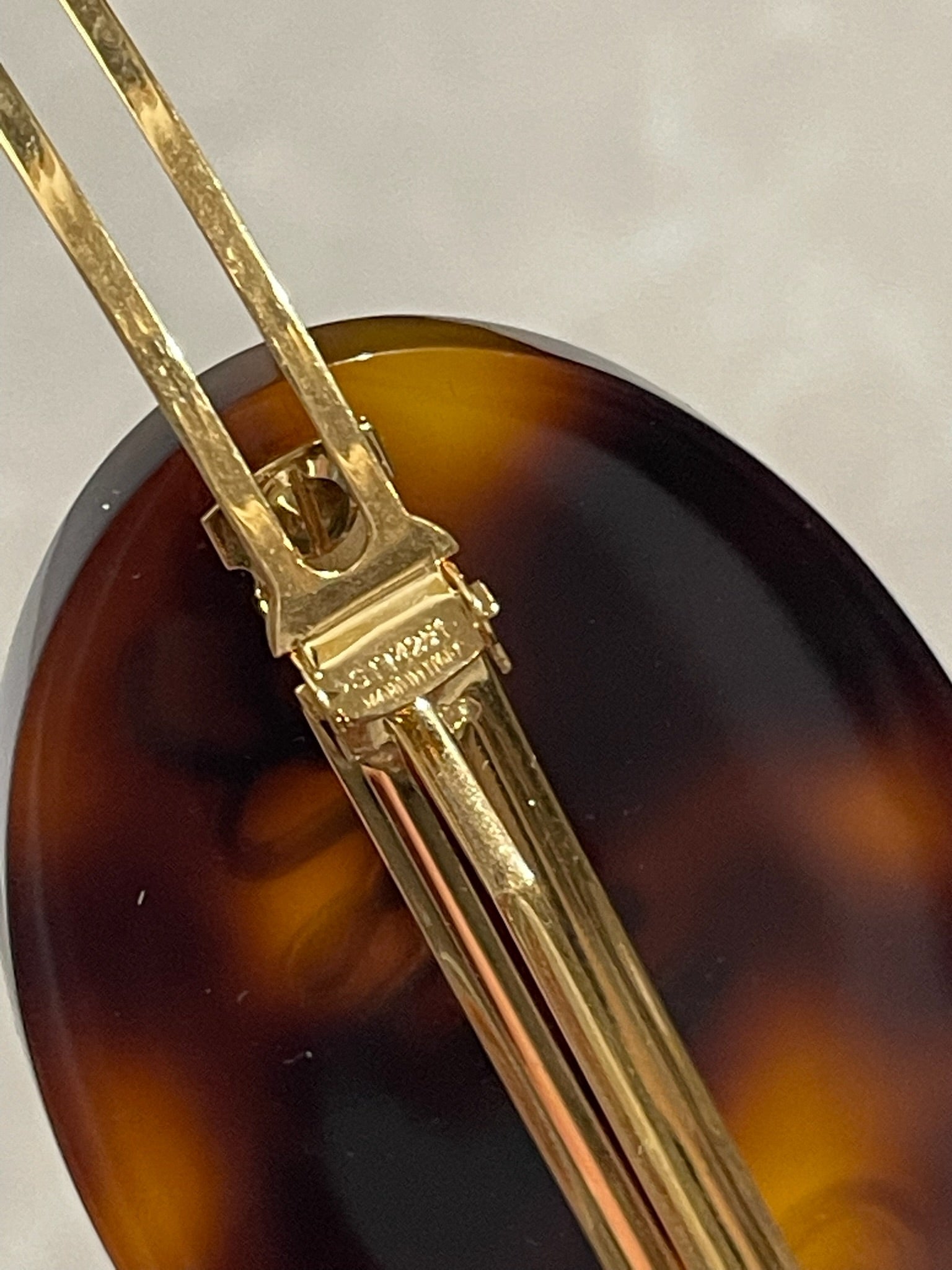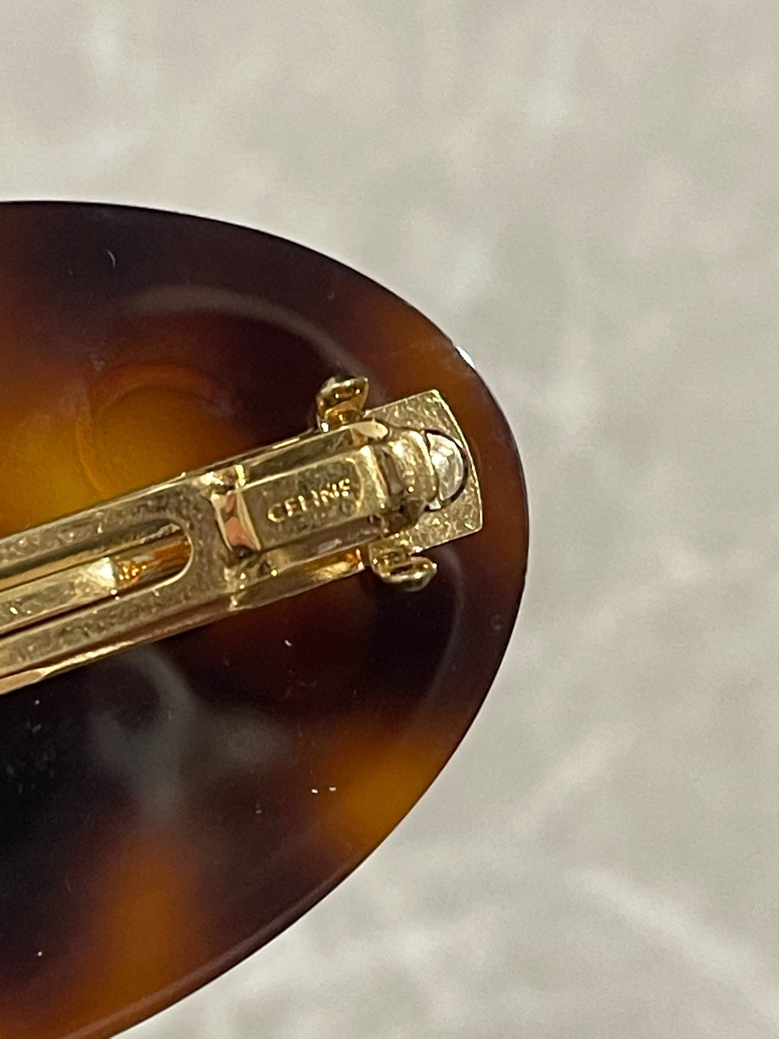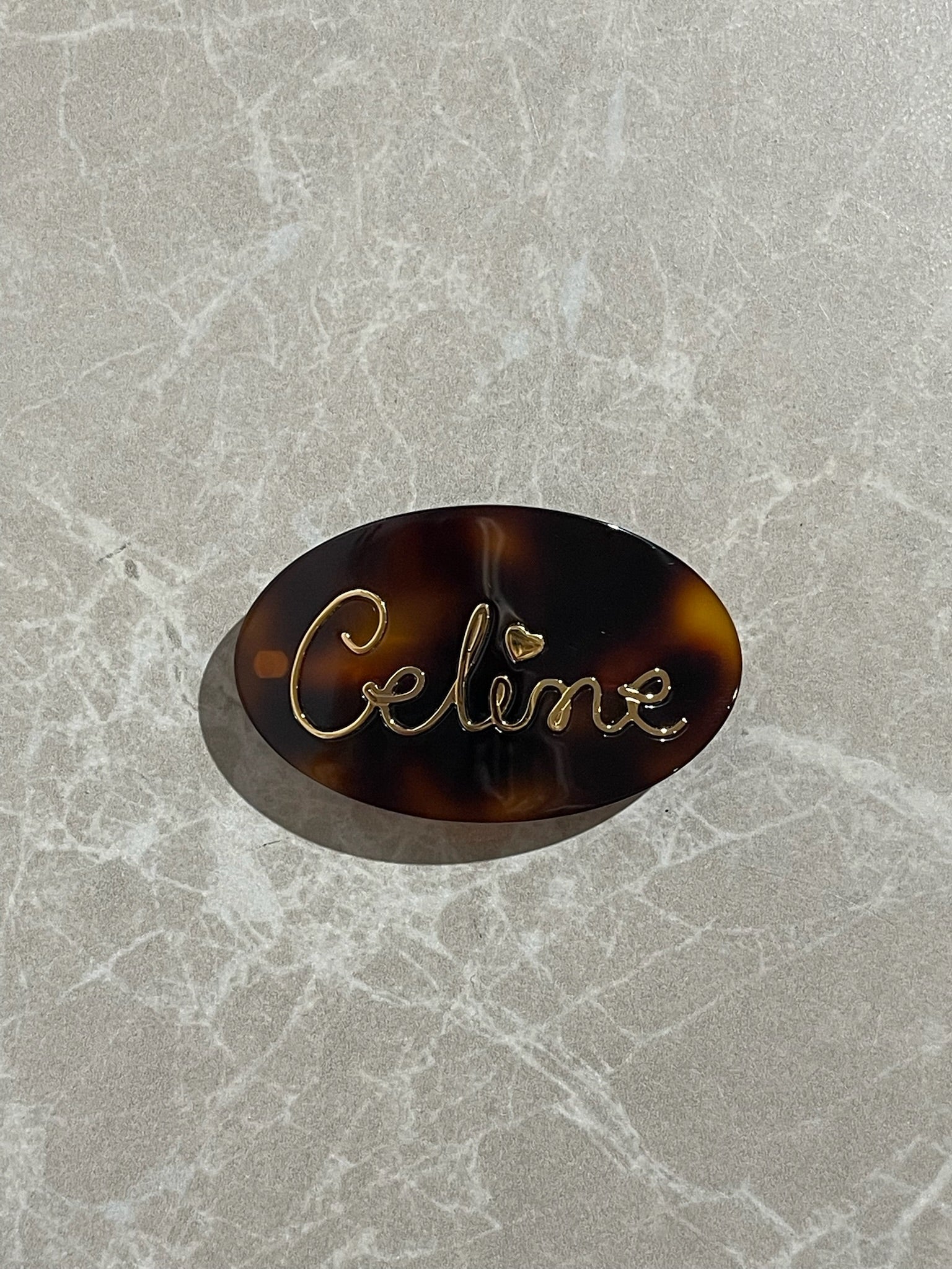 Barrette ovale en écaille marron avec l'inscription "Celine" en doré avec fermoir épingle et poinçon Celine.