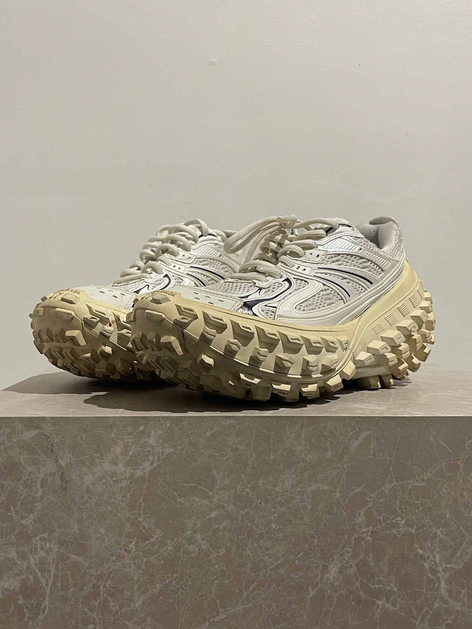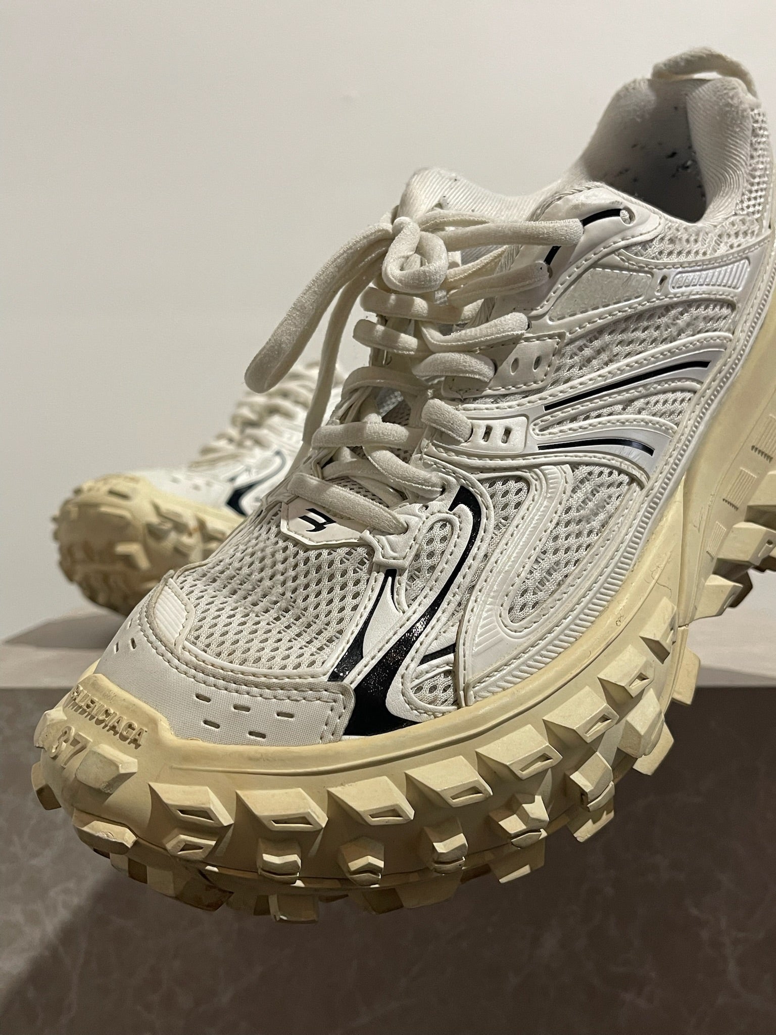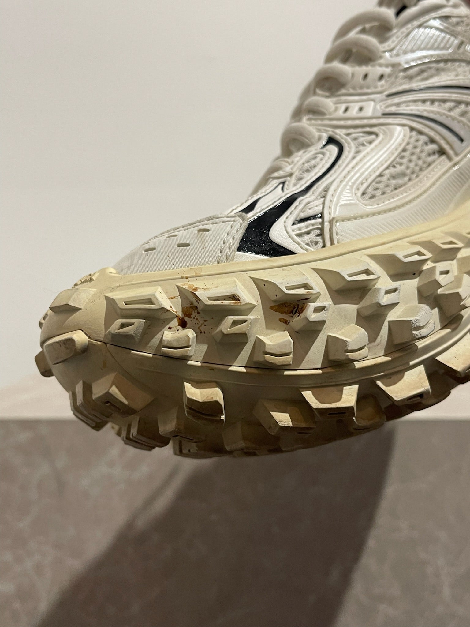 Baskets en maille et nylon blanc. Semelle épaisse effet jaunie inspirée des pneus (cambrure de 15 mm). Pointure et logo écrit à l'arrière de la basket.