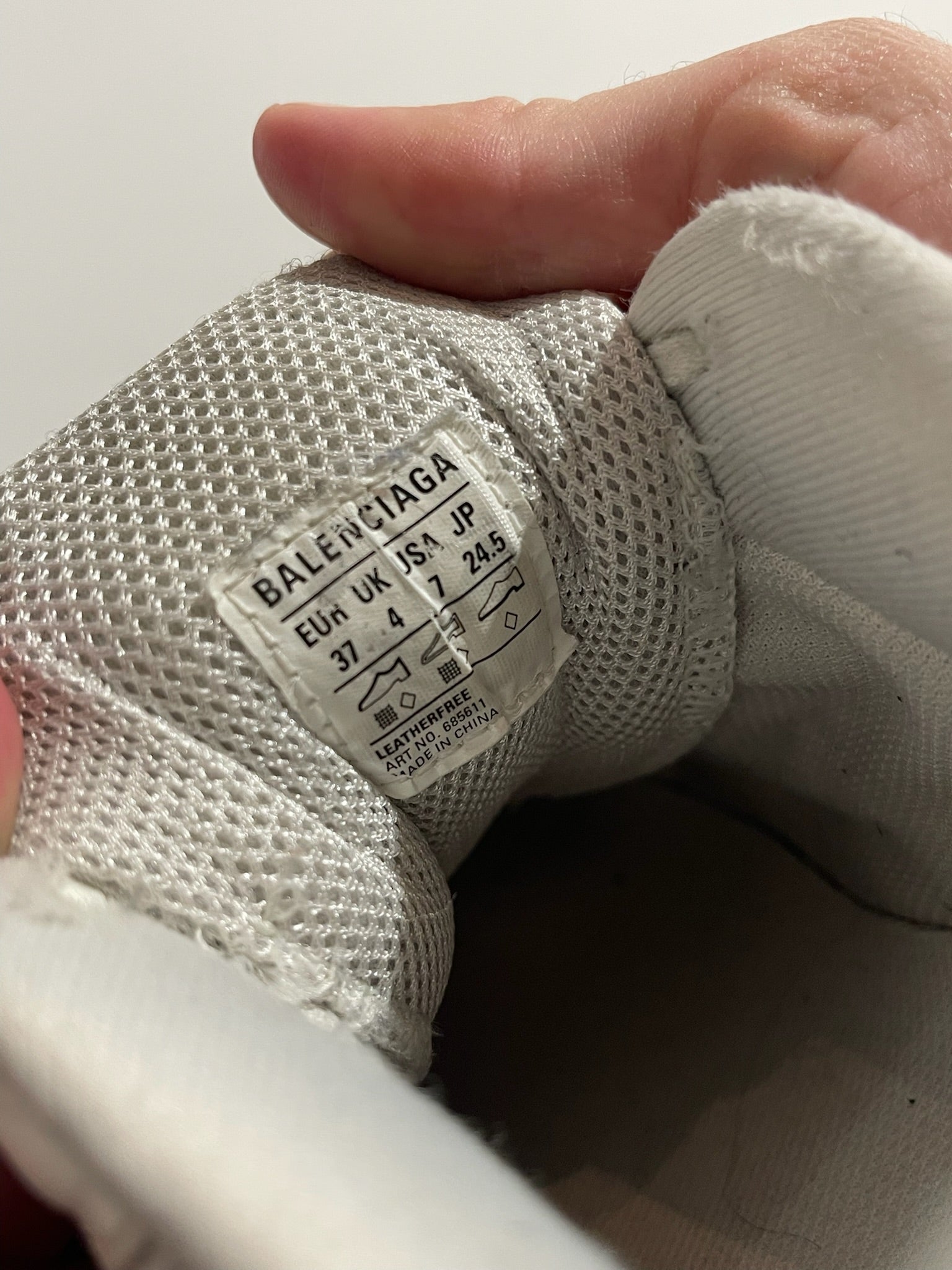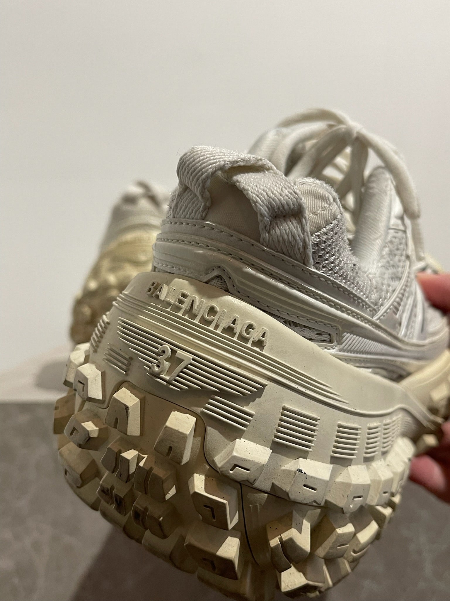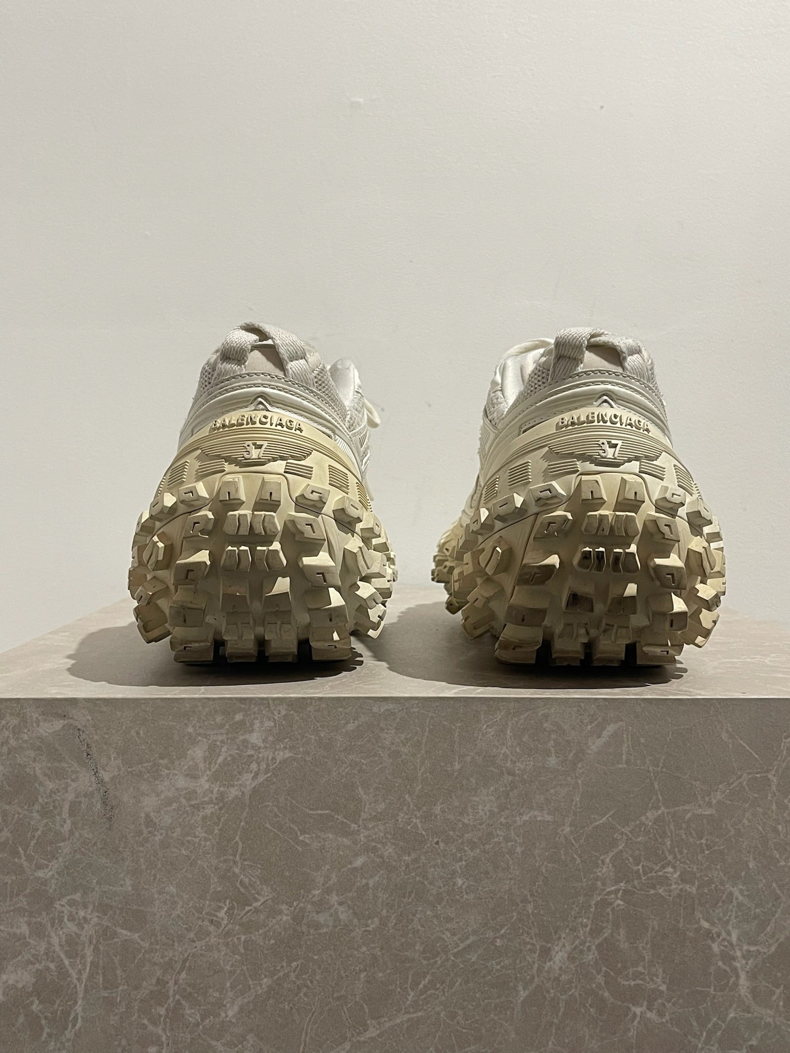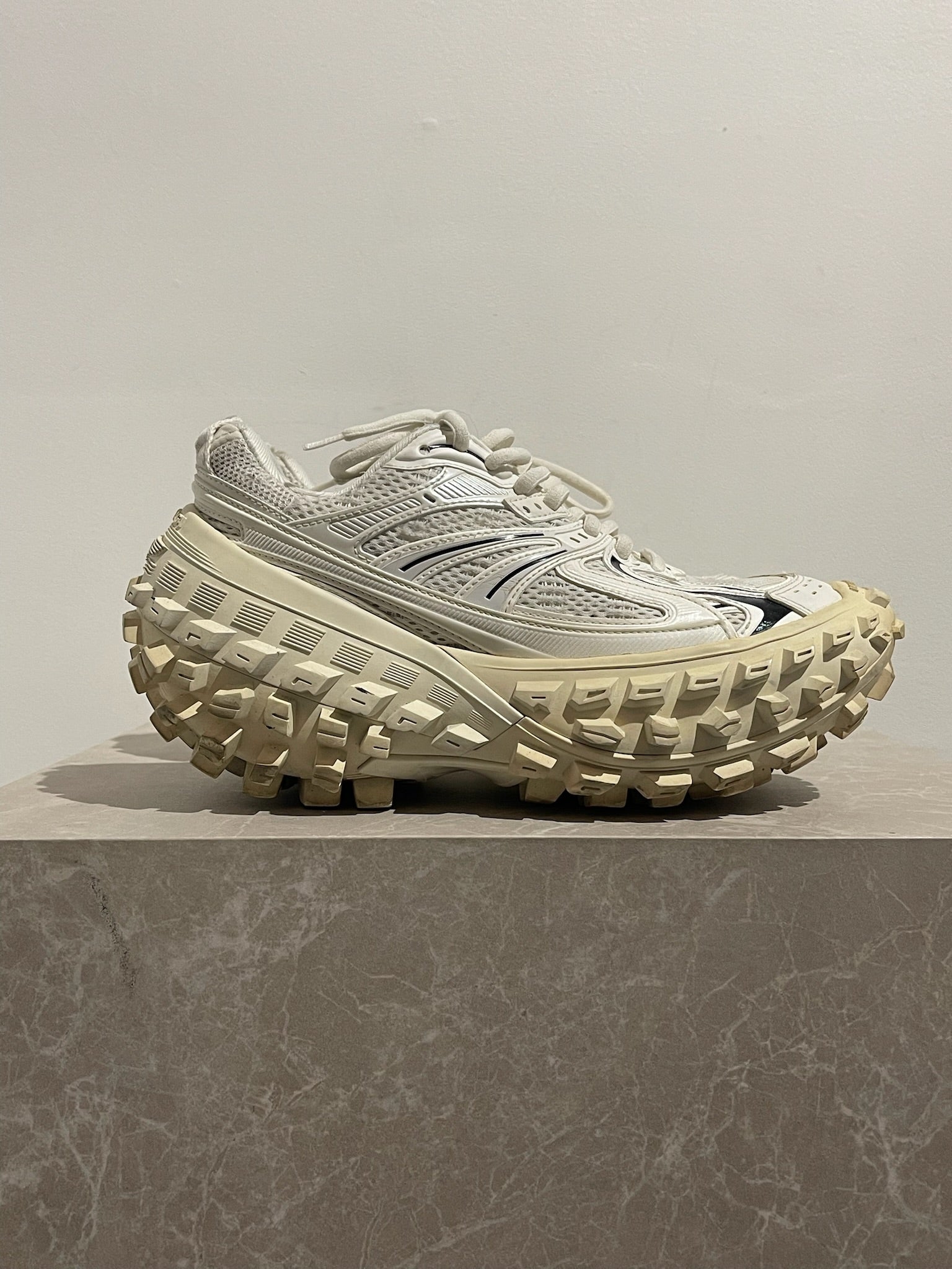 Baskets en maille et nylon blanc. Semelle épaisse effet jaunie inspirée des pneus (cambrure de 15 mm). Pointure et logo écrit à l'arrière de la basket.