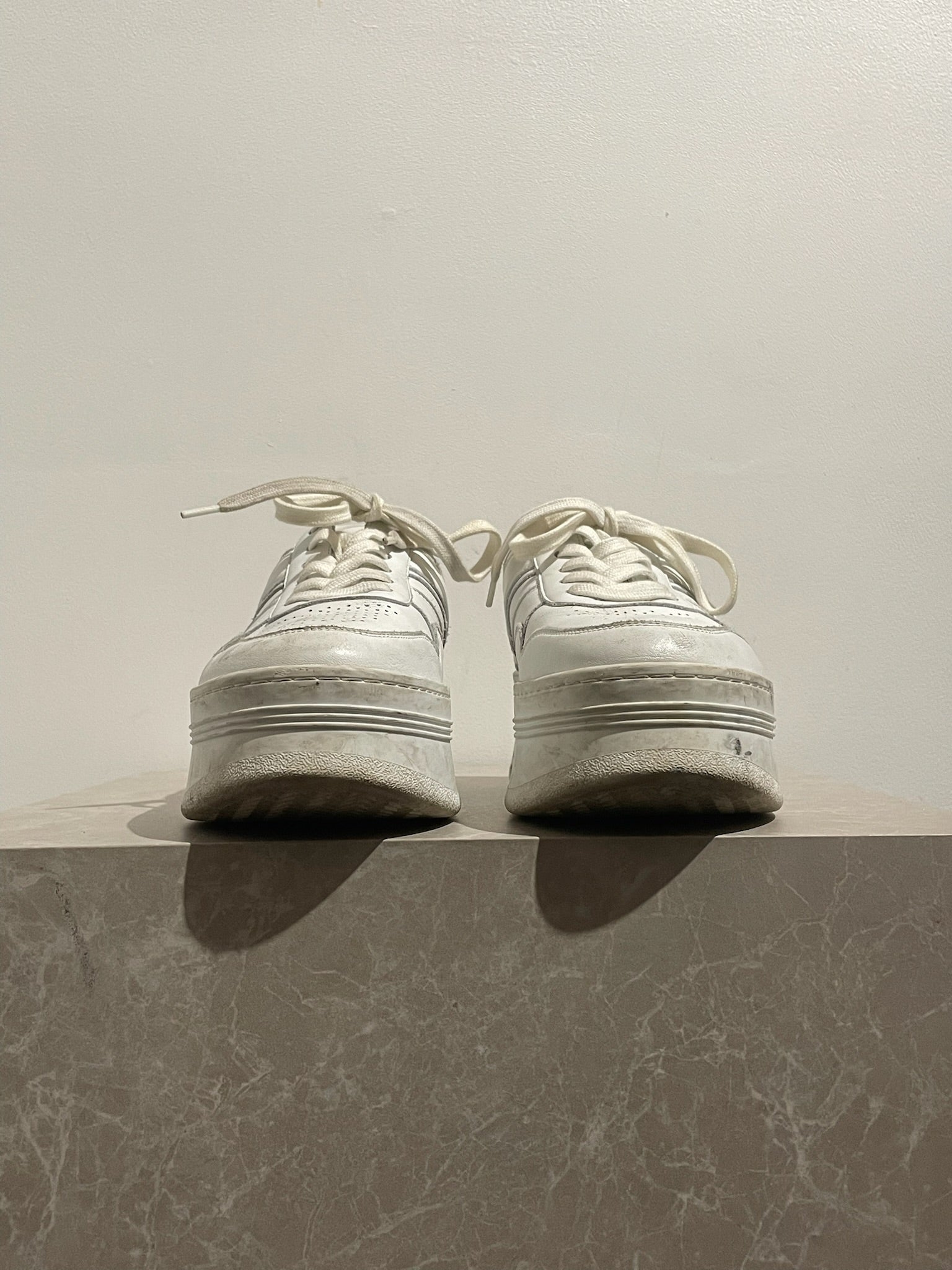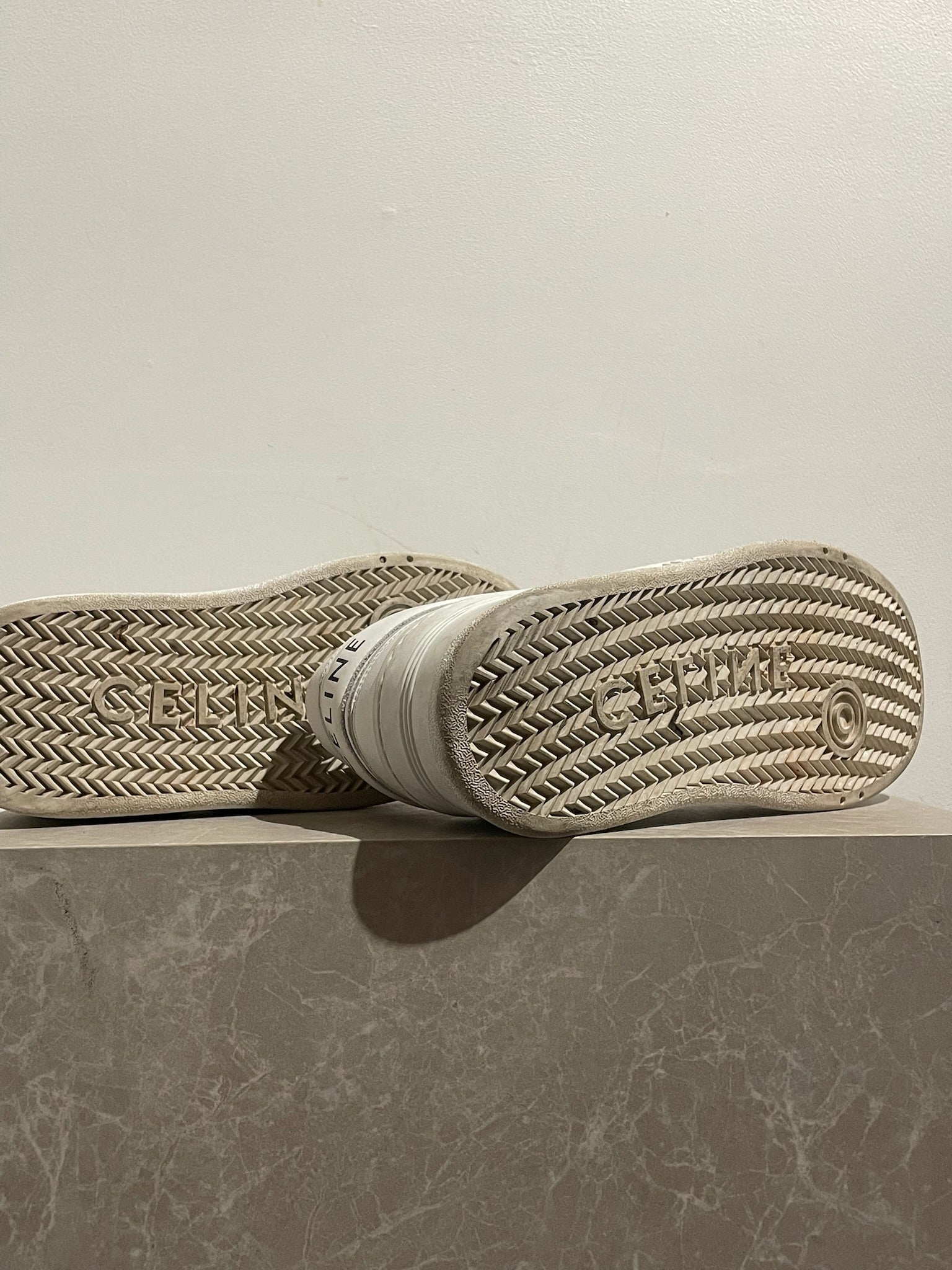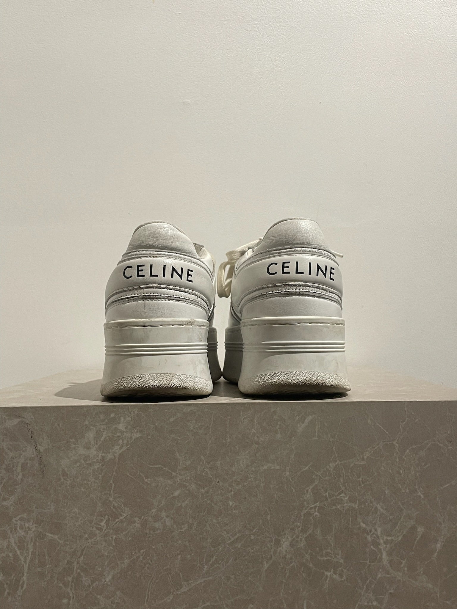 Baskets basses emblématiques en cuir blanc avec détails perforés à l'avant, fermeture à lacets, semelle en caoutchouc épaisses (5cm) et logo "CELINE" apposé sur le côté, l'arrière et la languette.