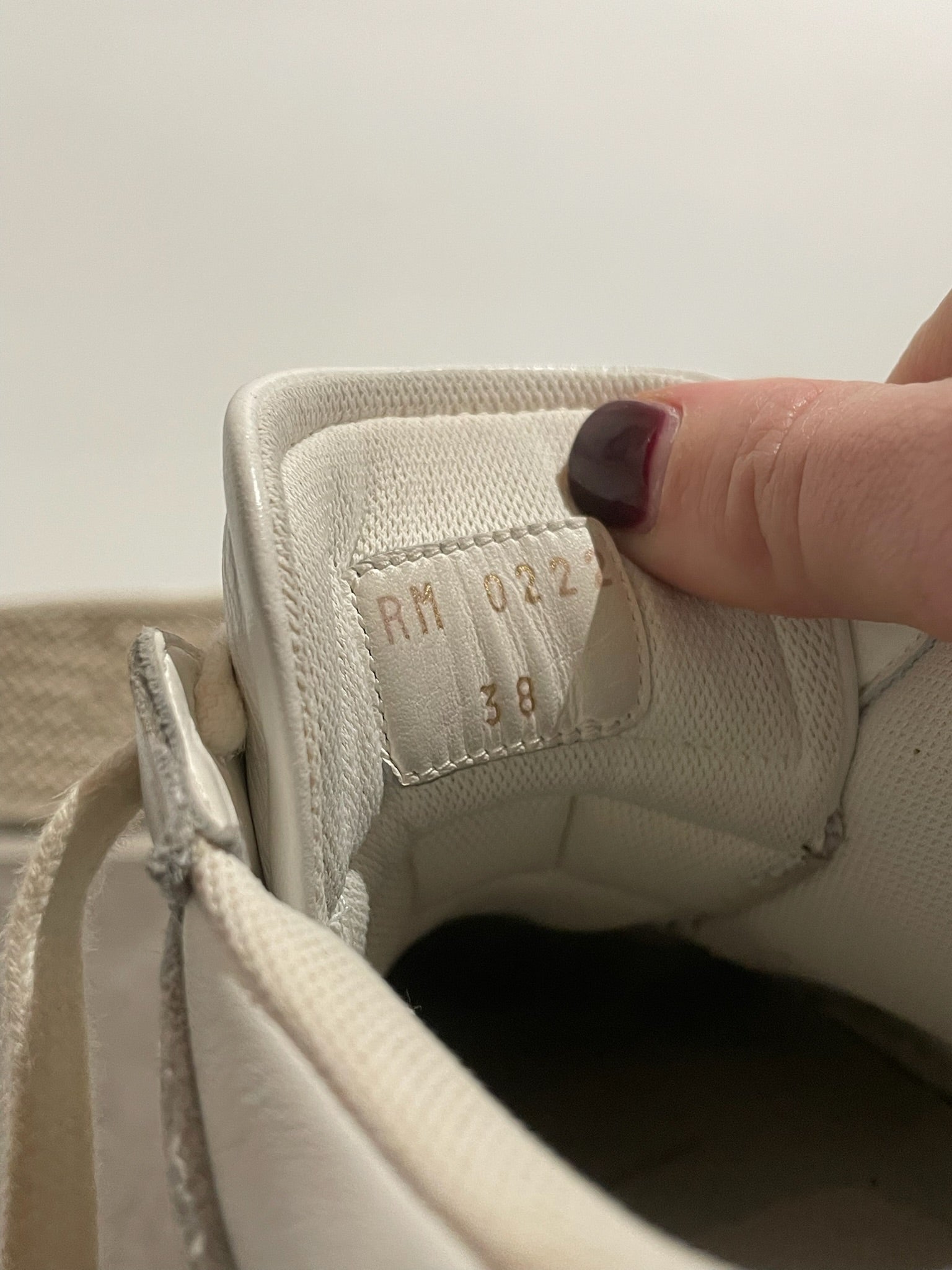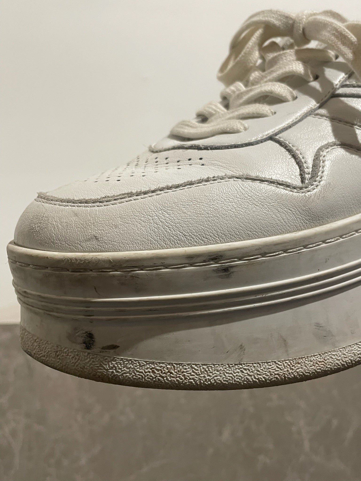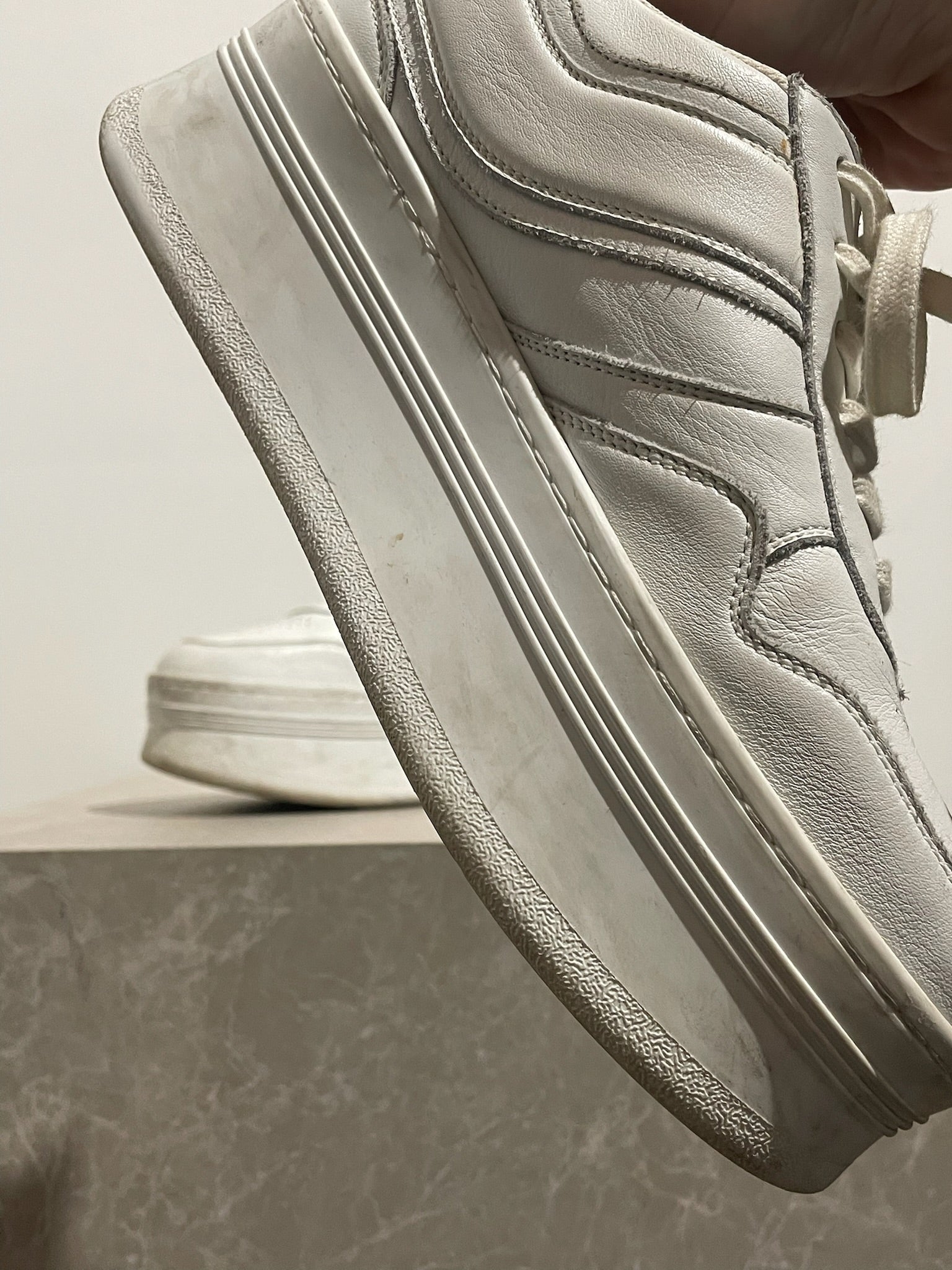 Baskets basses emblématiques en cuir blanc avec détails perforés à l'avant, fermeture à lacets, semelle en caoutchouc épaisses (5cm) et logo "CELINE" apposé sur le côté, l'arrière et la languette.