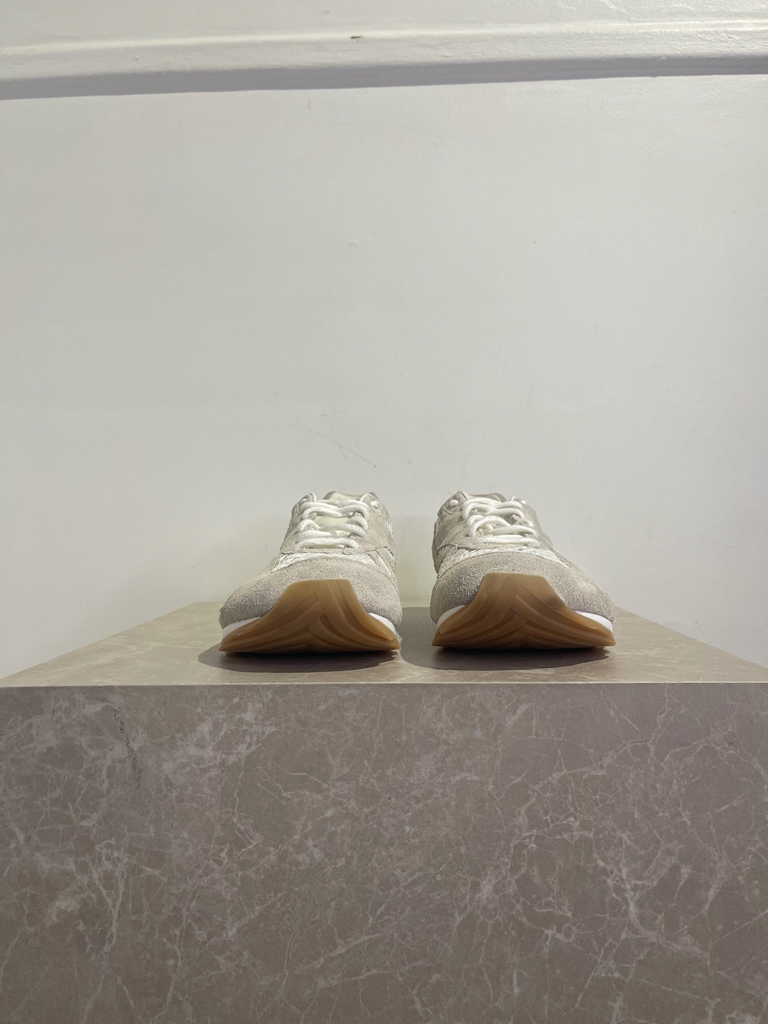 Baskets en daim et maille technique sable et blanc avec fermeture lacet. Semelles en gomme.