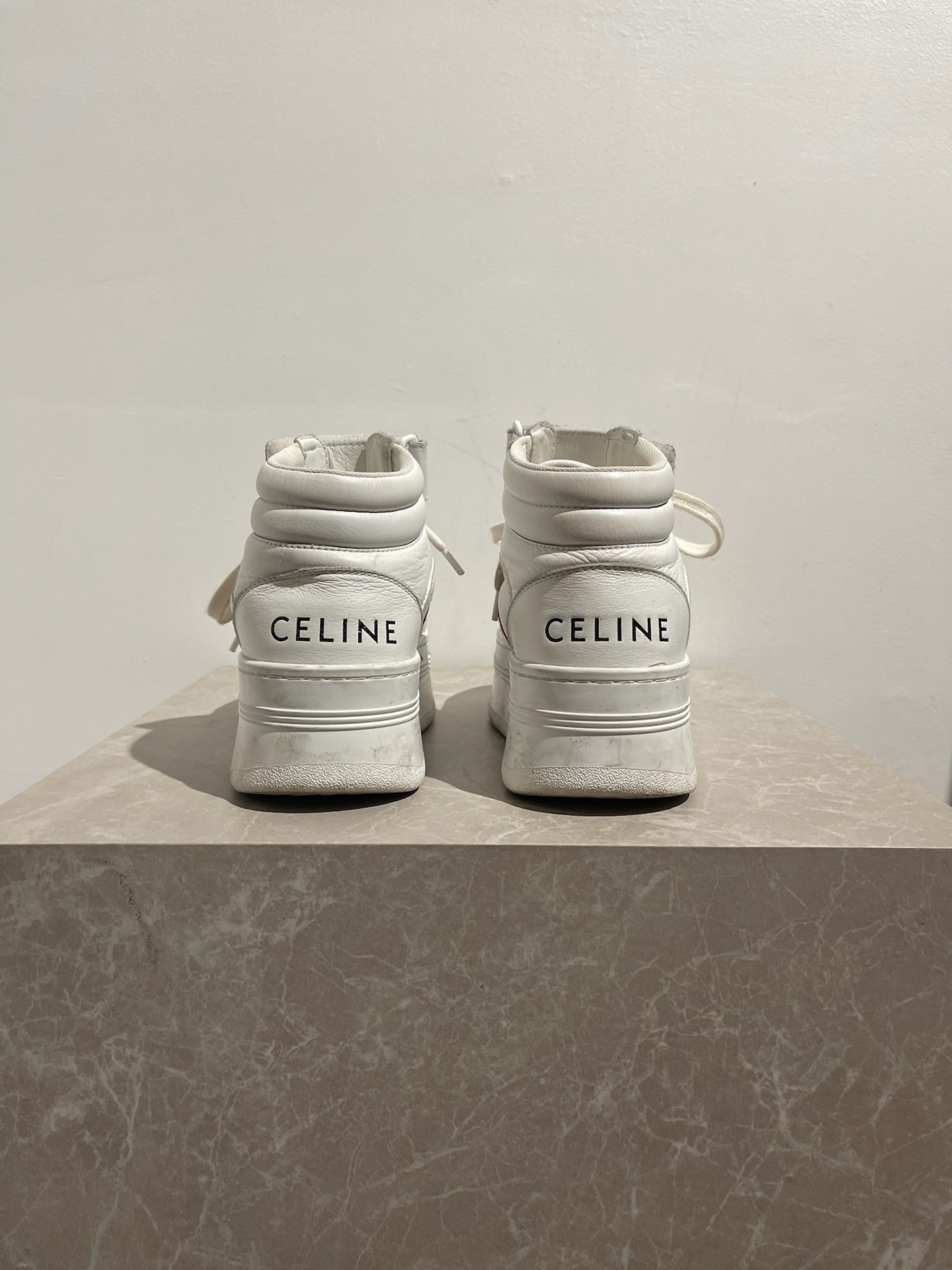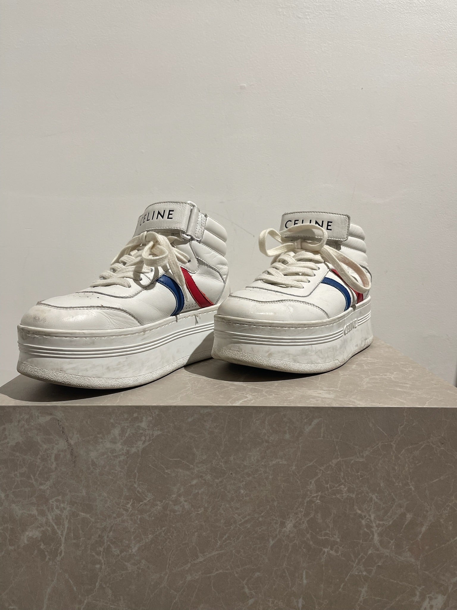 Baskets montantes en cuir blanc avec détails bleu et rouge, fermeture à lacets et scratch signé Celine. Semelle oversize en caoutchouc et logo "CELINE" apposé sur le côté et à l'arrière.