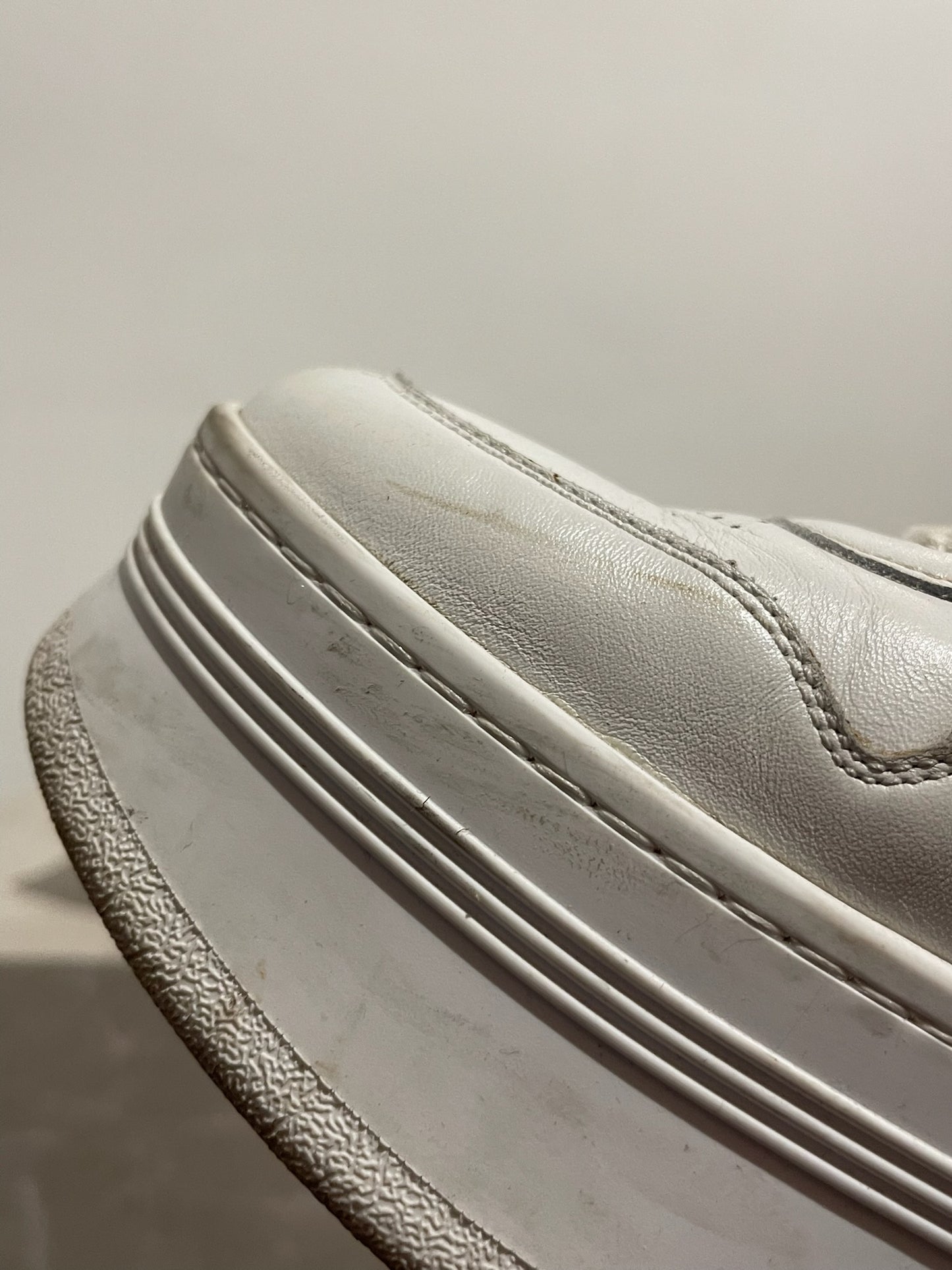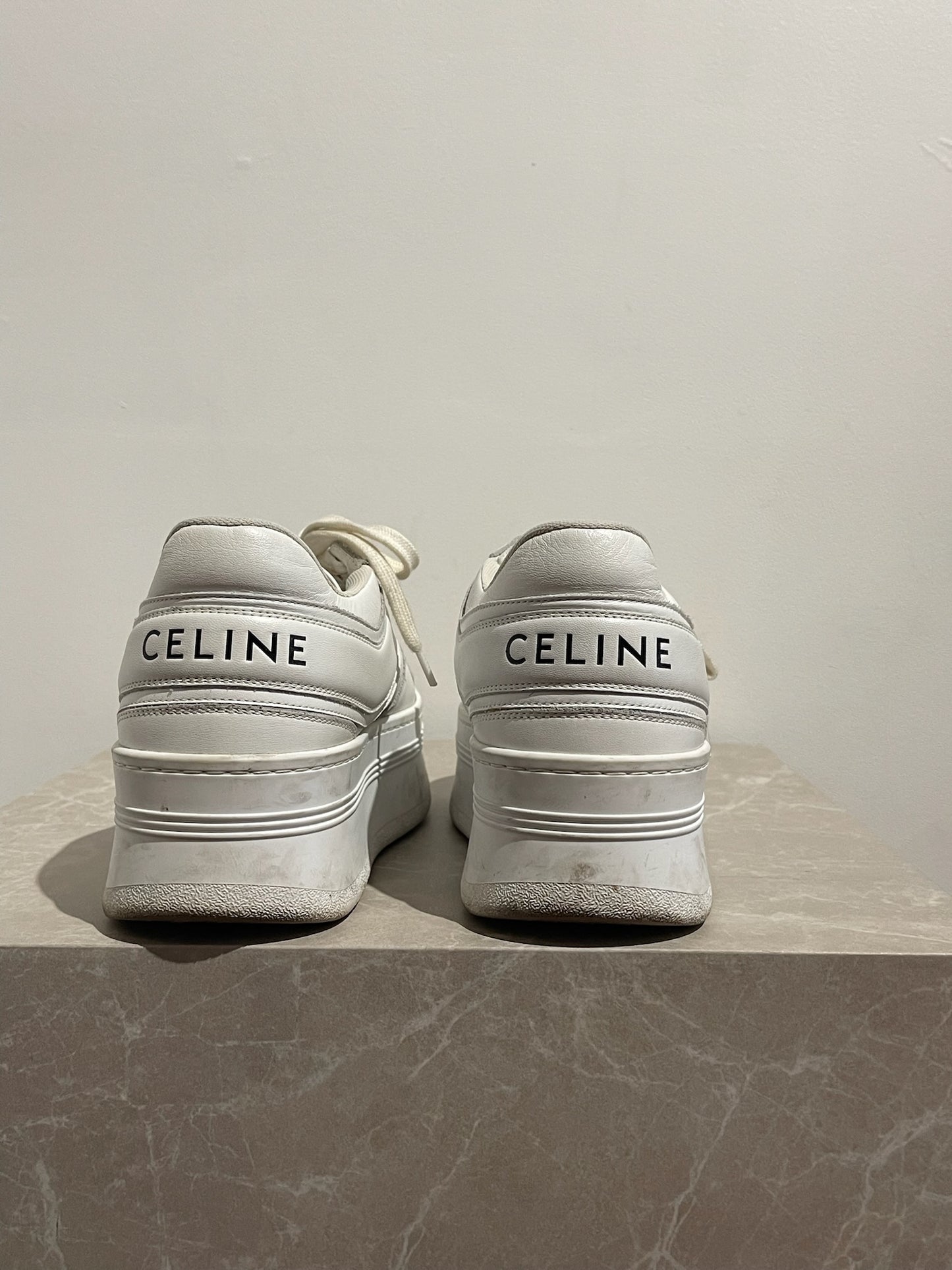 Baskets compensées en cuir blanc signé Céline sur la semelle et au dos de la basket. Fermeture à lacets.