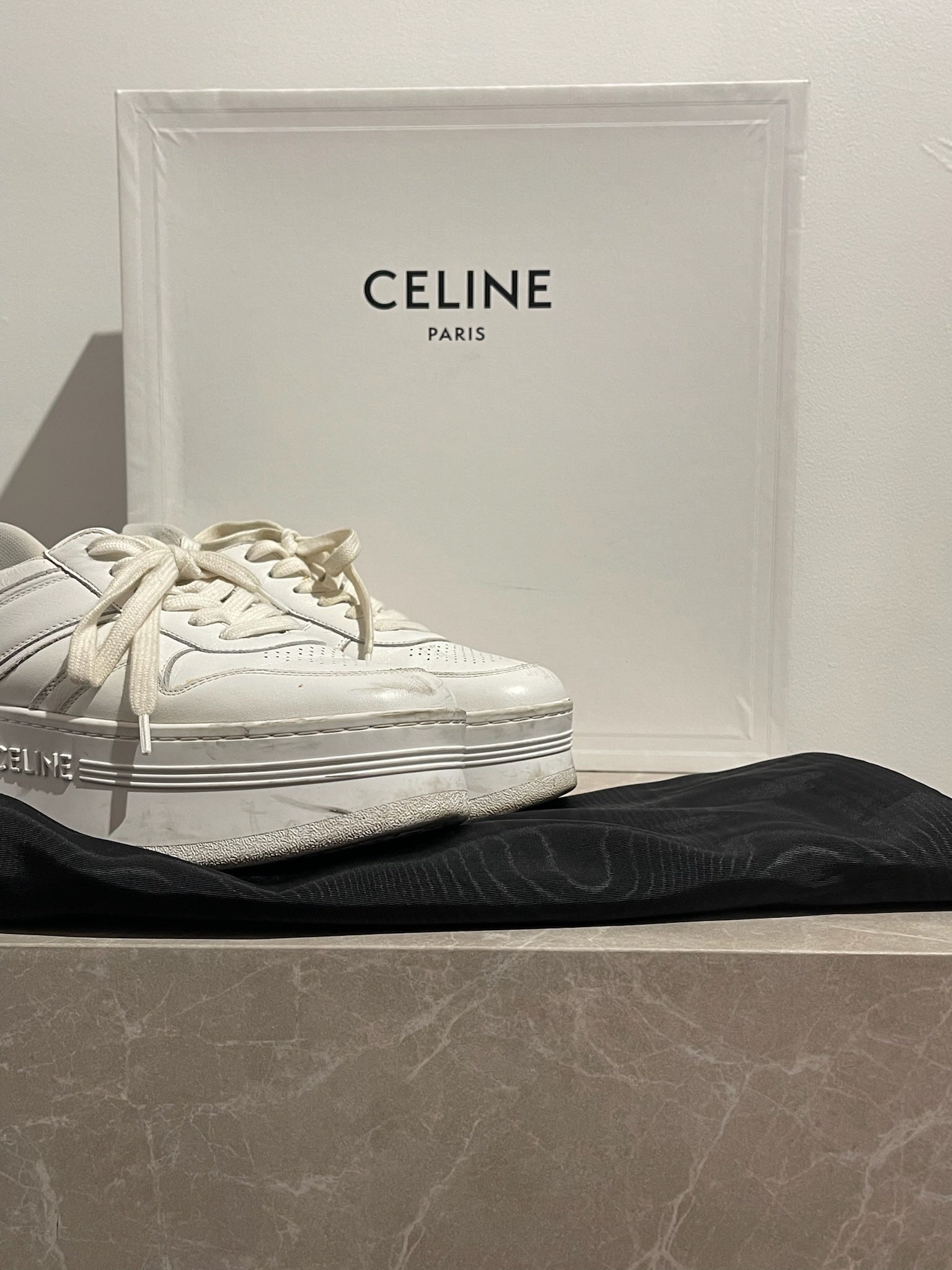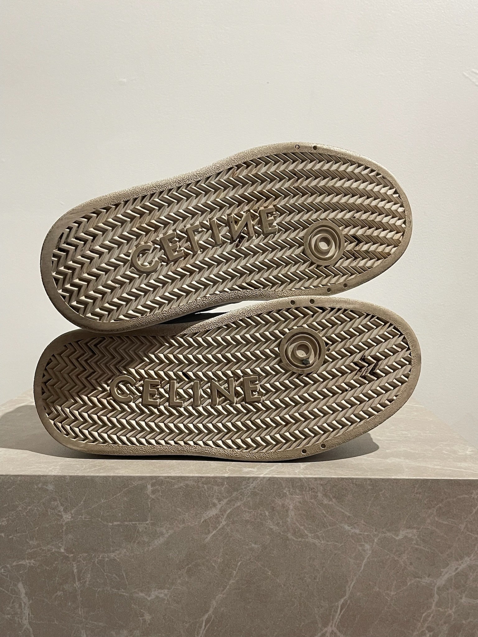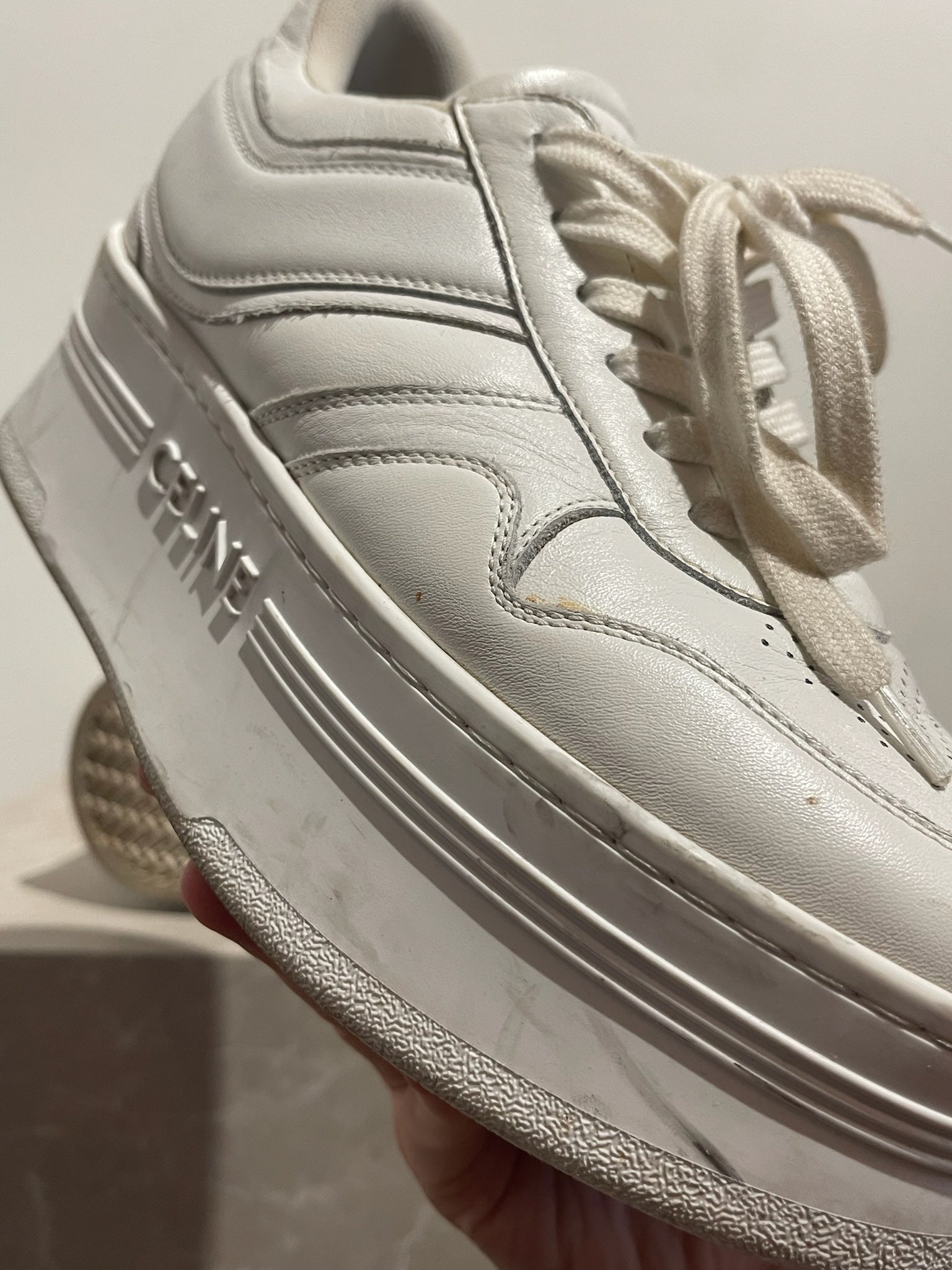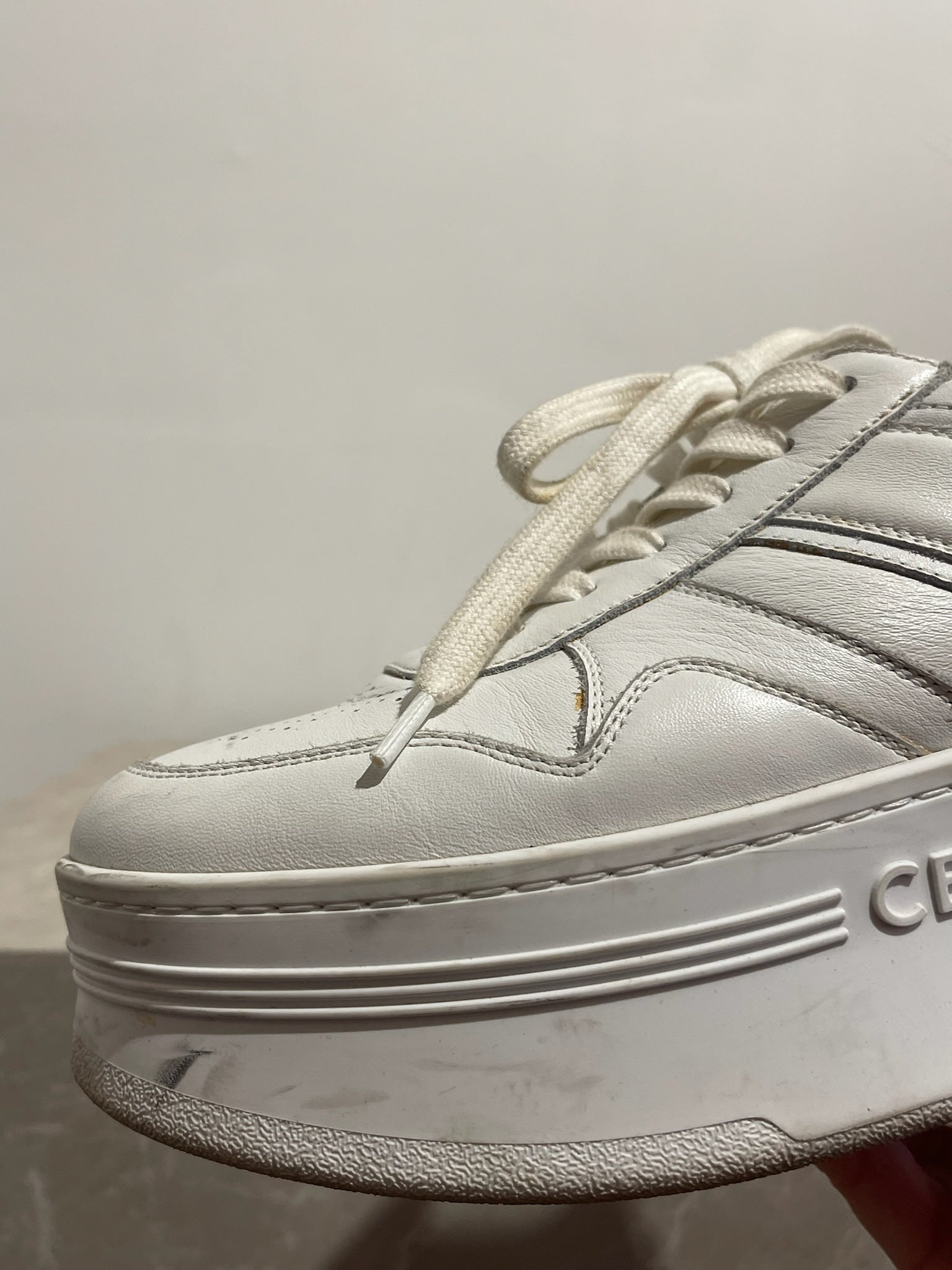 Baskets compensées en cuir blanc signé Céline sur la semelle et au dos de la basket. Fermeture à lacets.