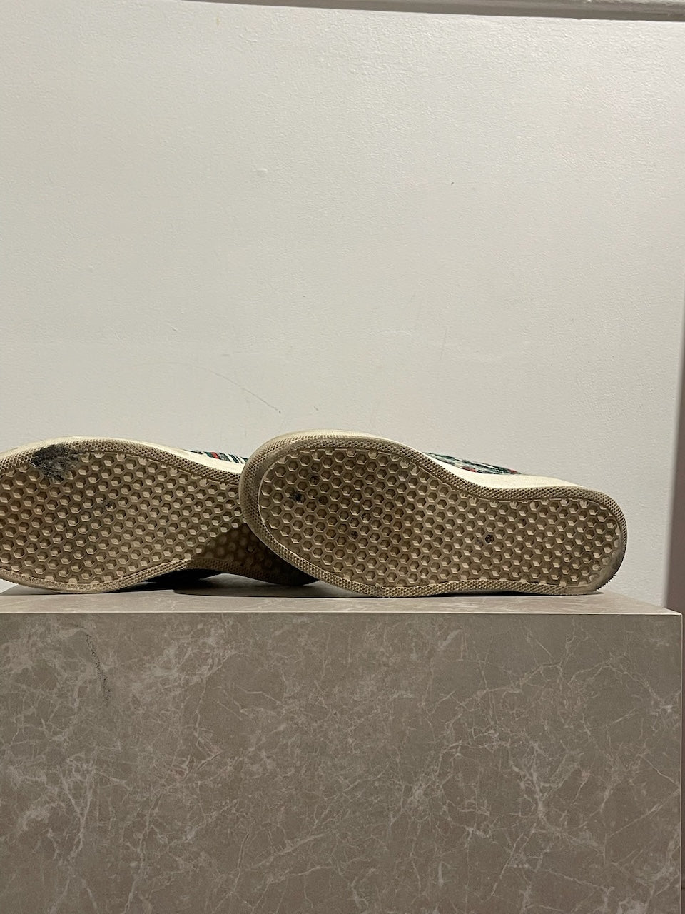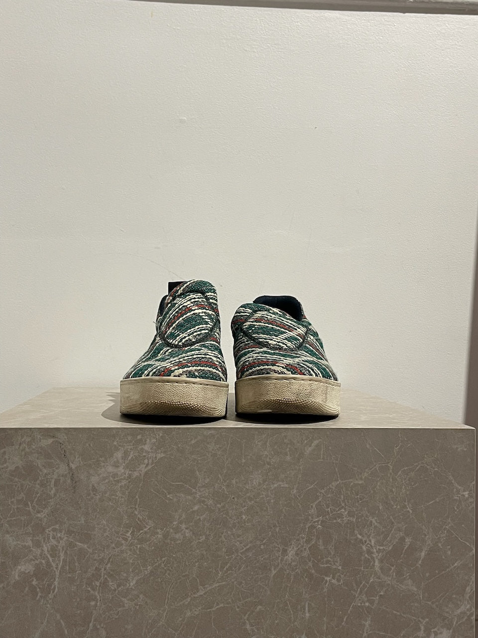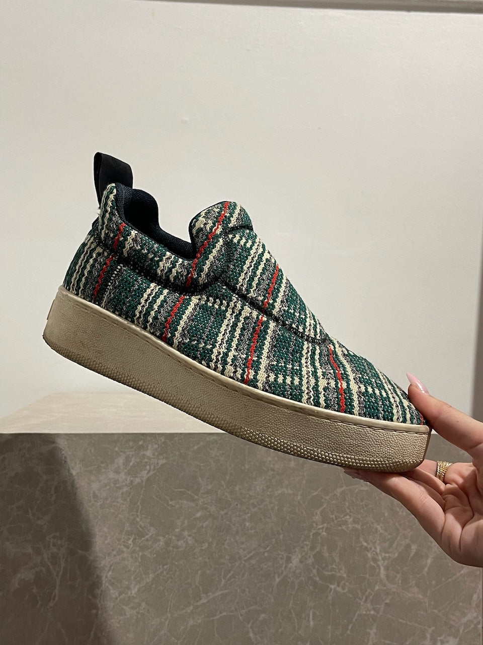 Baskets "pull-on" en tweed de laine vert, blanc et rouge. Semelle épaisses en caoutchouc blanc. Languette arrière "Love life". S'enfile simplement.