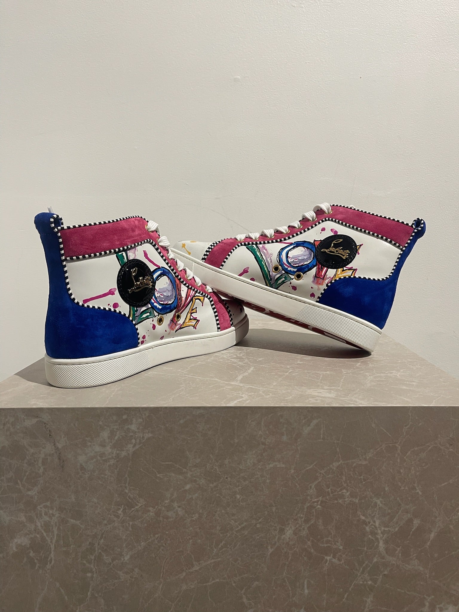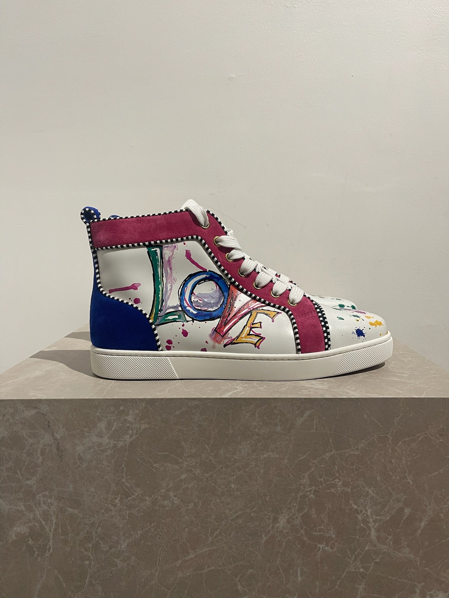 Basket montantes en cuir blanc avec motif Love coloré et têches de peinture. Détails en daim rose fushia, bleu et vert. Fermeture à lacets. Logo Louboutin sur écusson en cuir verni noir.