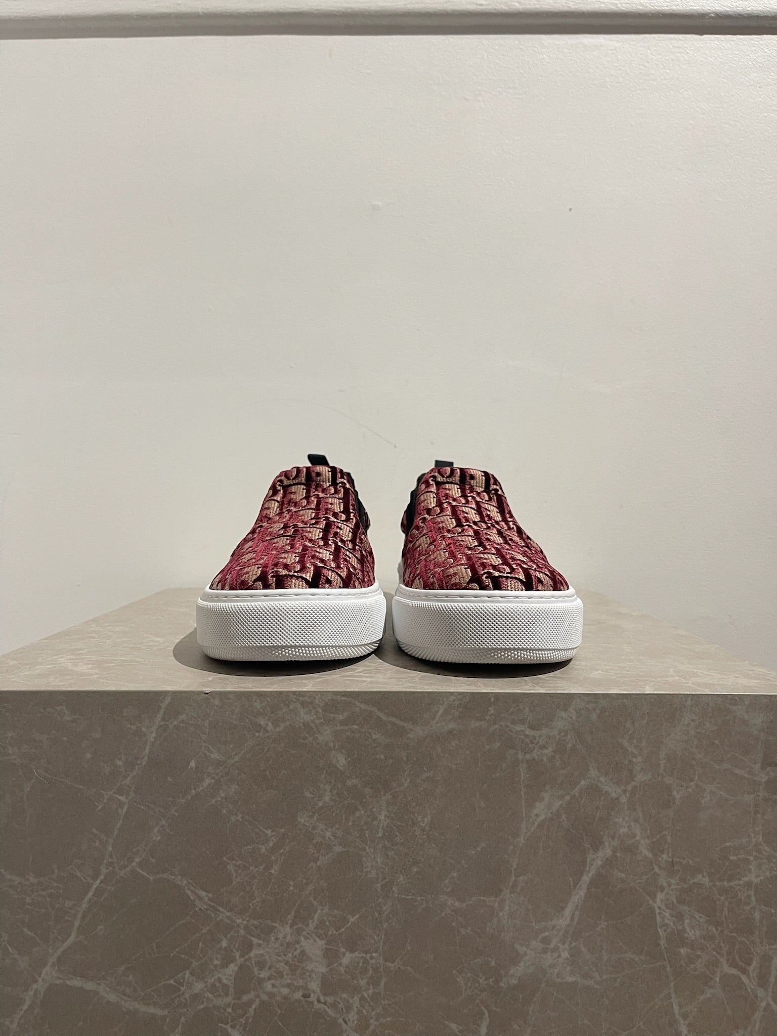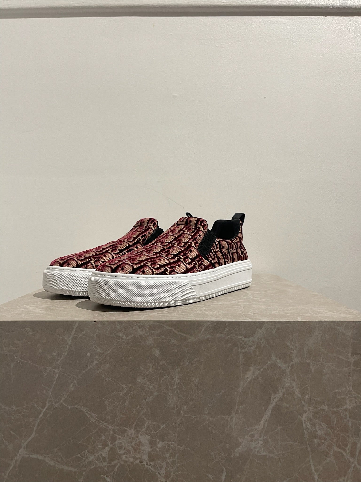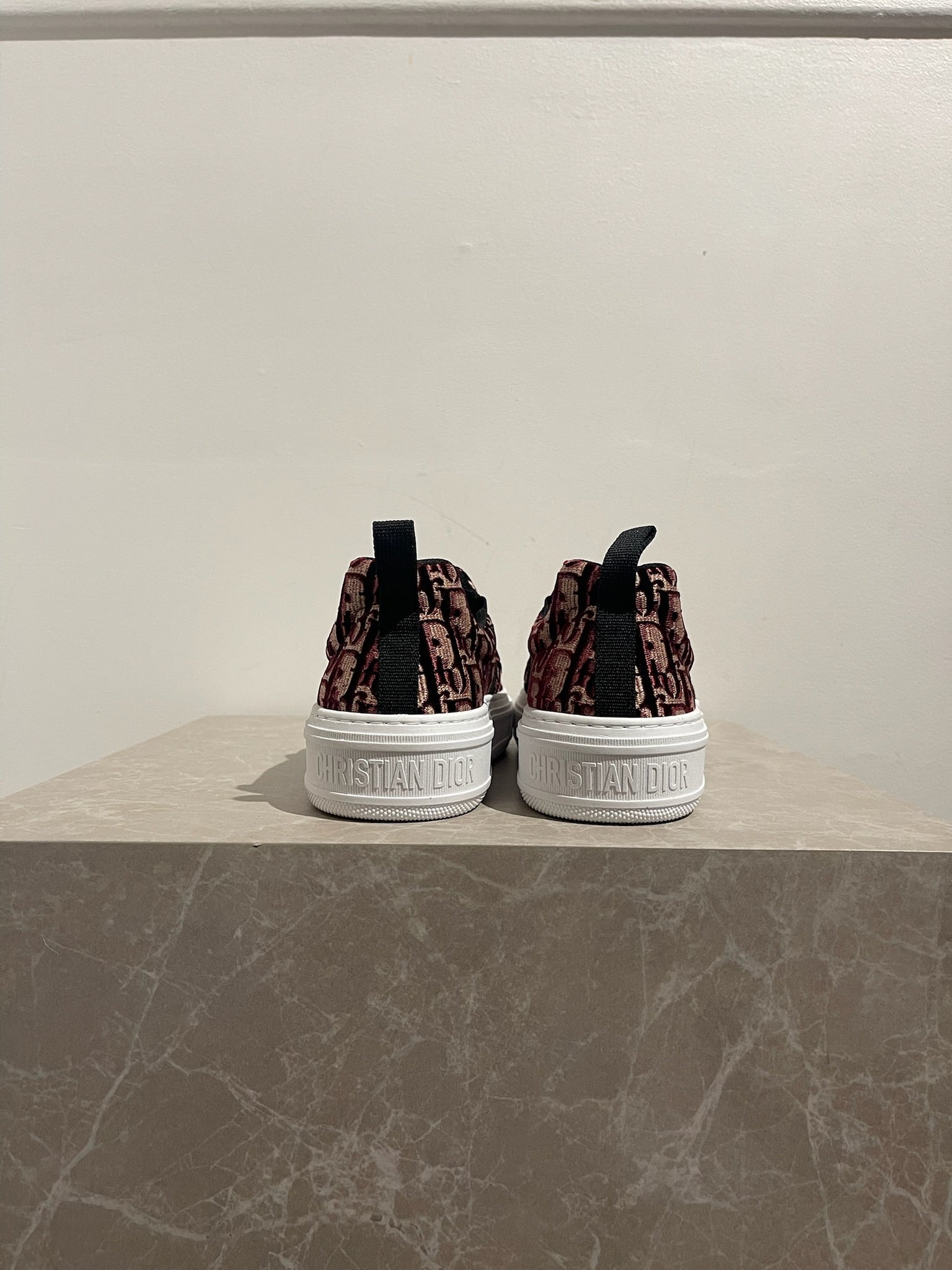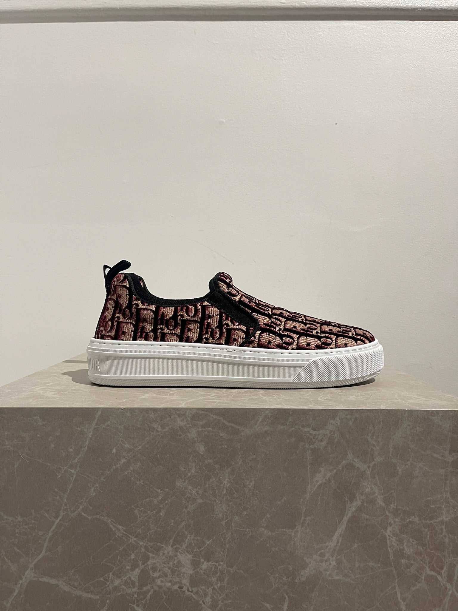 Baskets en toile et velours Dior Oblique bordeaux et noir avec semelle en gomme blanche signé Christian Dior à l'arrière. Facile à enfiler grâce à l'élastique à l'avant et la languette.