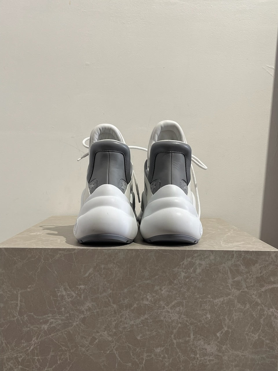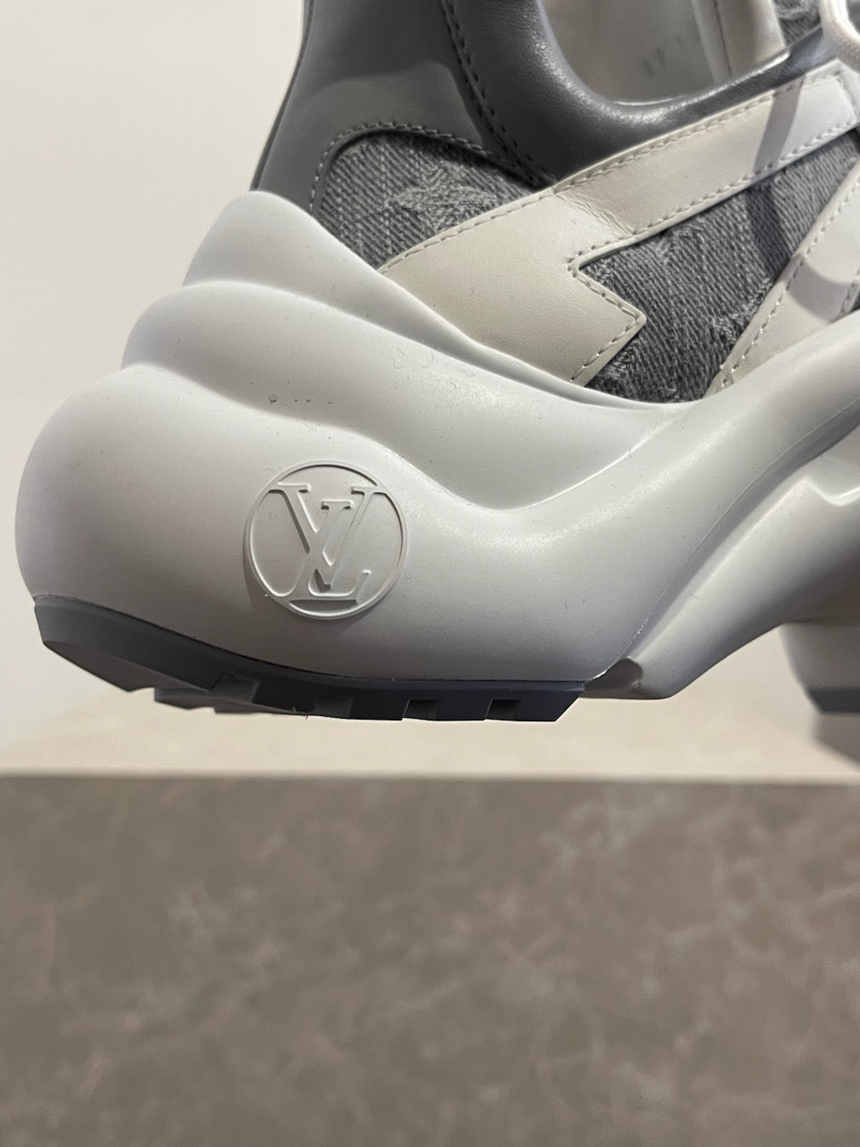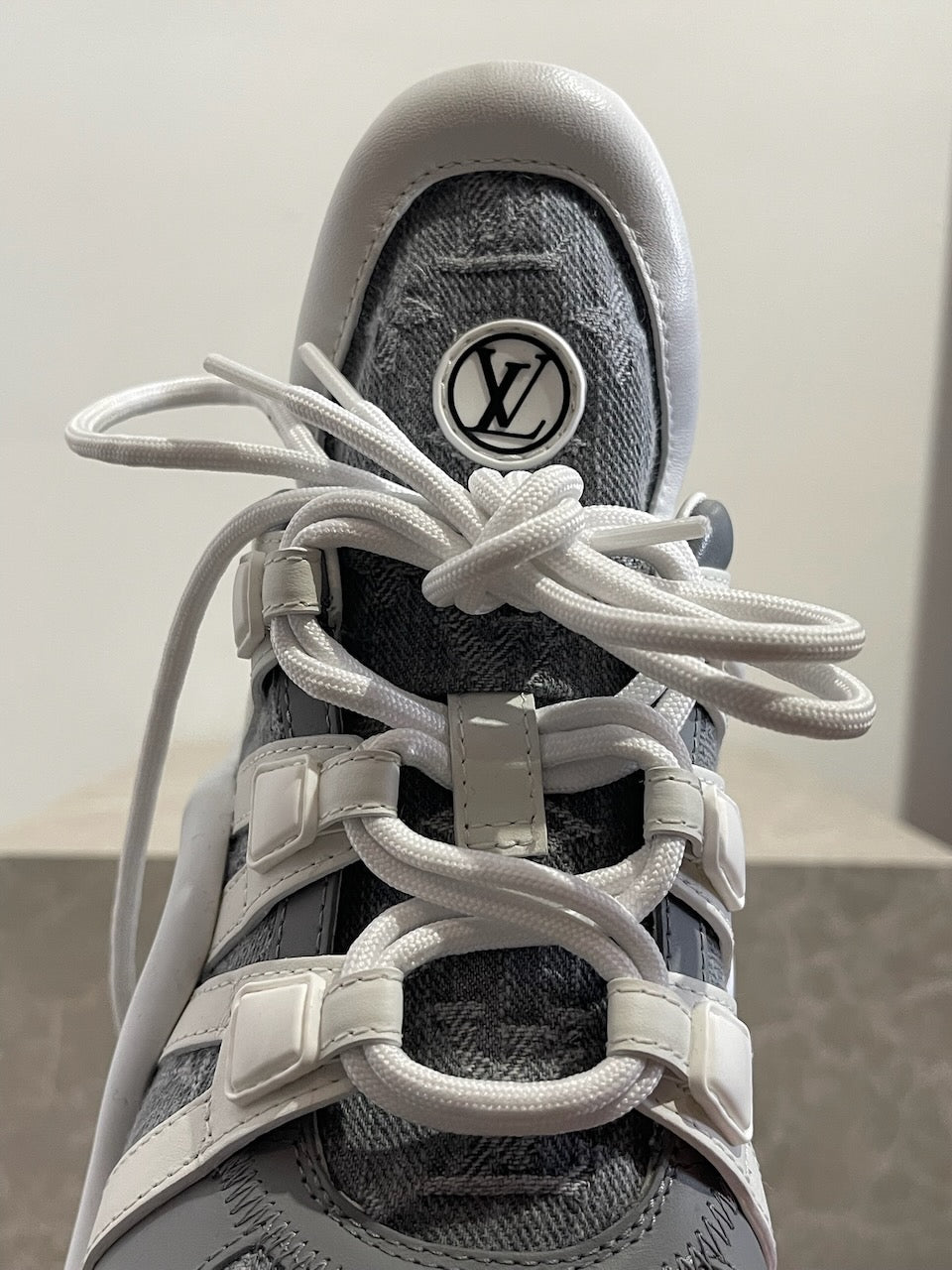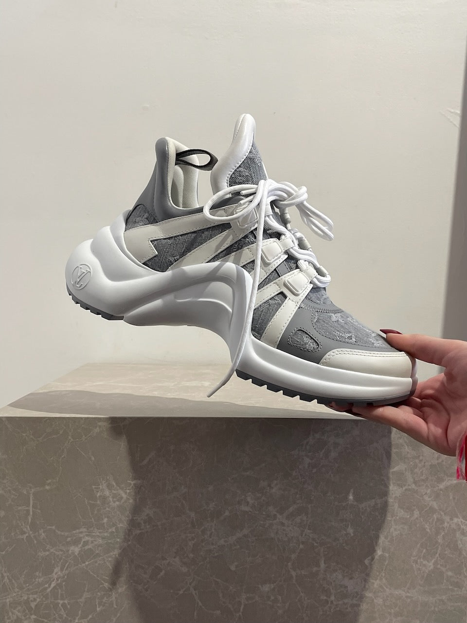Baskets Louis Vuitton, modèle Archlight en denim Monogram gris et blanc.