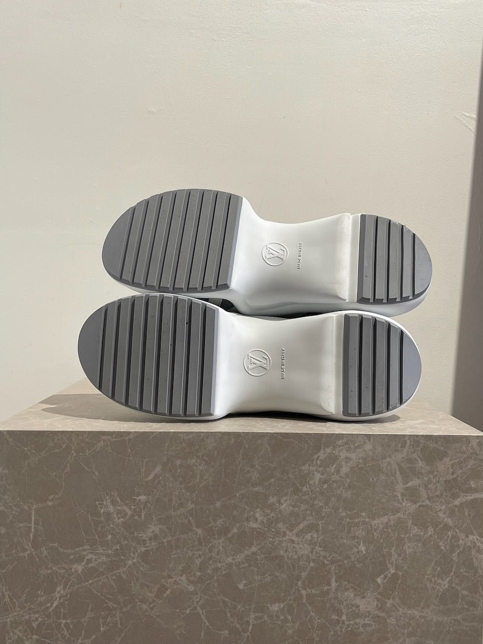 Modèle emblématique de la maison Louis Vuitton, sneaker à l'allure futuriste associant semelle ergonomique et découpes fémininines. Toile Monogram vernie et matières techniques. Semelle oversize en gomme (5 cm).