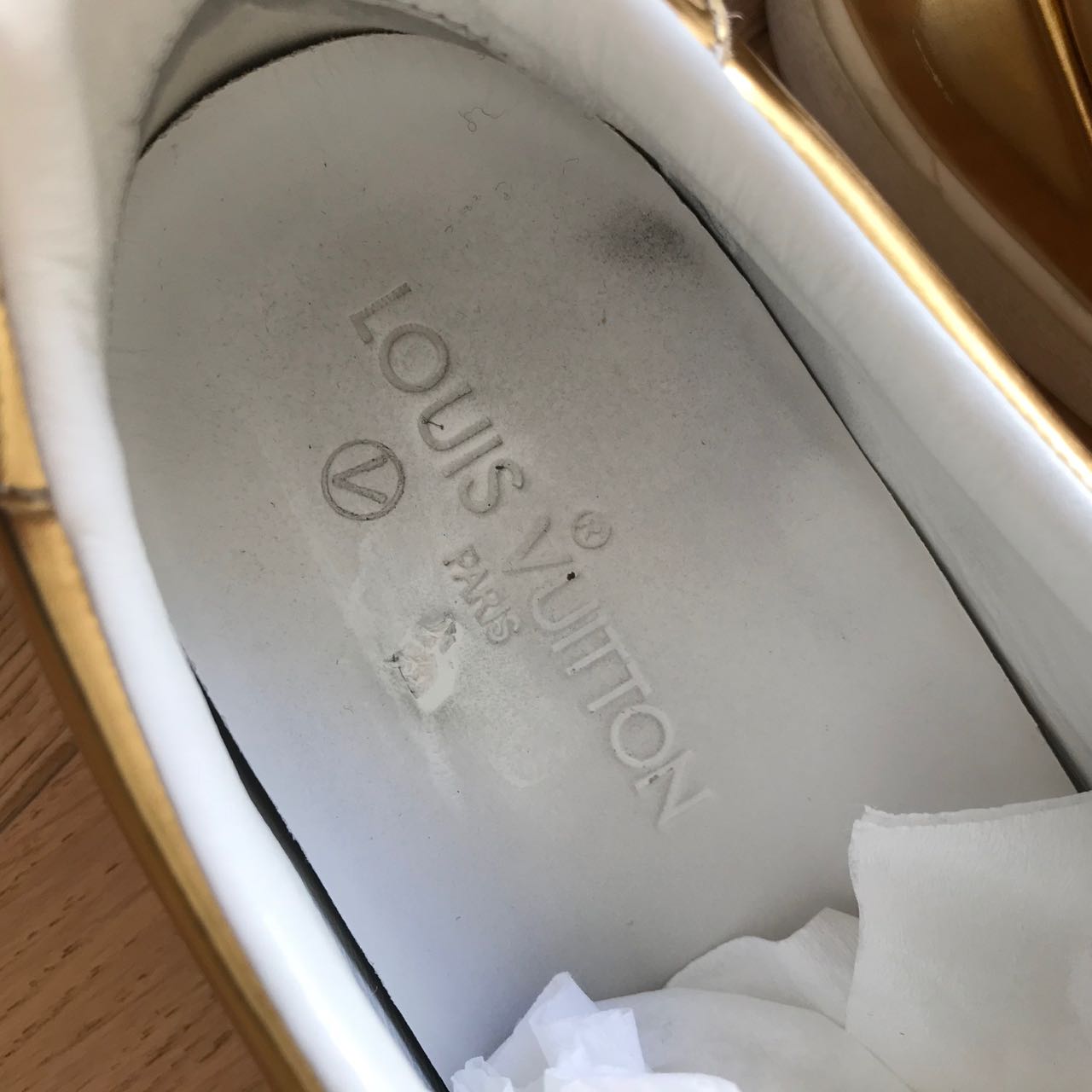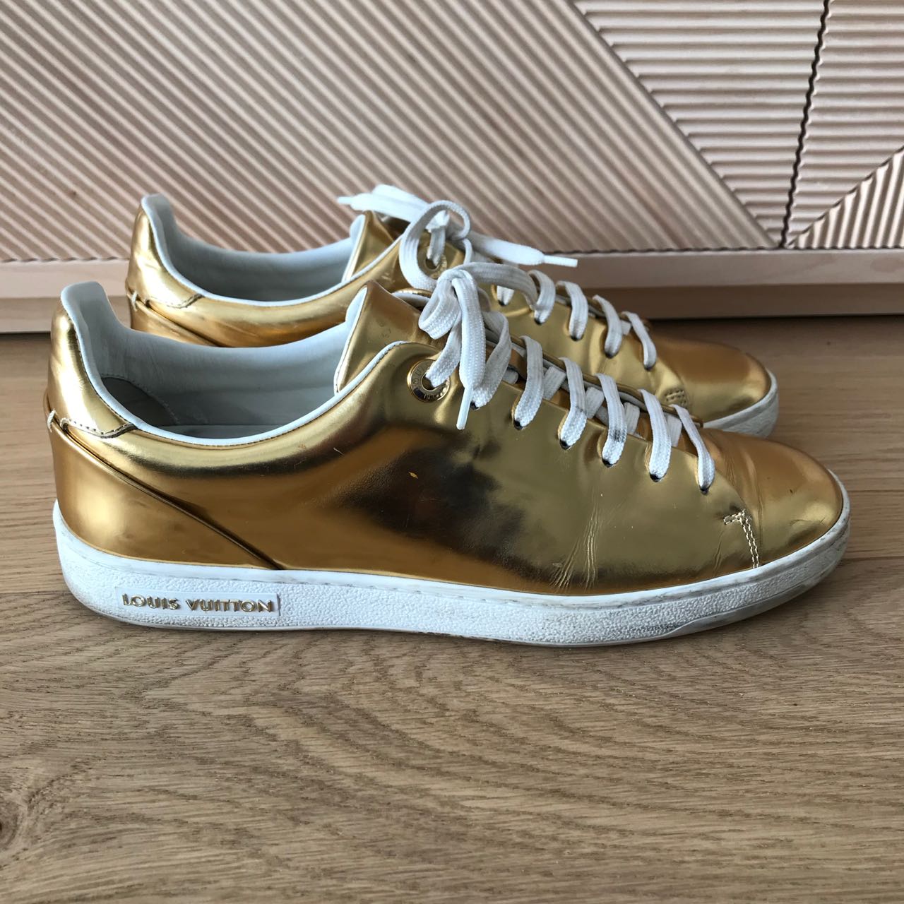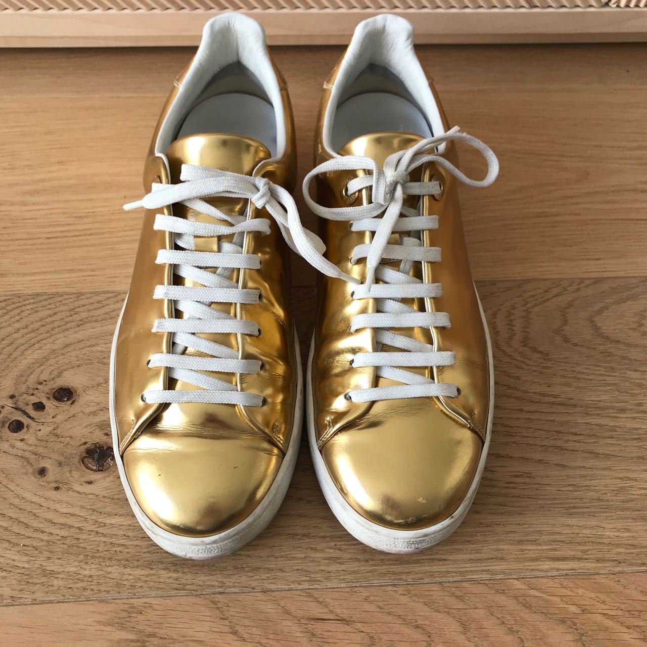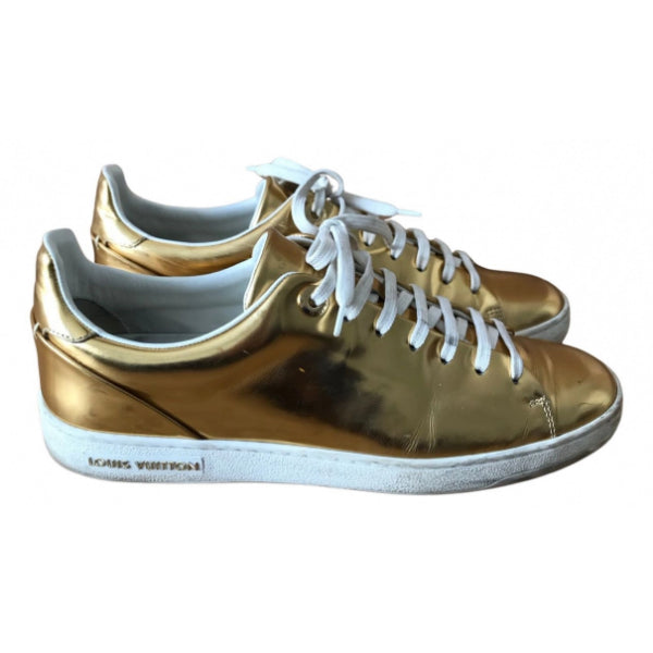 Baskets à lacets en cuir miroir doré. Inscription Louis Vuitton sur la semelle.
