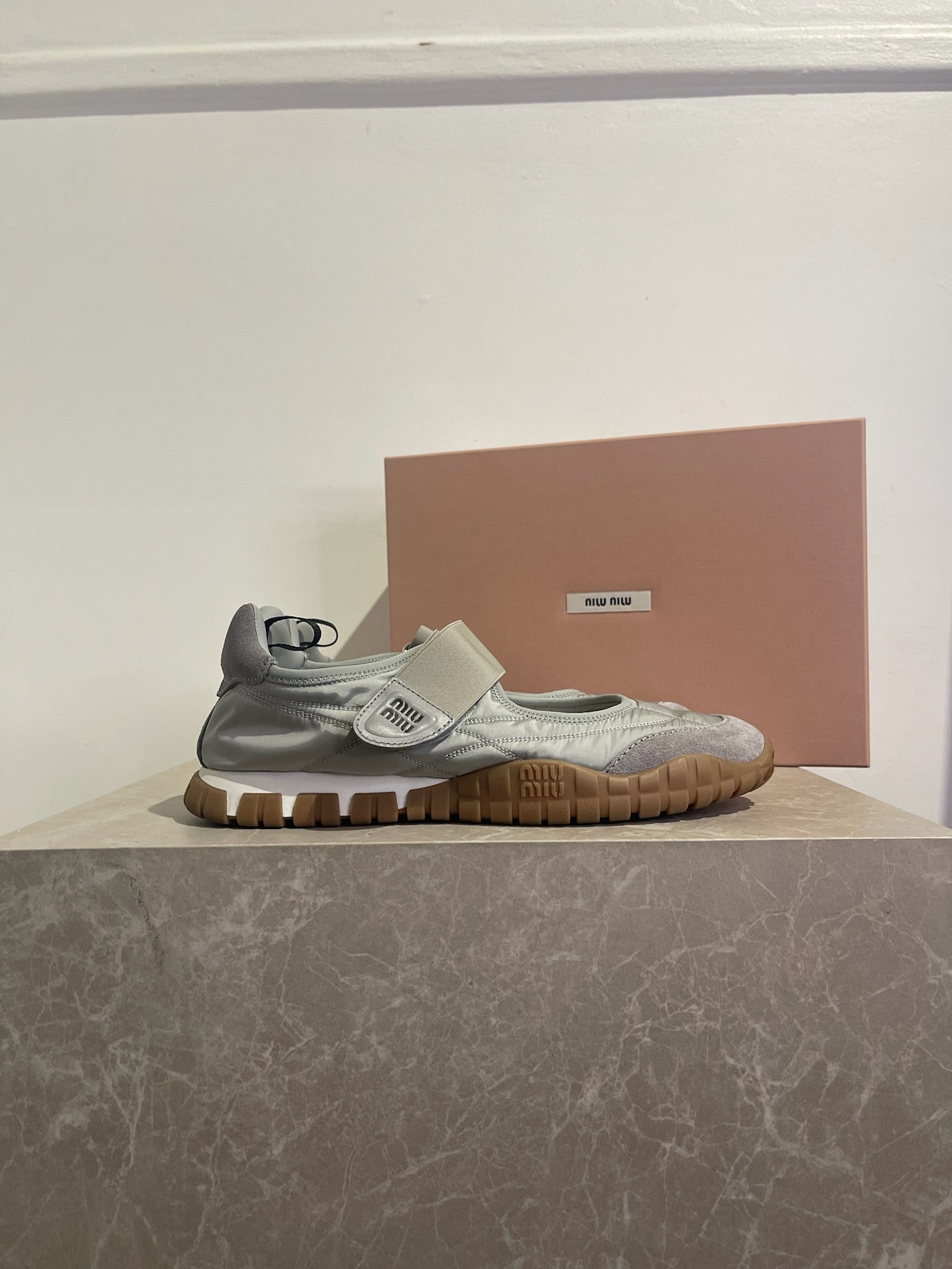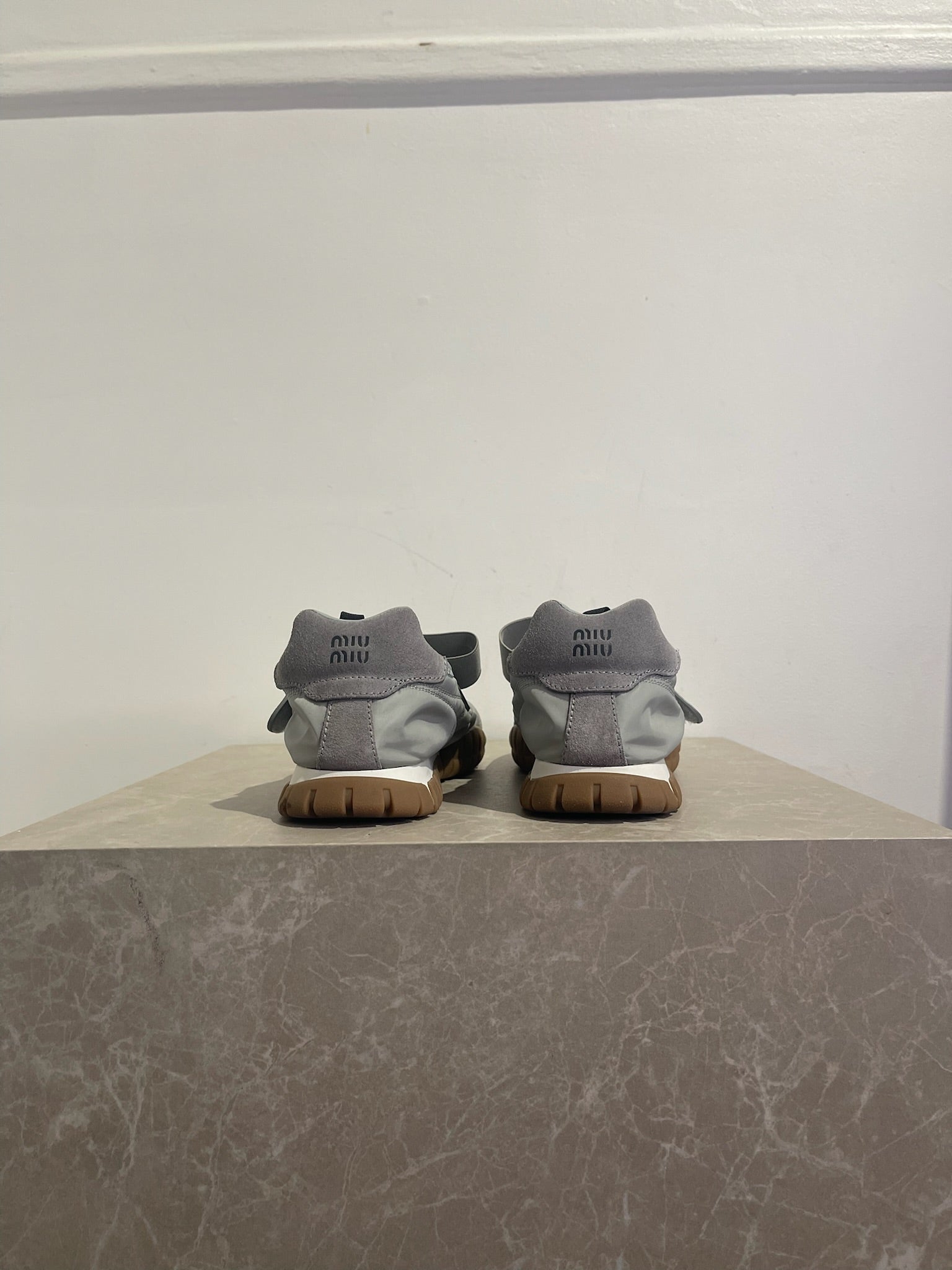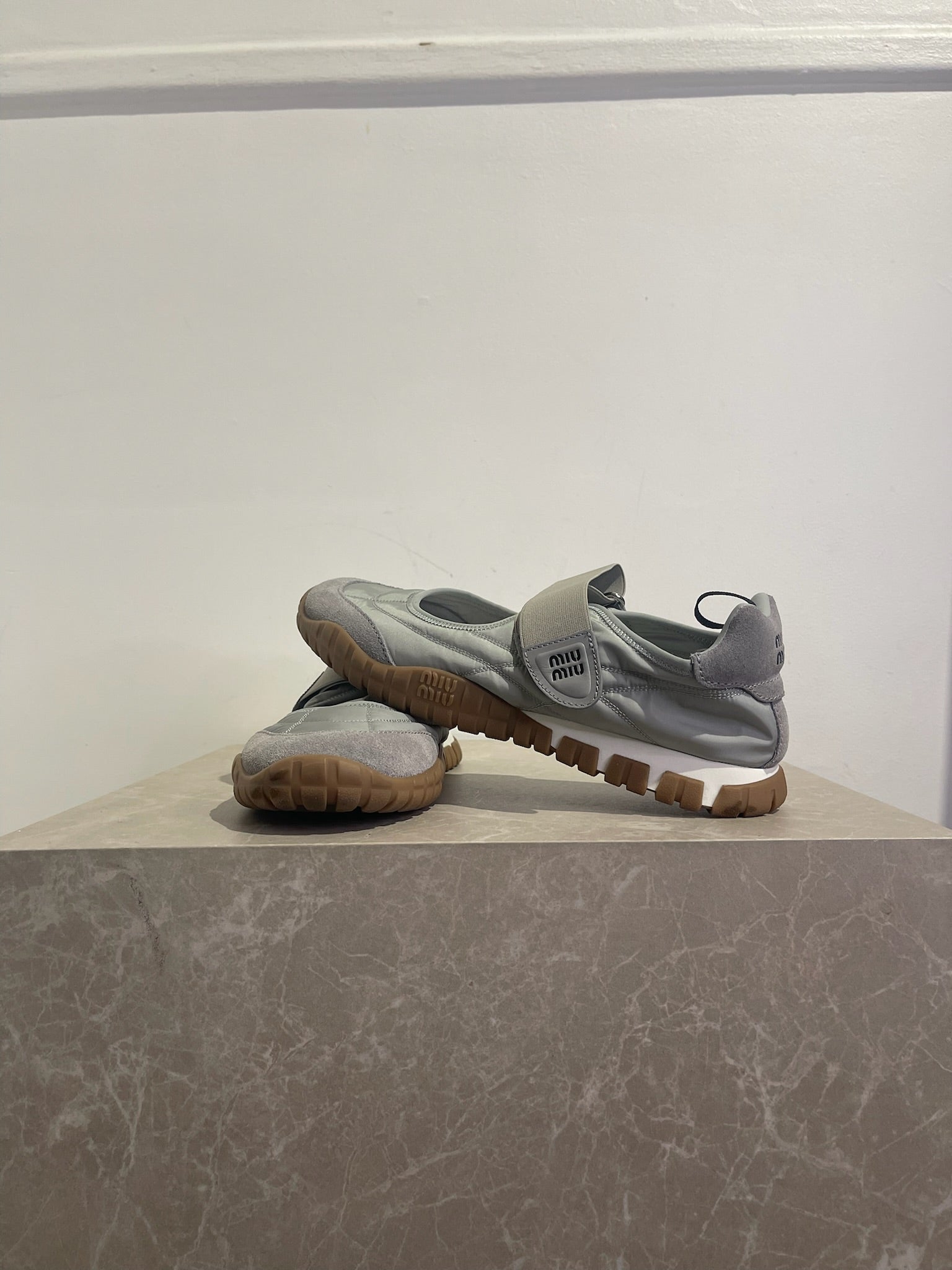 Baskets basses en tissu technique et veau velours gris avec brides scratch. Semelles en gomme dynamique marron. Logo Miu Miu inscrit sur le scratch.
