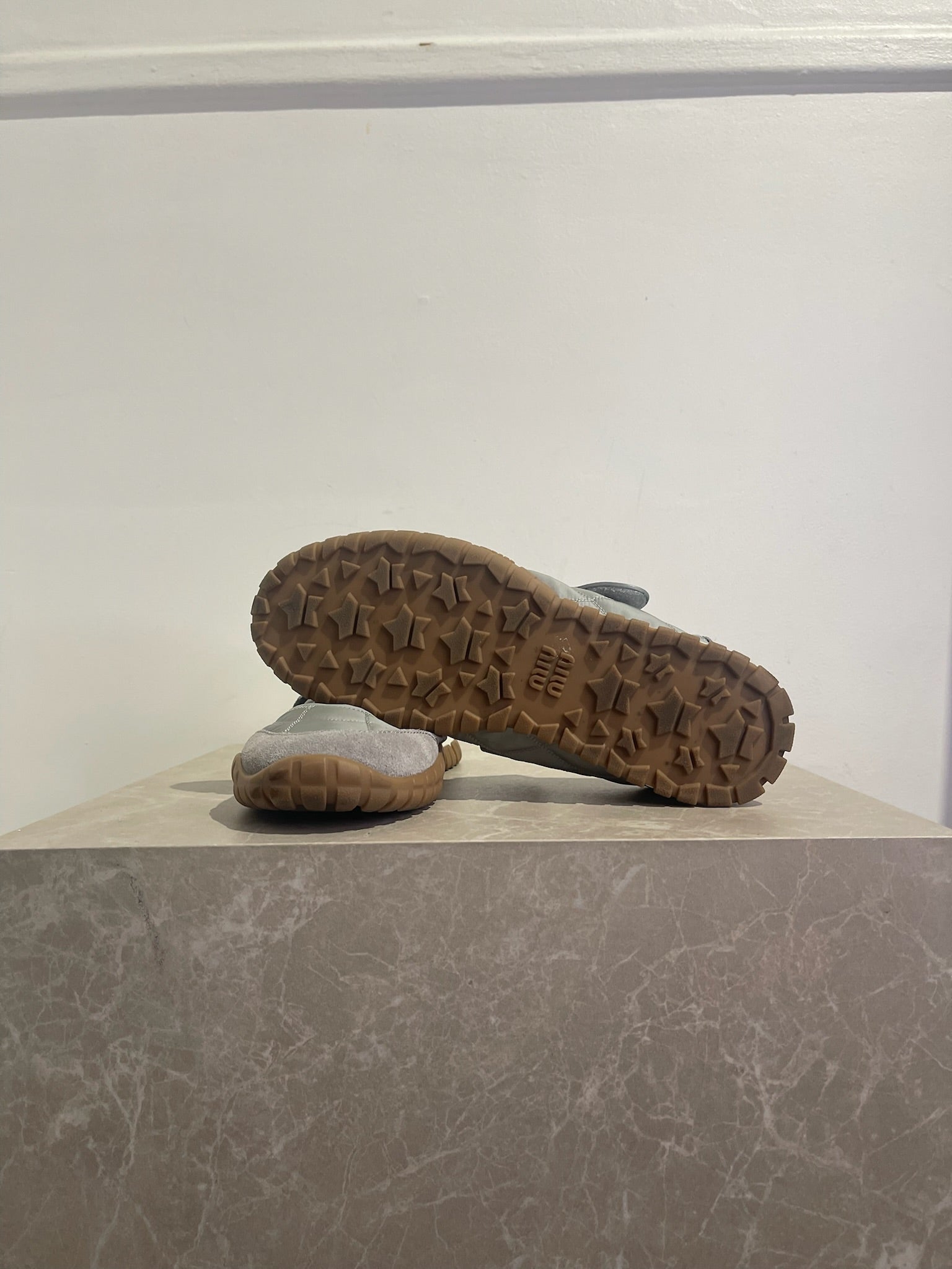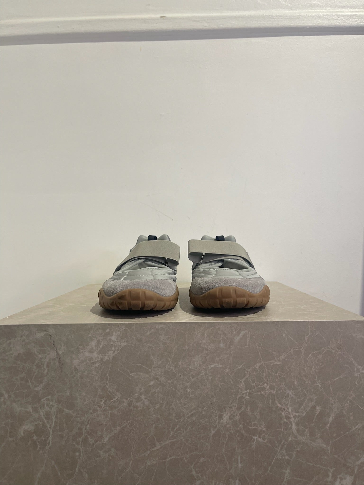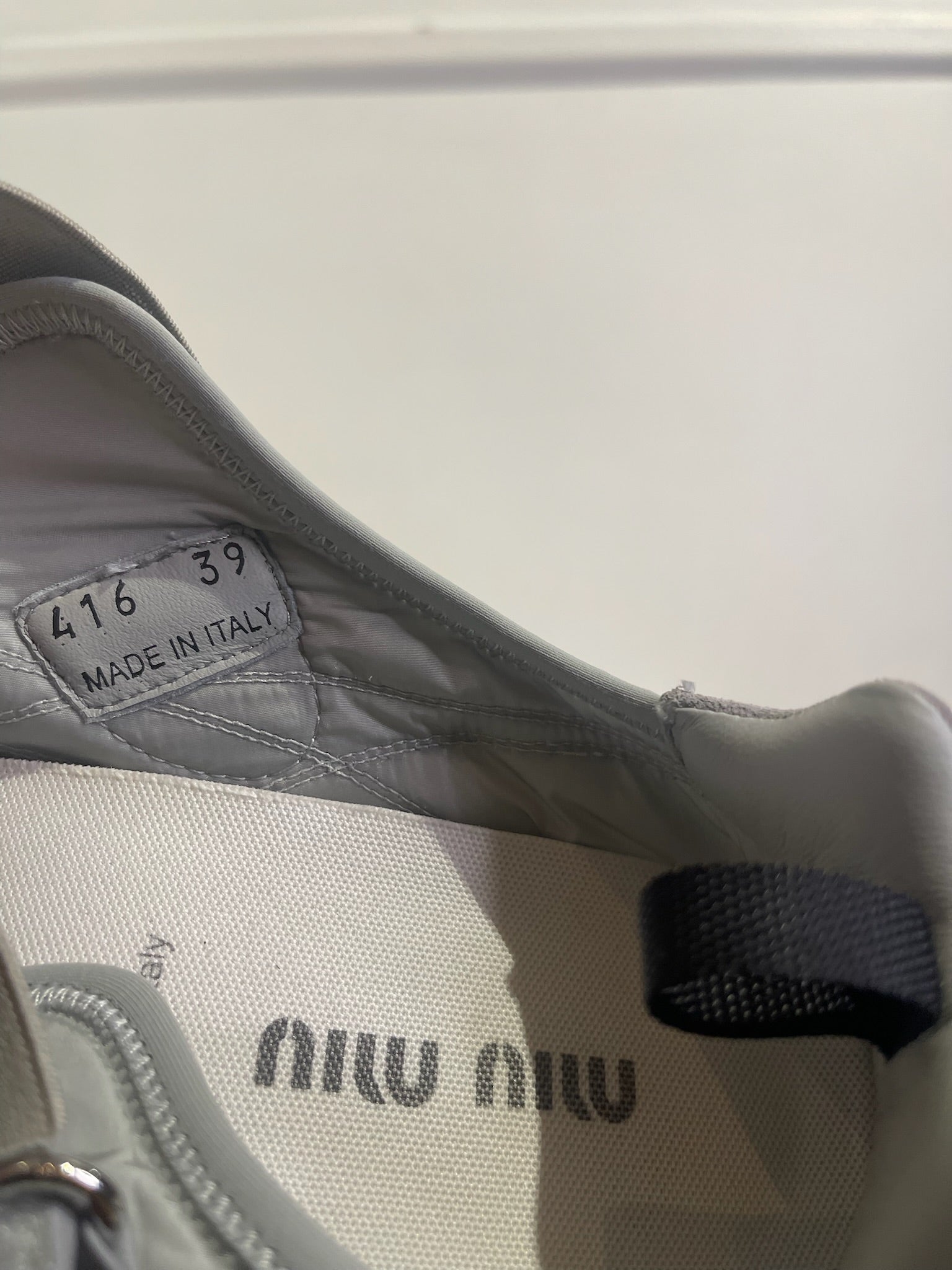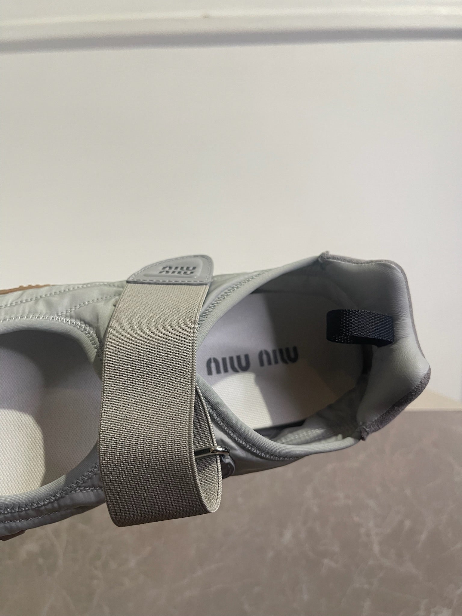 Baskets basses en tissu technique et veau velours gris avec brides scratch. Semelles en gomme dynamique marron. Logo Miu Miu inscrit sur le scratch.