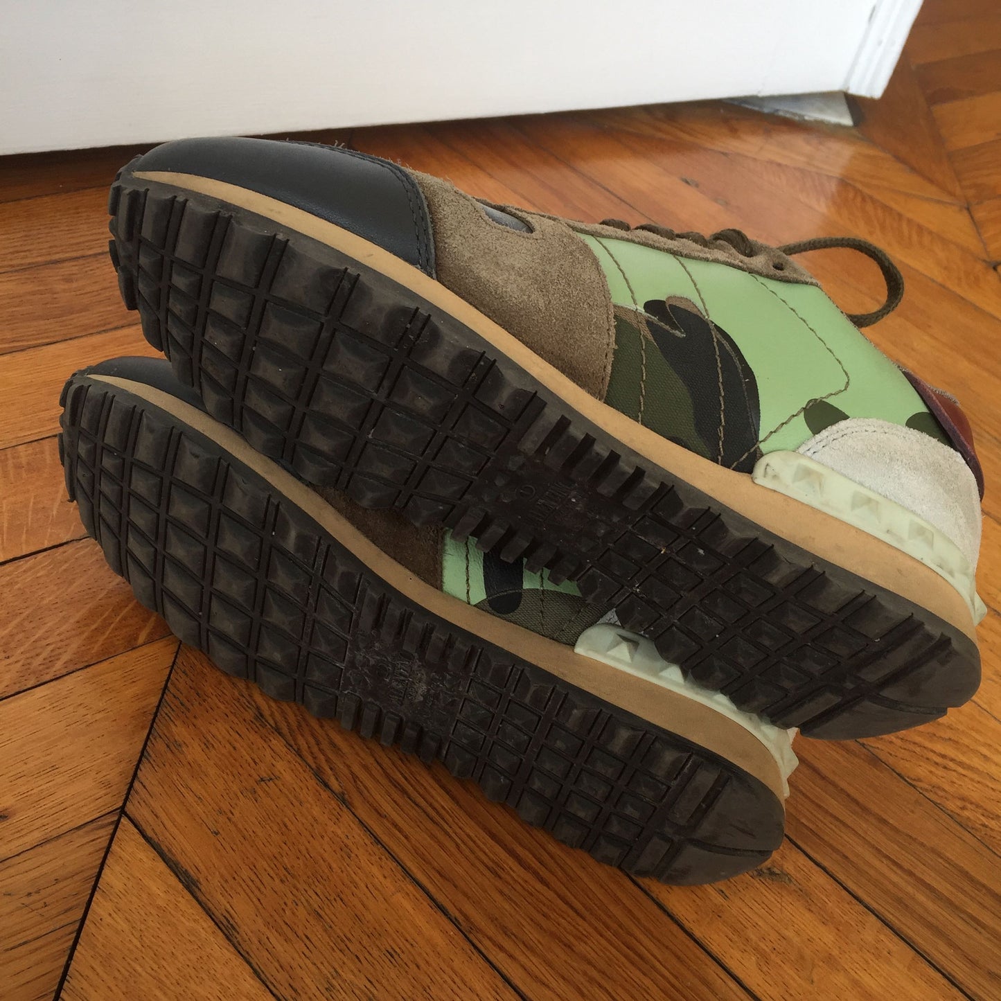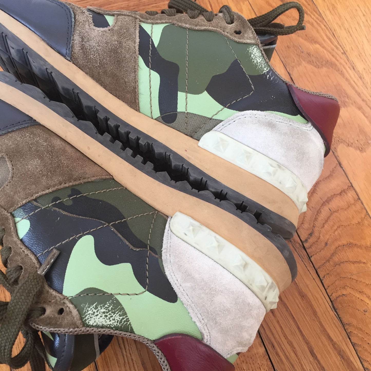 Baskets à lacets en cuir et daim imprimé camouflage kaki.