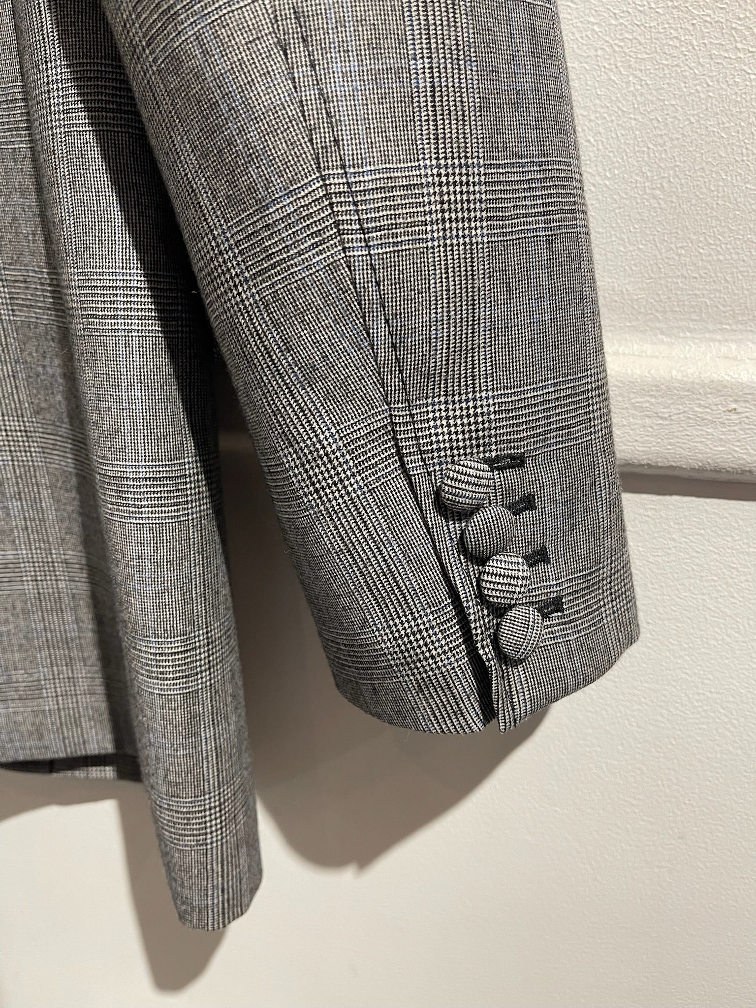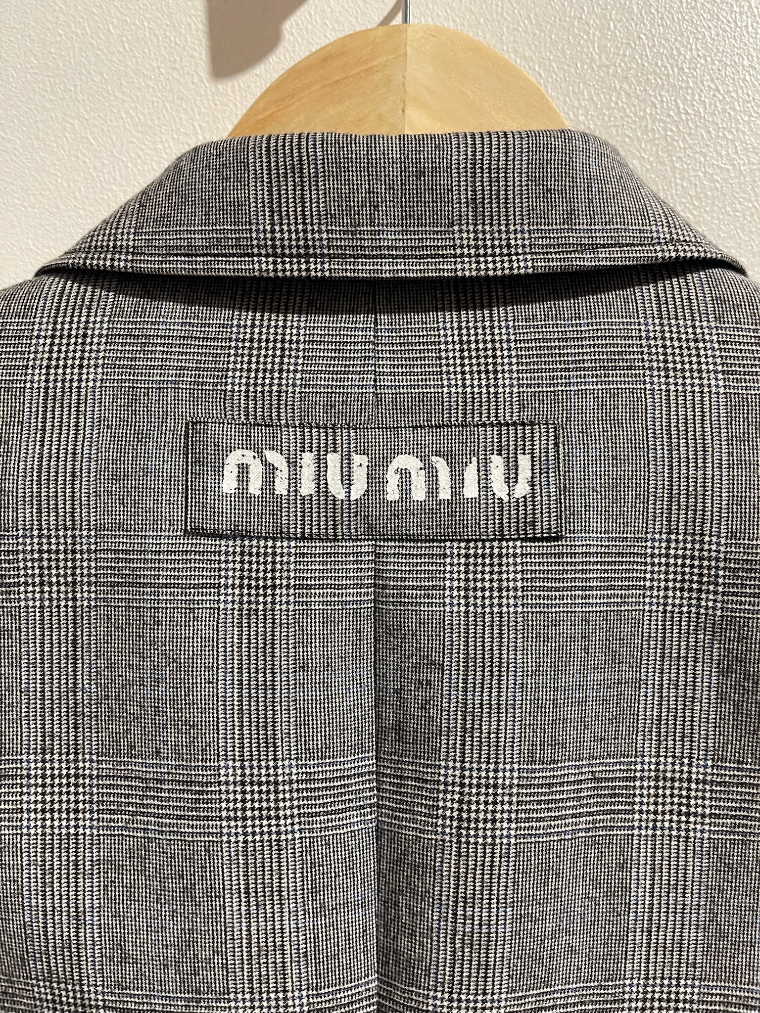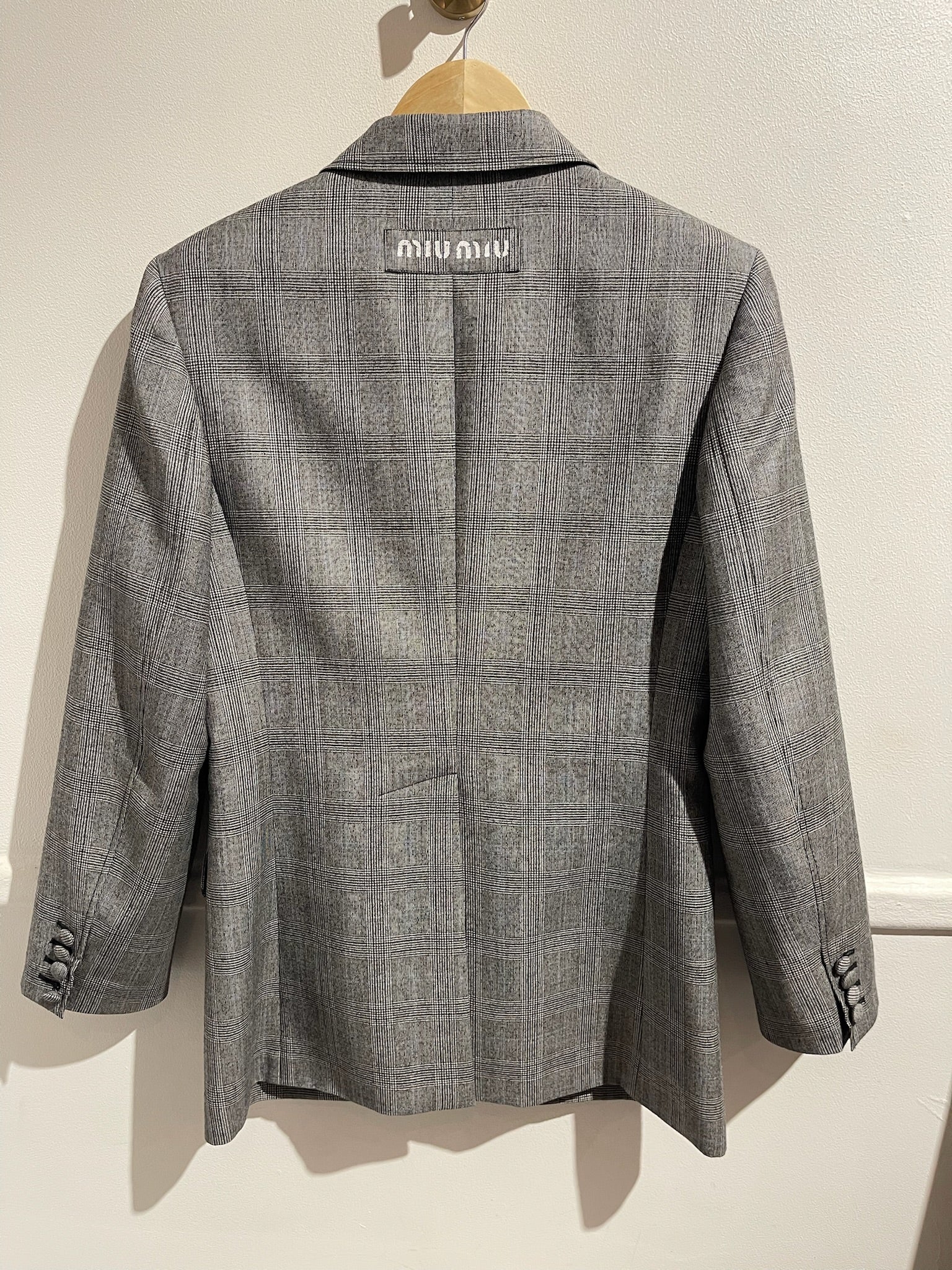 Blazer en viscose gris à carreaux. Fermeture à boutons. Poches latérales à rabat et poche poitrine. Inscription Miu Miu au dos.