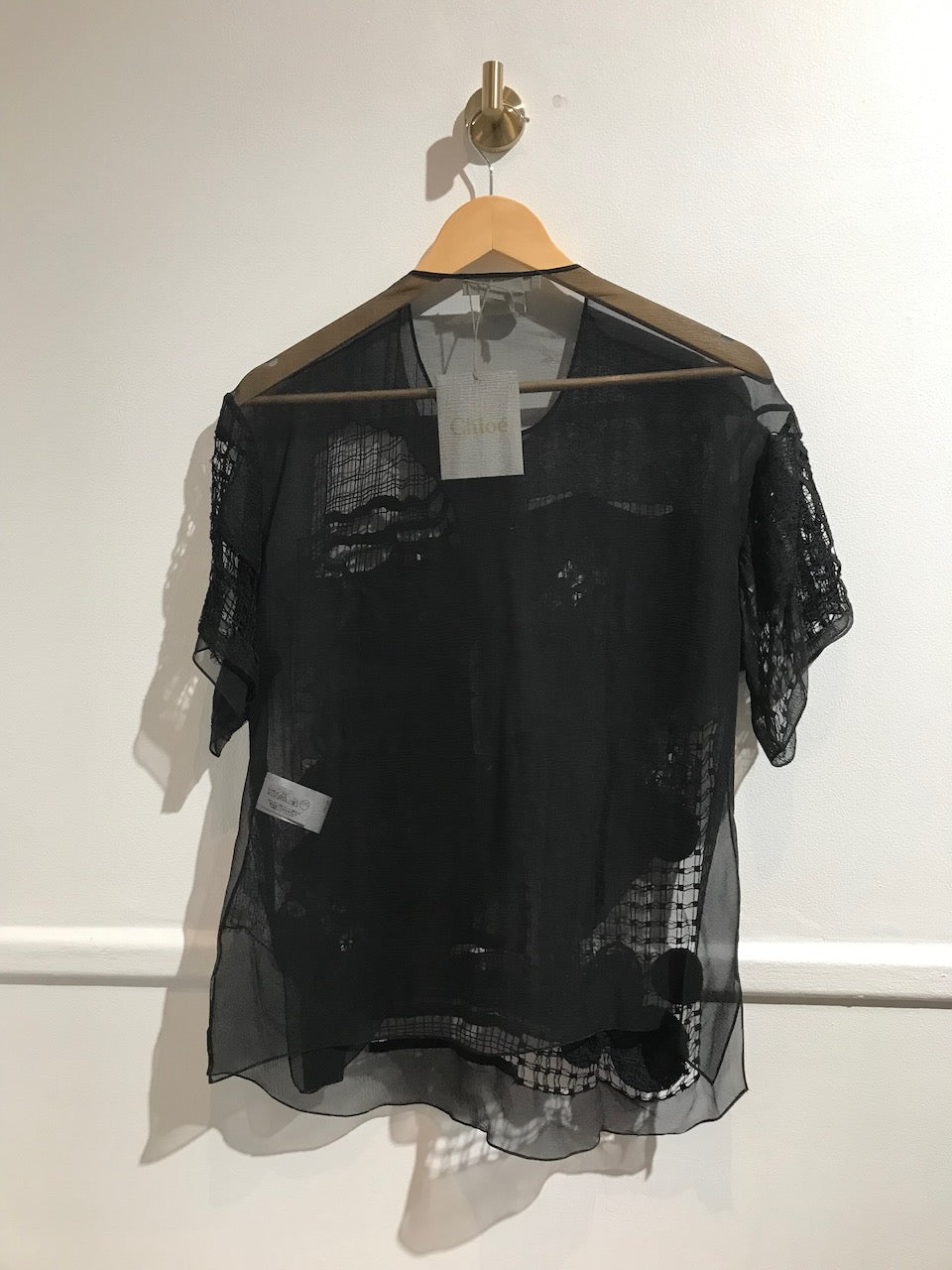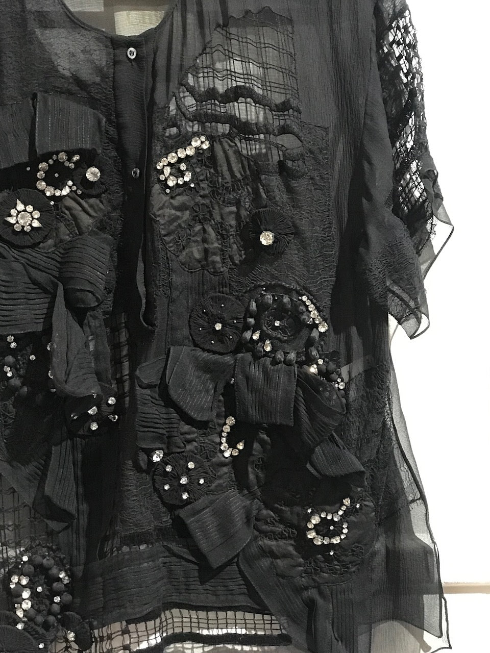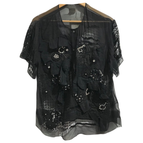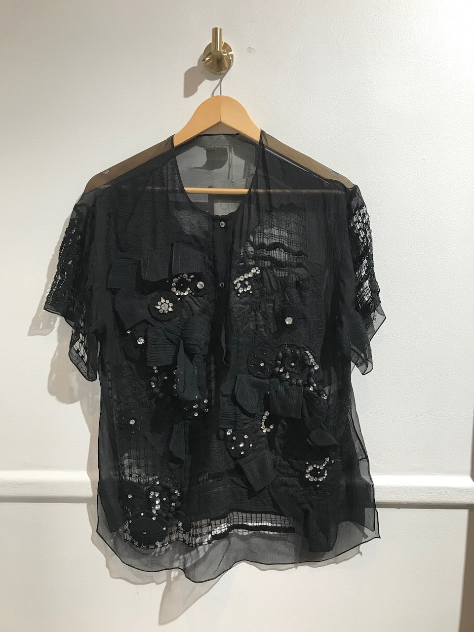 Blouse en organza de soie noire avec détails broderies et strass. 100% soie.