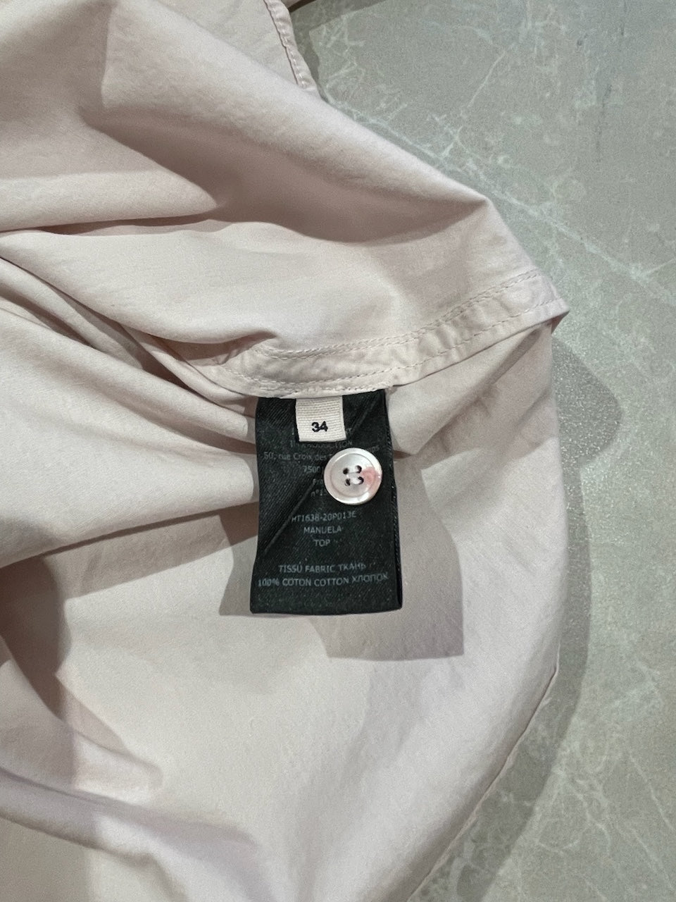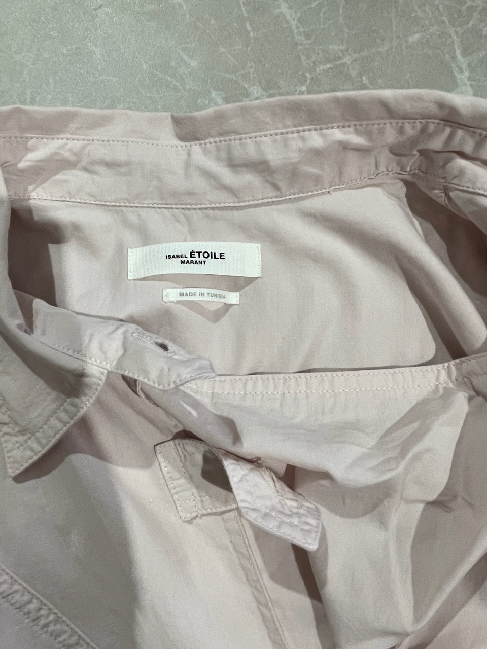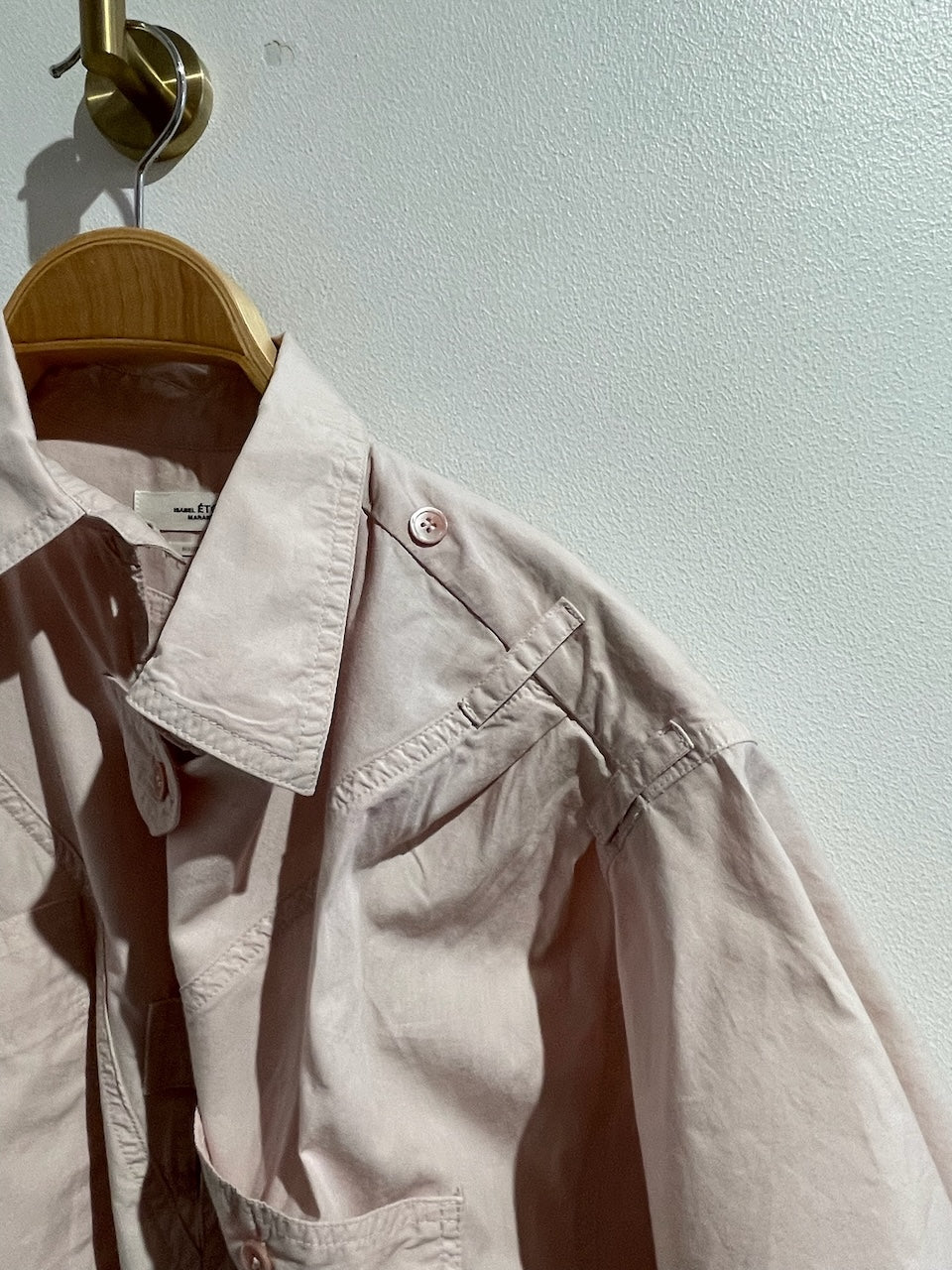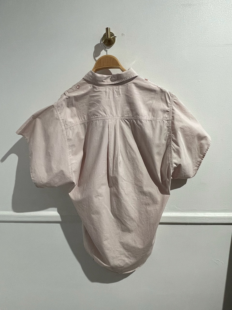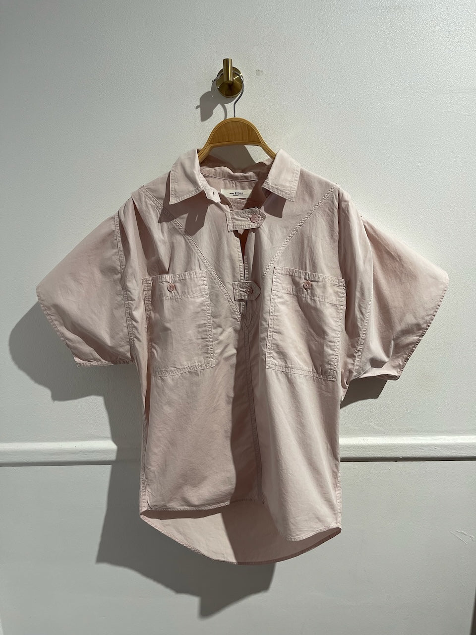 Blouse en coton rose pâle avec encolure boutonnée, poches poitrine et manches courtes. Coupe ample.