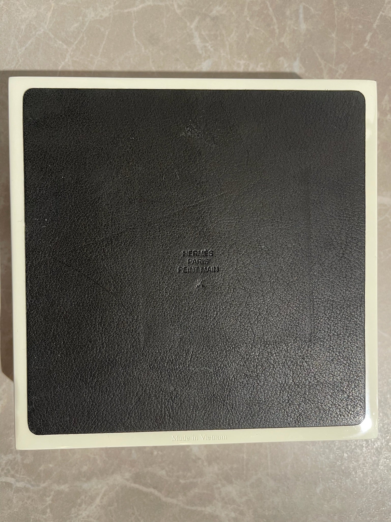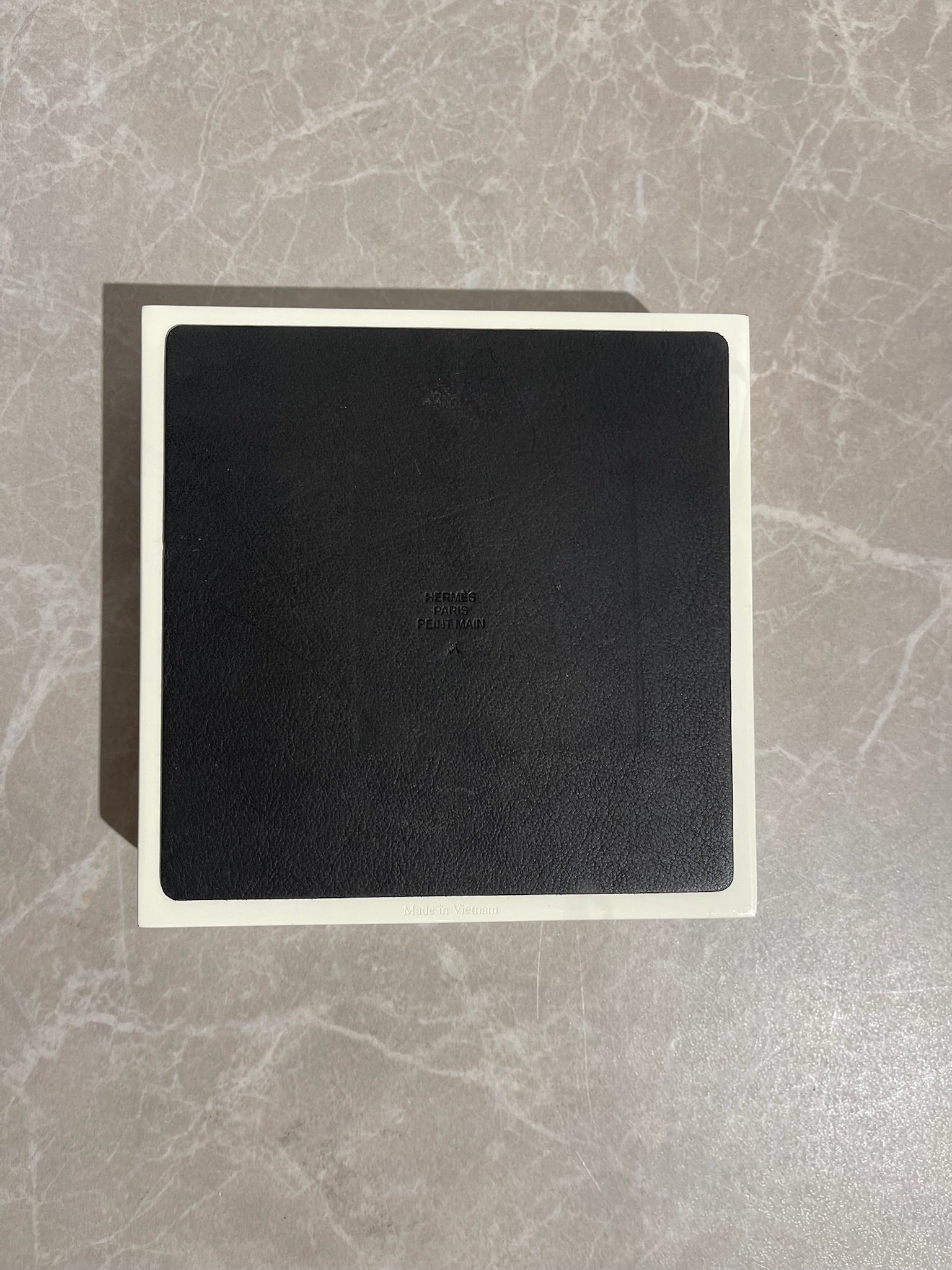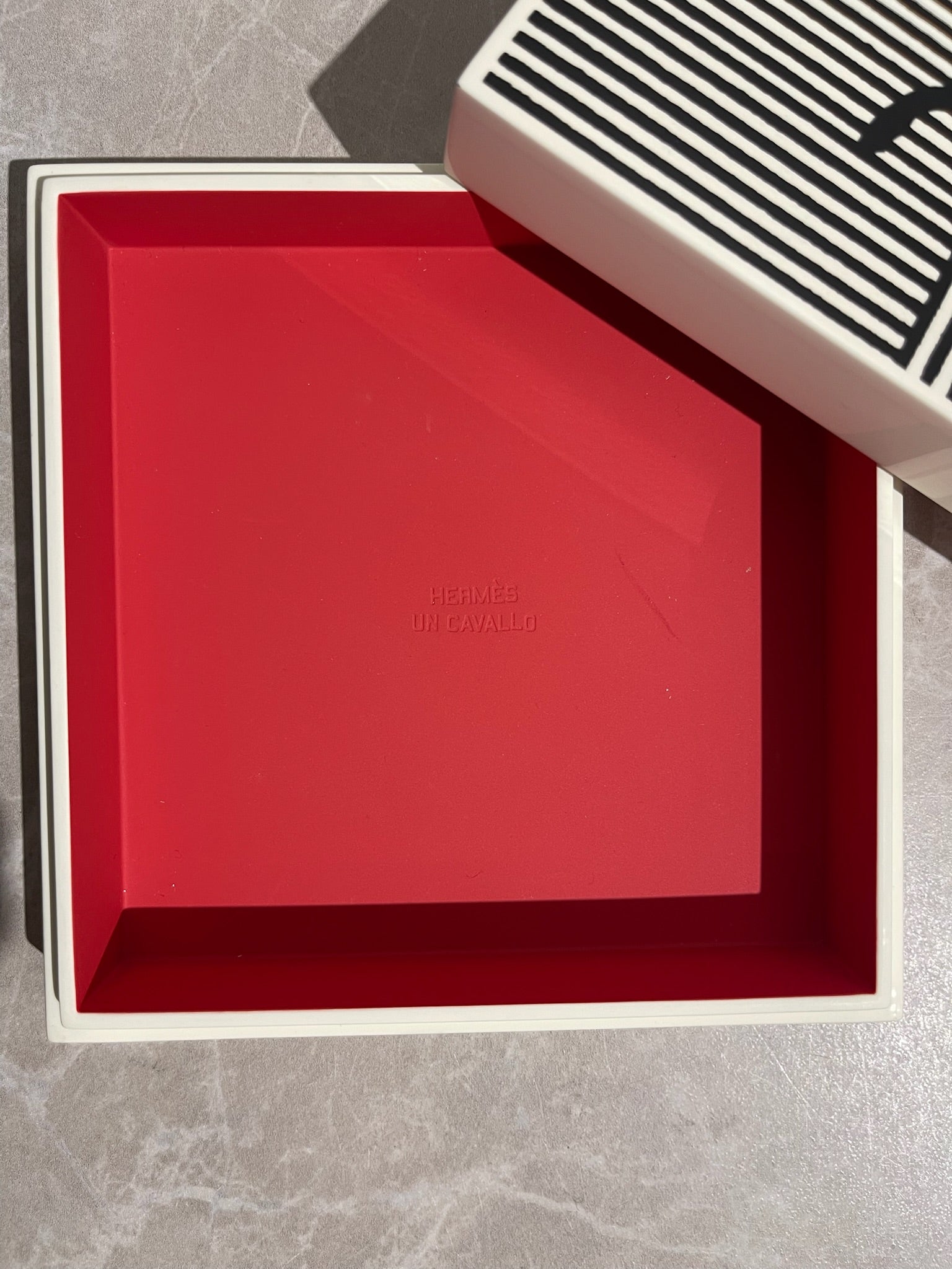 Boite de rangement ou décoration hermès en bois noir et blanc à rayures et motif cheval noir. Dessous en cuir noir signé Hermès et intérieur rouge cherry.