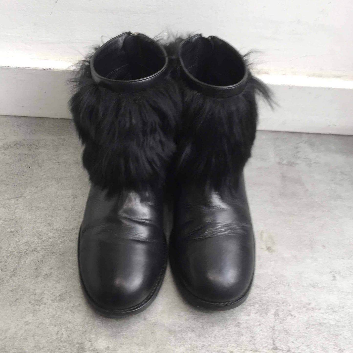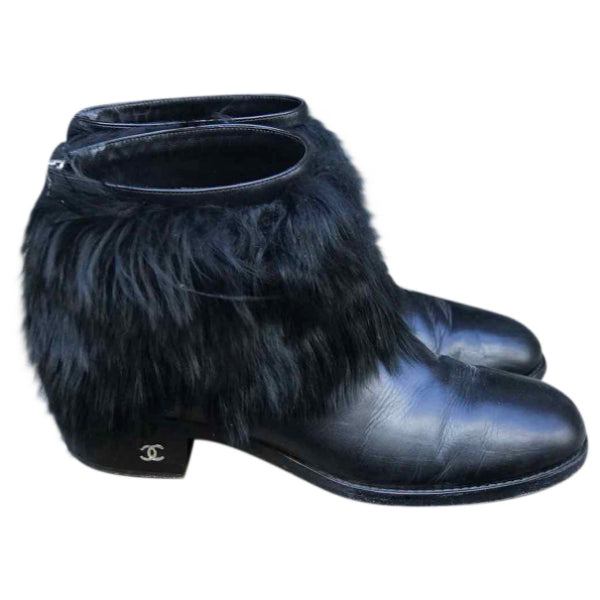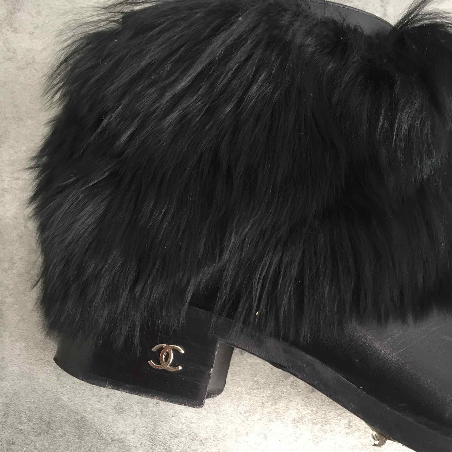 Très jolies boots en cuir noir, fourrure entourant la base et petit logo Chanel sur le talon.