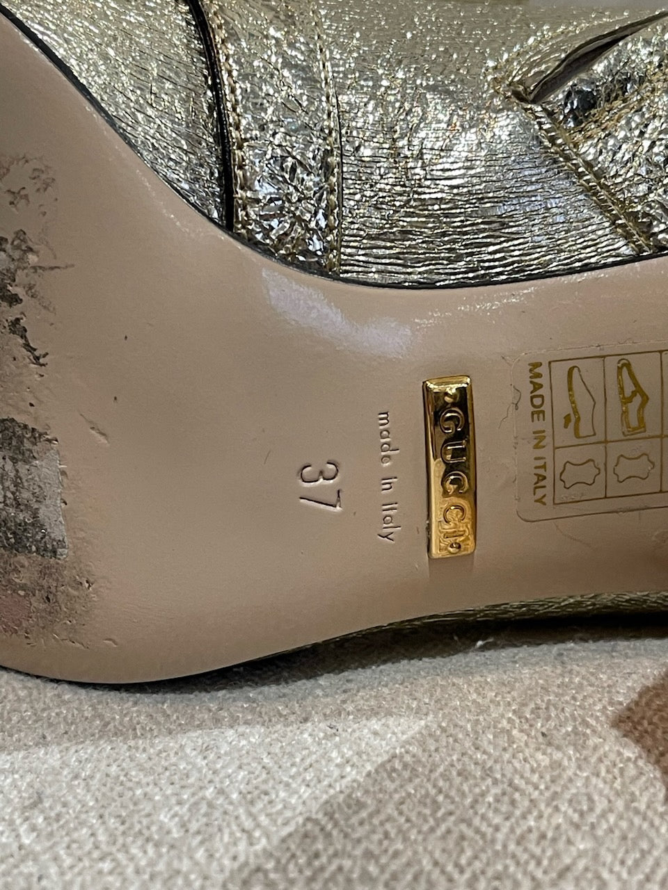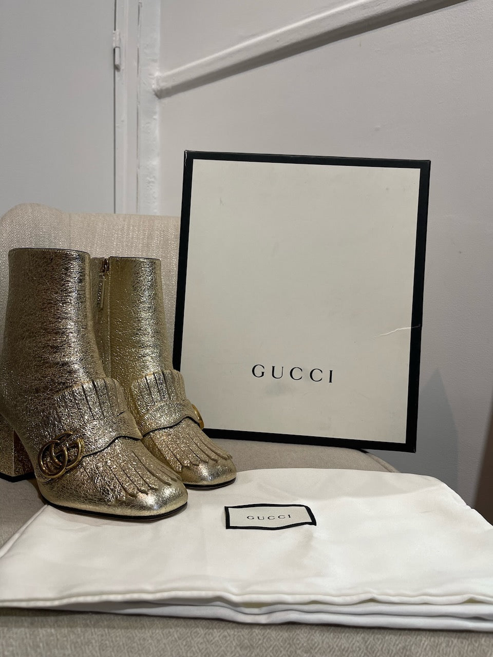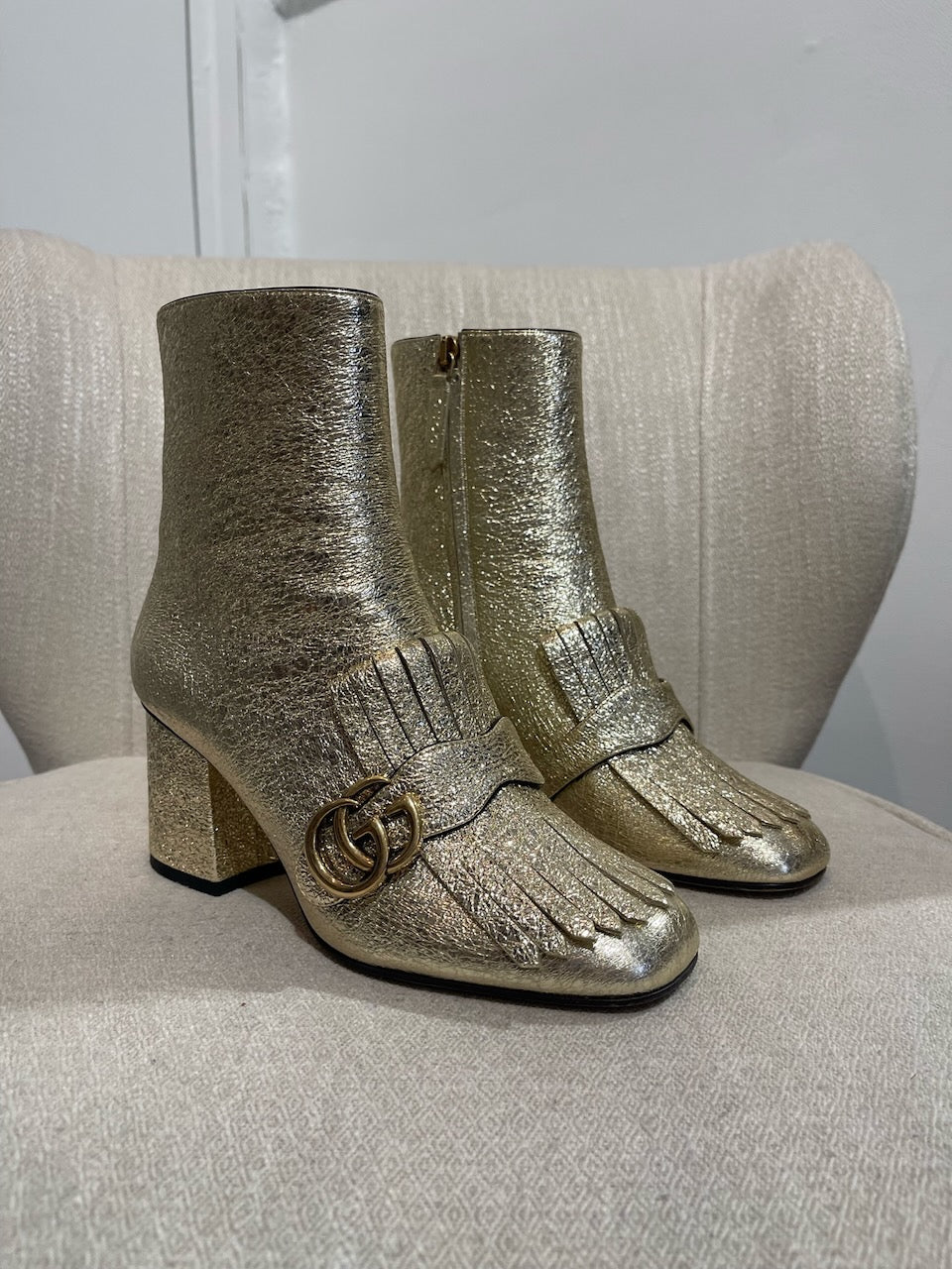 Bottines en cuir craquelé doré avec détails de franges et logo GG en métal doré. Fermeture zip.