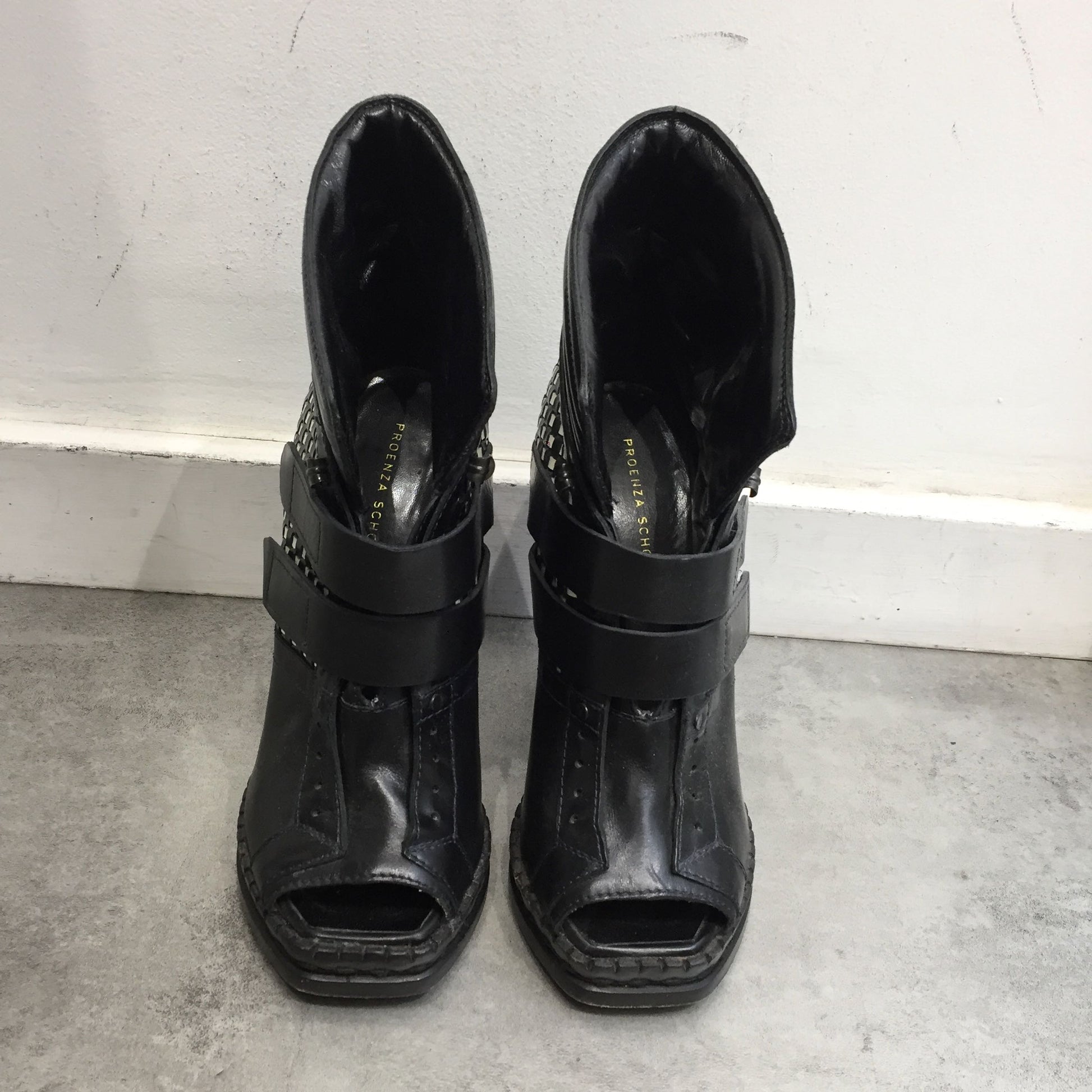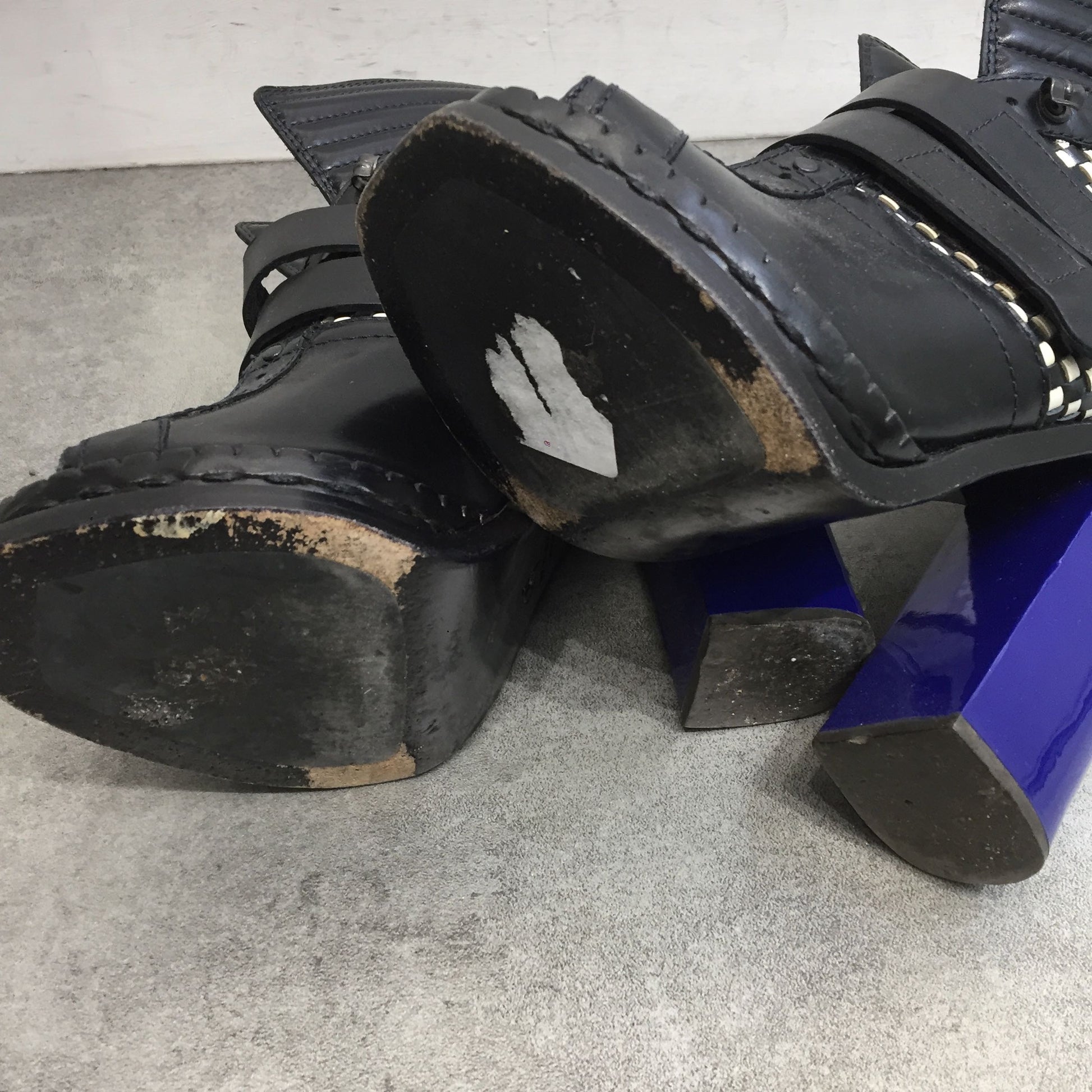 Boots du défilé en cuir noir, talon bloc bleu, et cuir tressé blanc et noir.