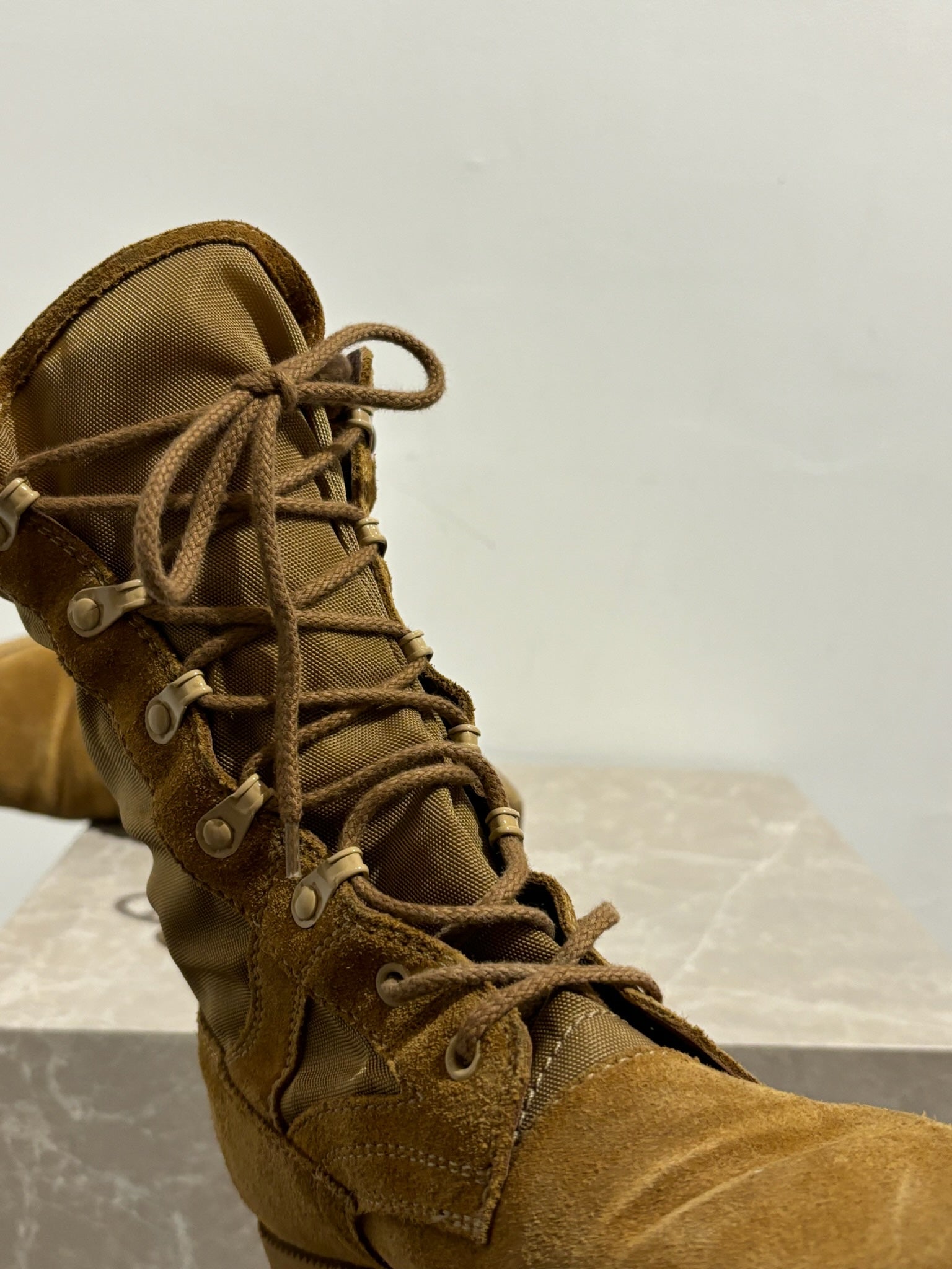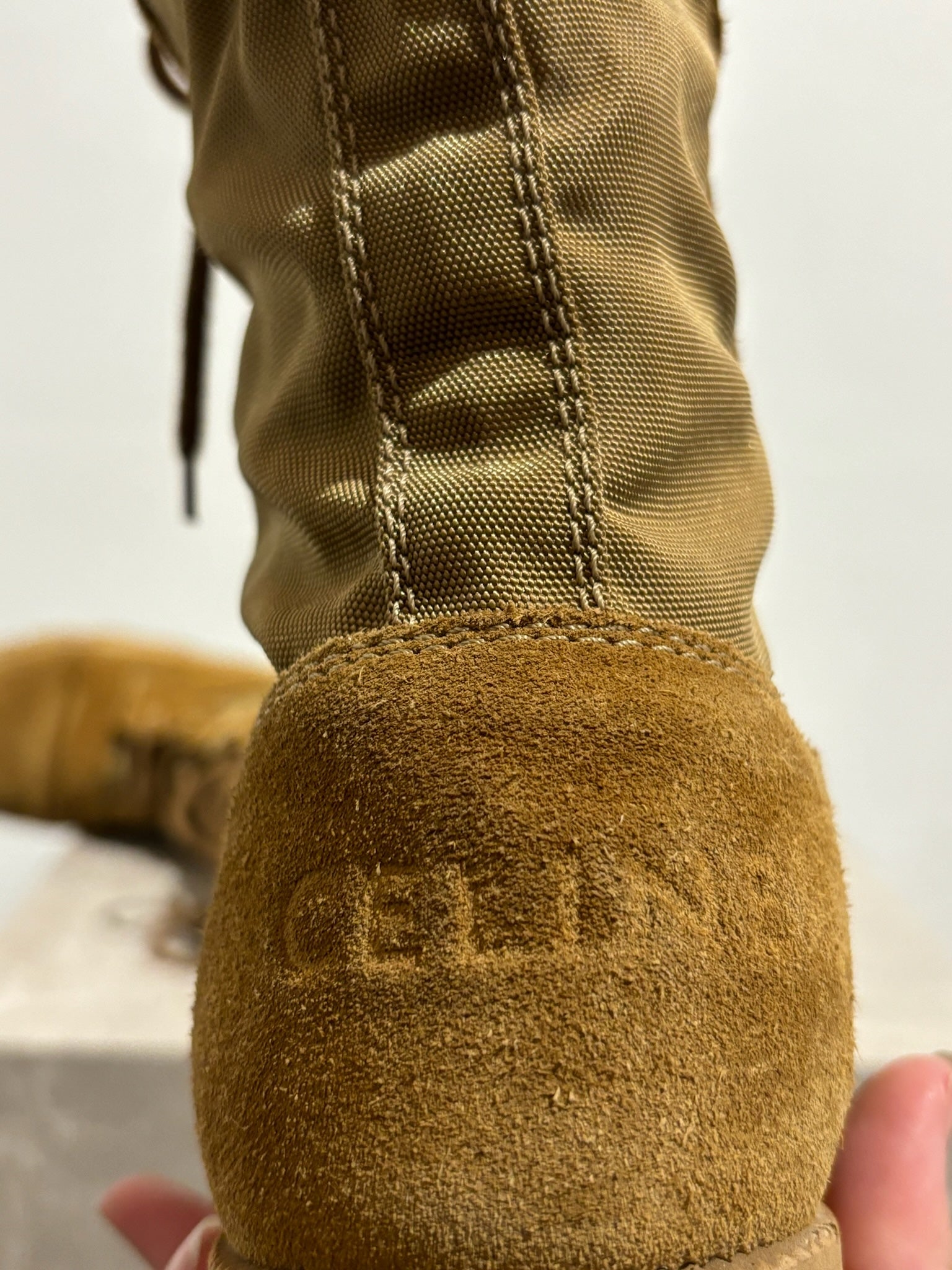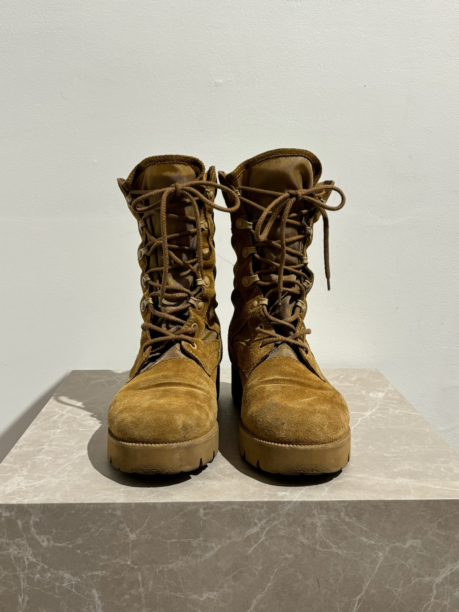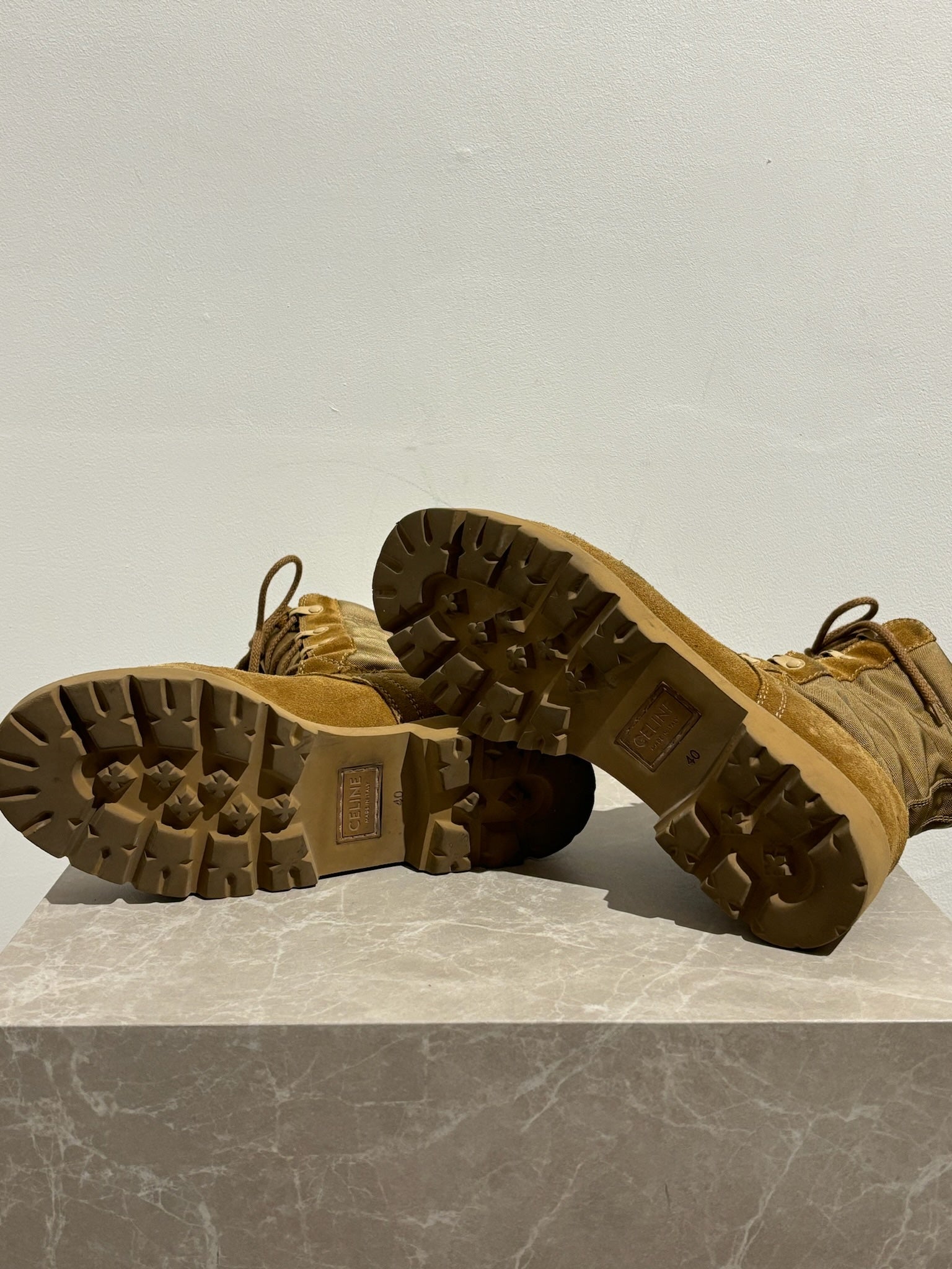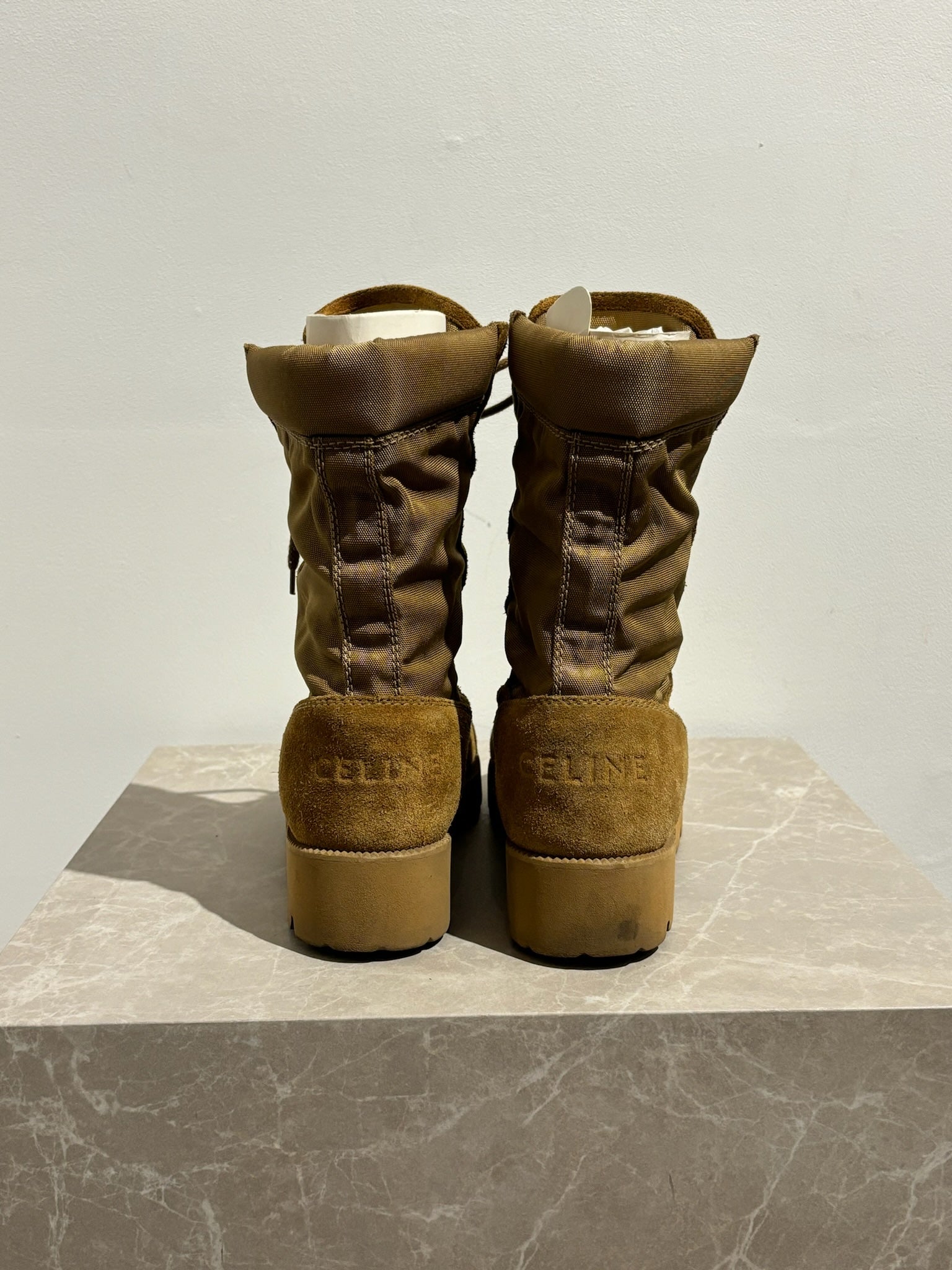 Bottines rangers en daim camel style rangers avec fermeture à lacets sur le devant. Signé Céline à l'arrière de la chaussure. Semelles en gomme.