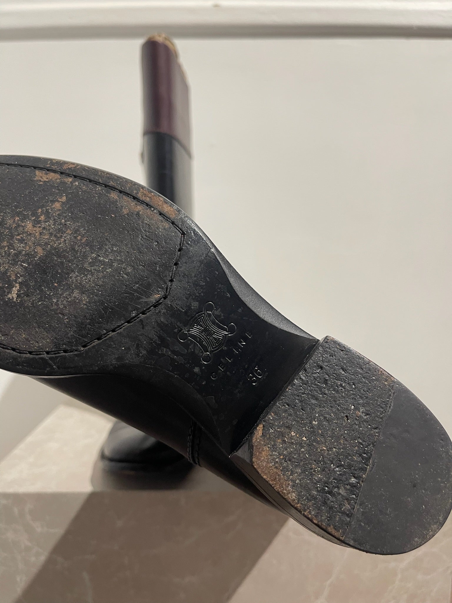 Bottes cavalières en cuir noir et bordeaux, signée Celine en doré sur le côté. Logo Triomphe sur le talon.