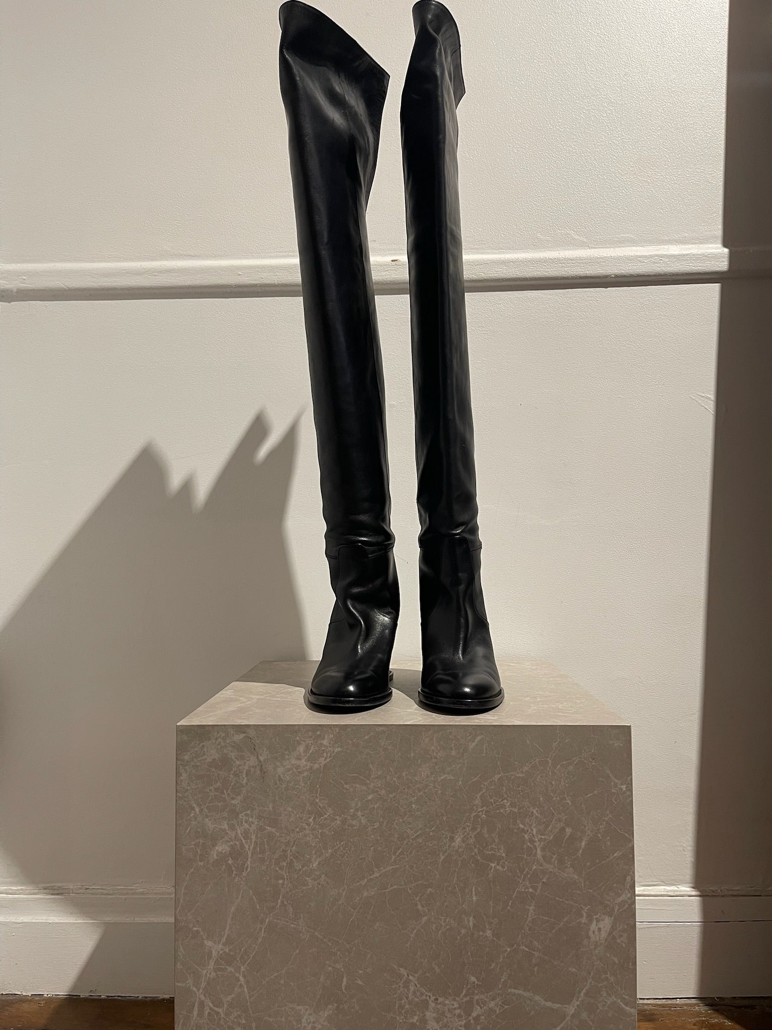 Bottes cuissardes à talons compensés en cuir noir. Logo Triomphe Celine doré sur la cheville. Possibilité de plier le haut de la botte pour la porter plus courte.