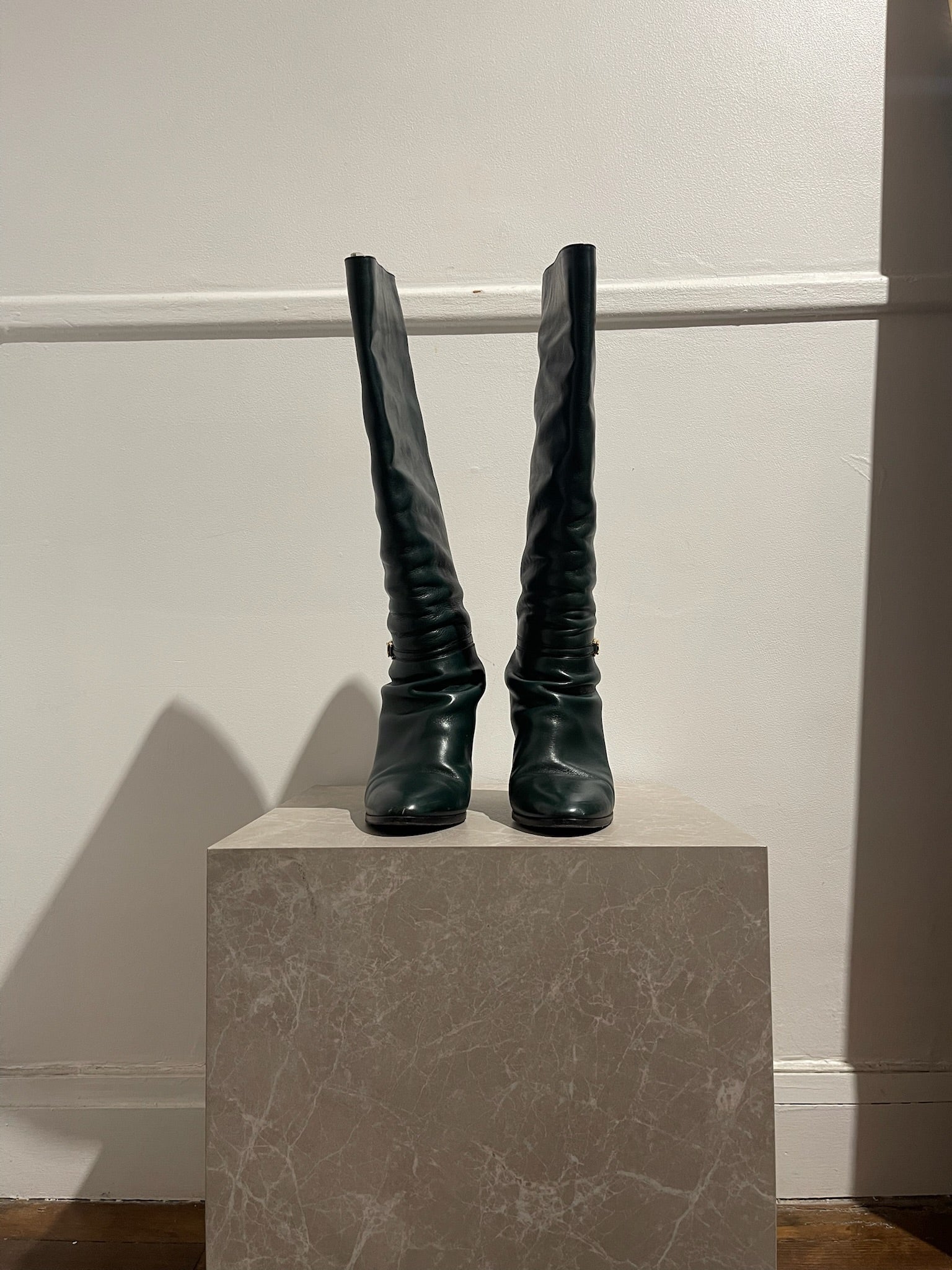 Bottes à talons en cuir vert foncé. Logo Triomphe doré à la cheville.
