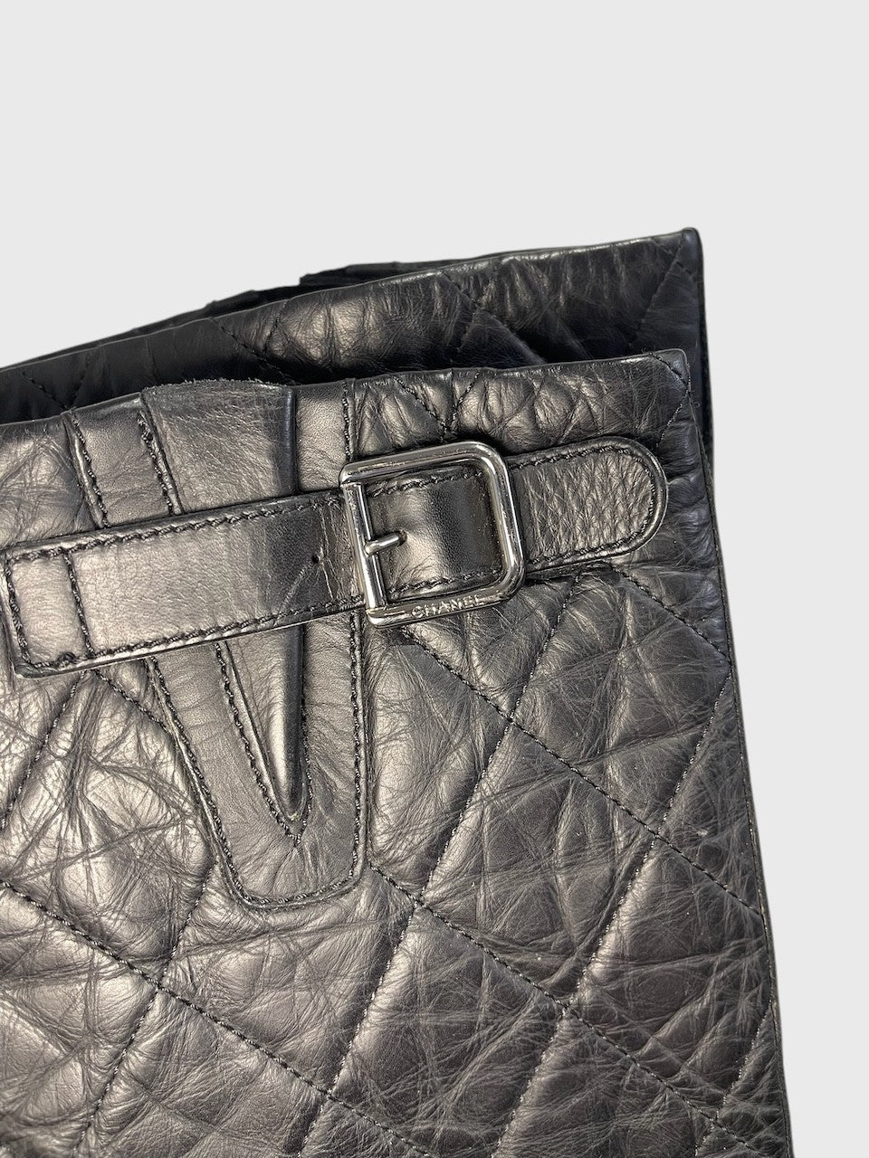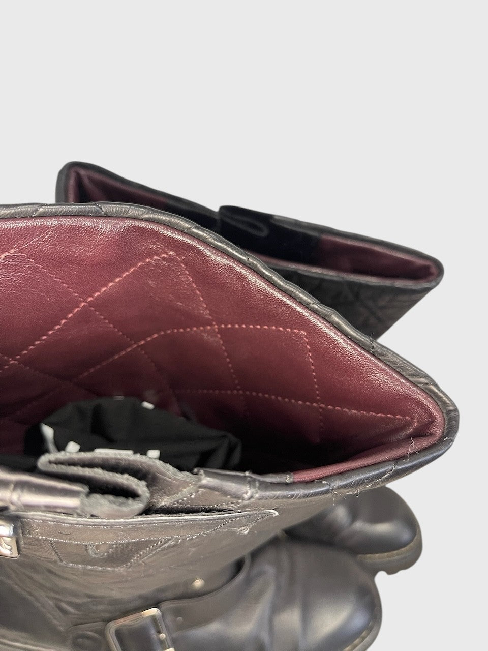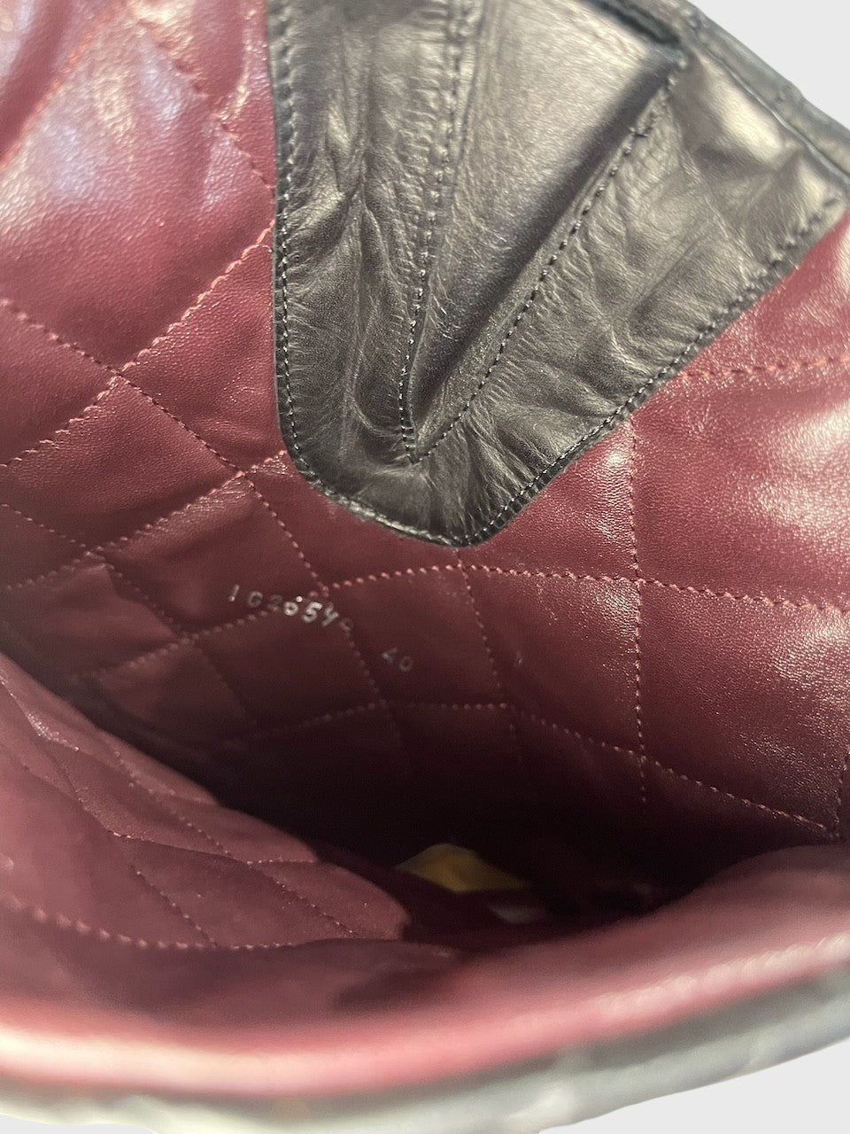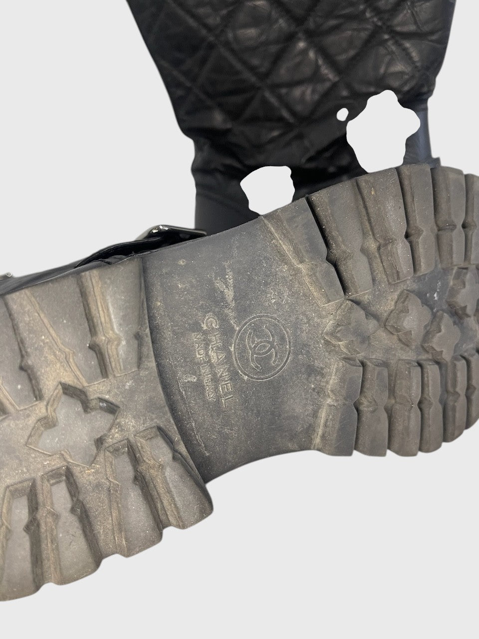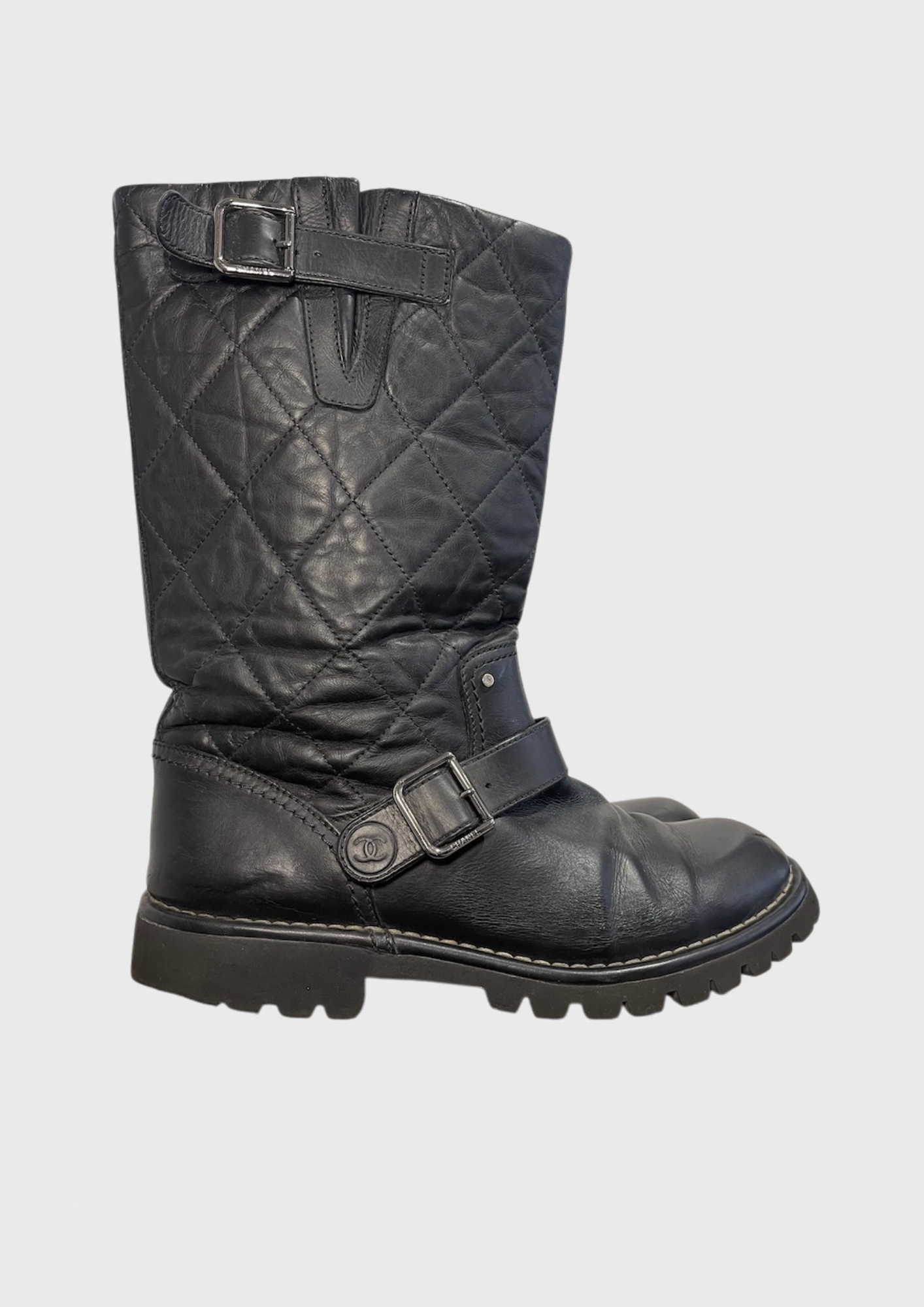 Bottes motarde en cuir noir avec détails matelassés sur la tige et bride ajustable sur le huat. Bride décorative à la cheville signée CC. S'enfile simplement. Semelle crantée.