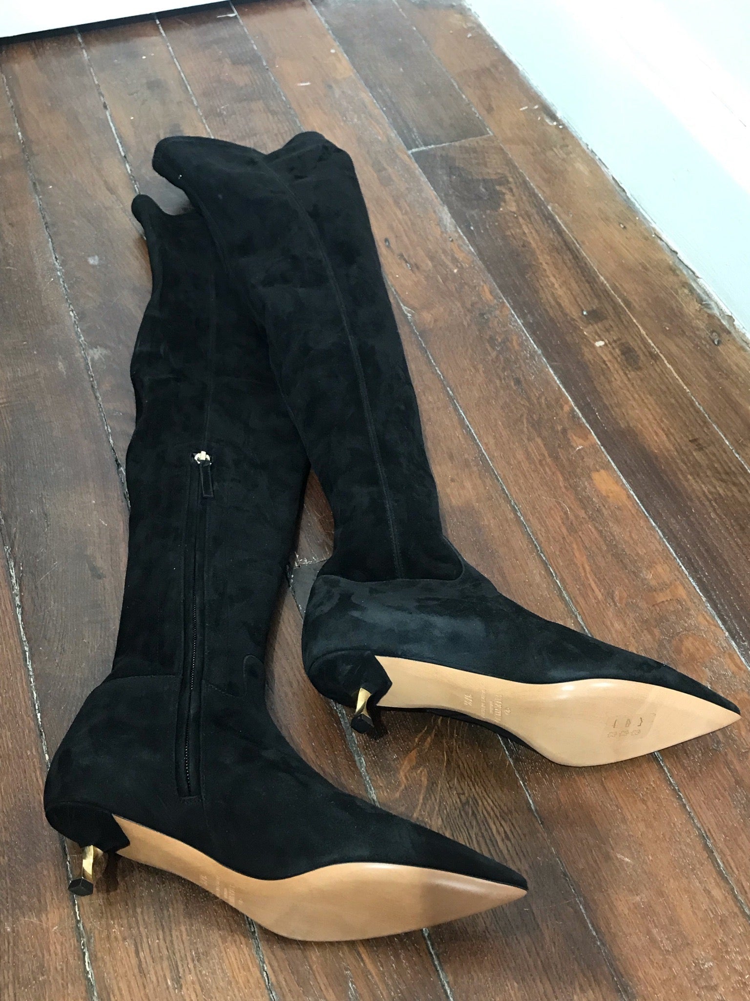 Bottes en daim noires, à bouts pointus et petits talons.
