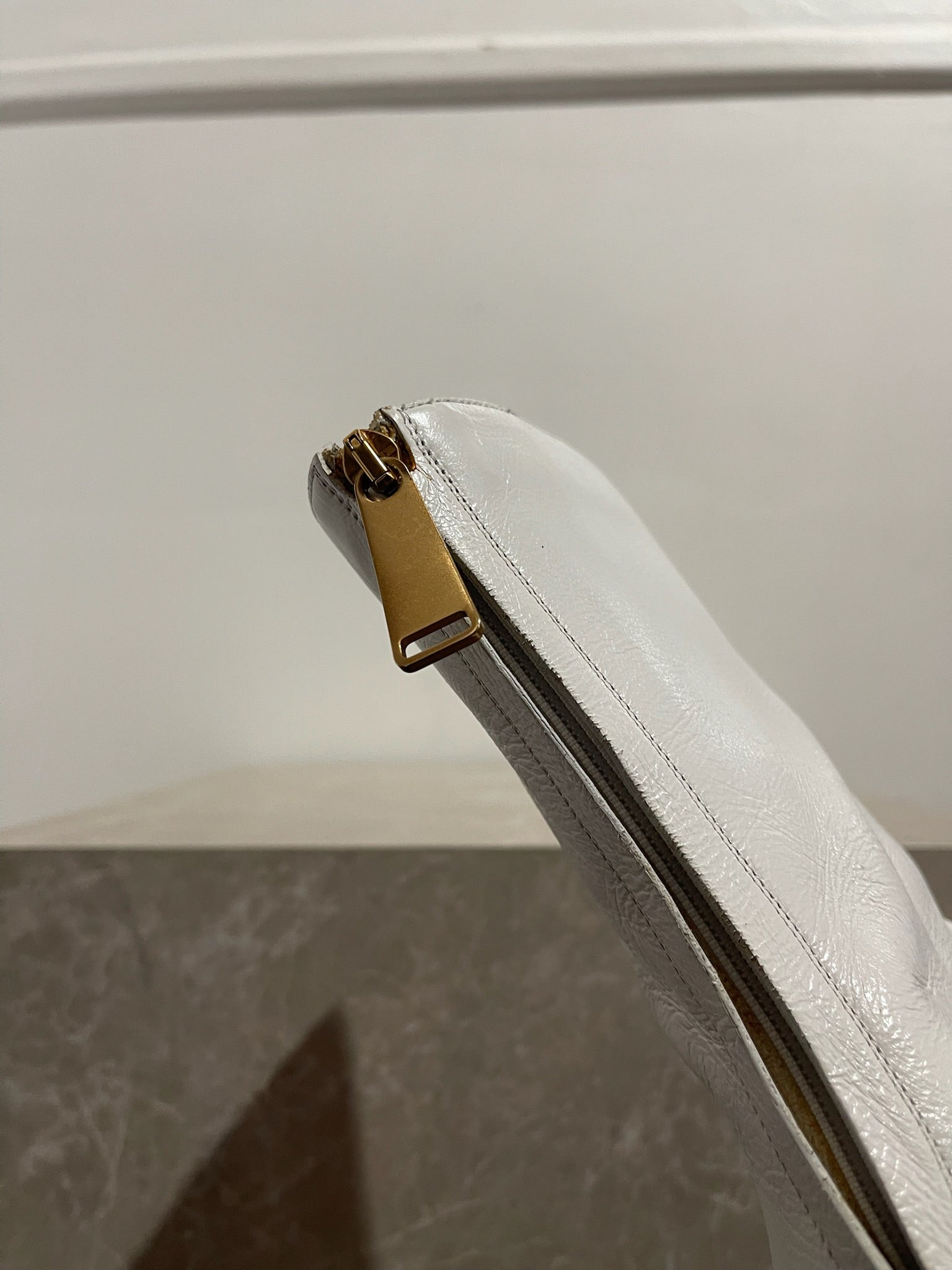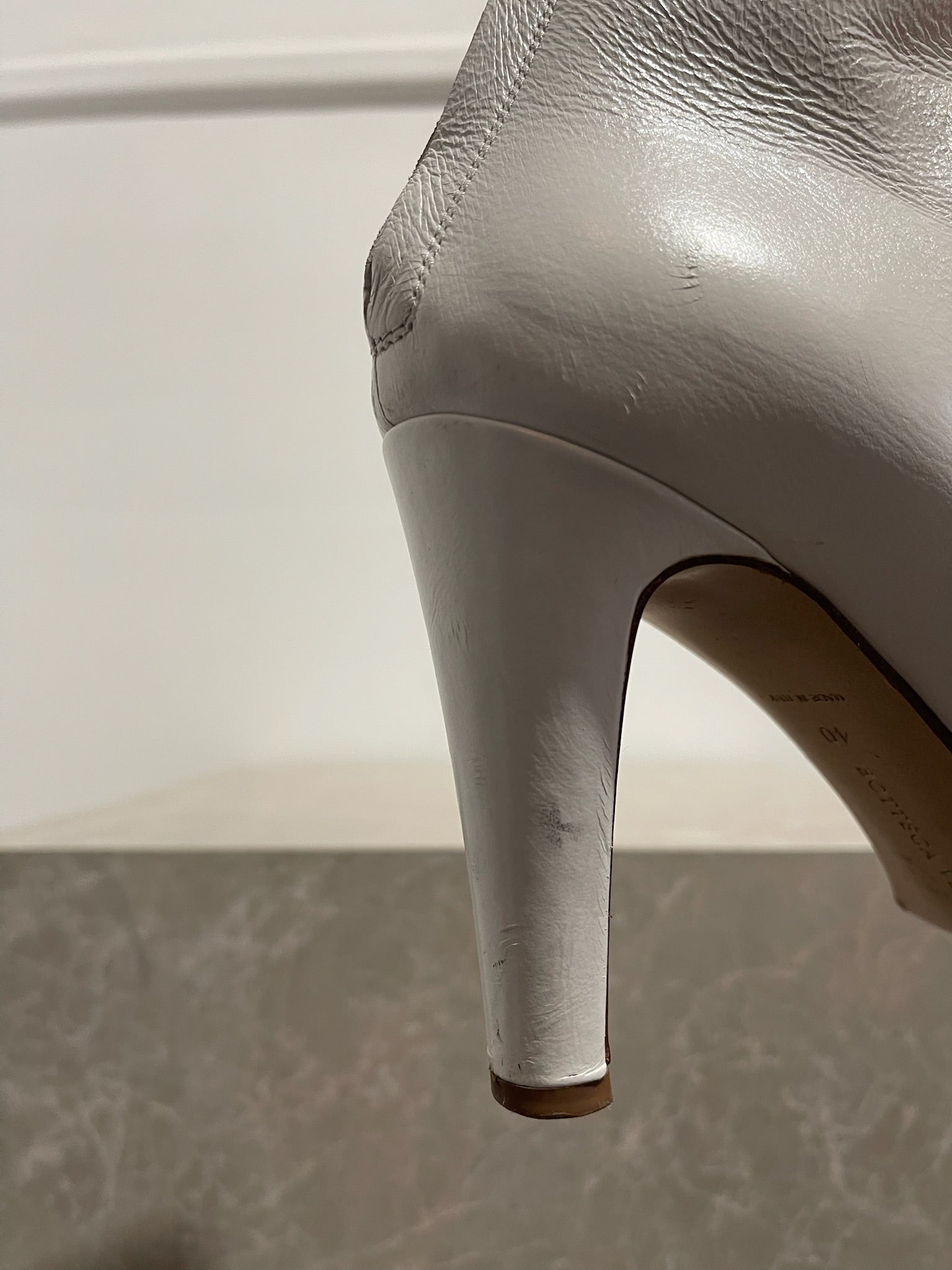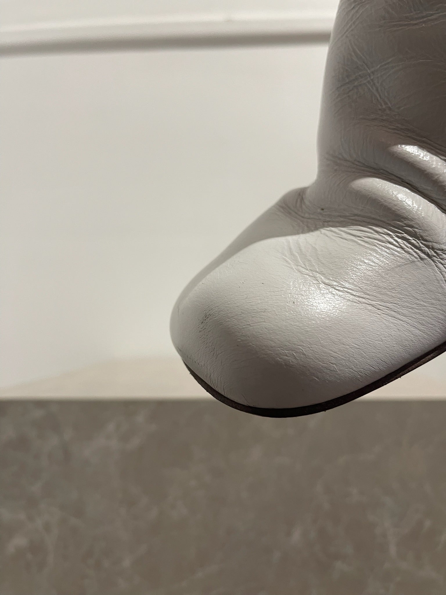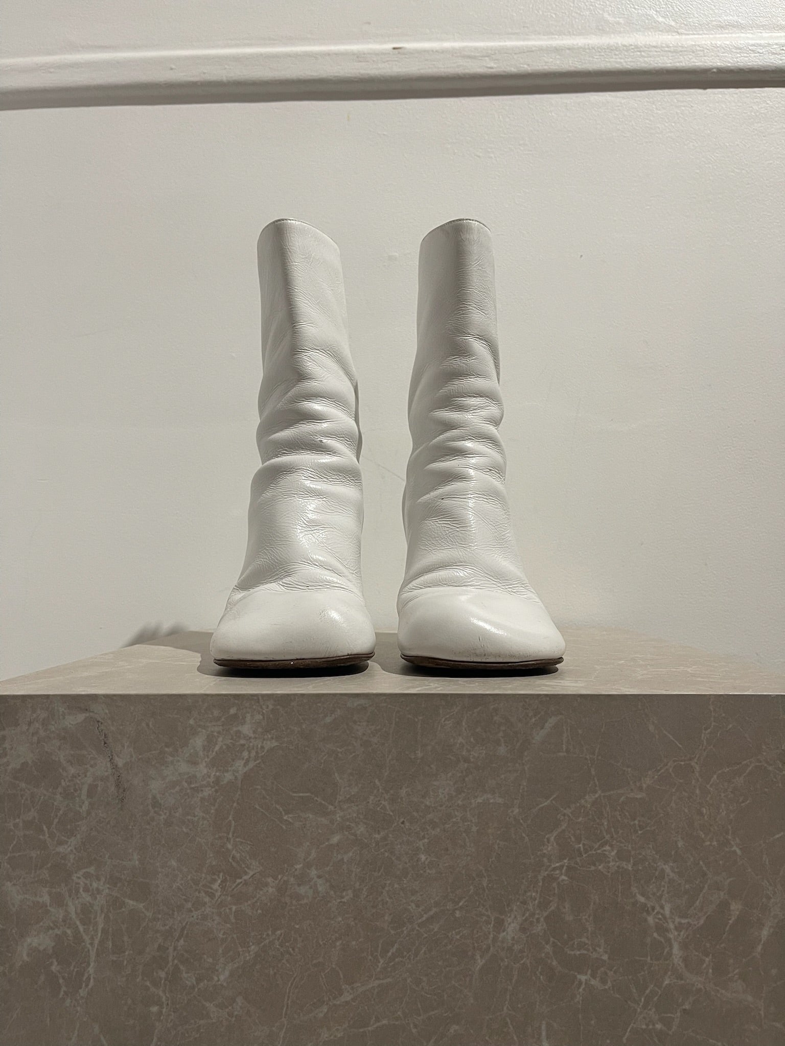 Bottines en cuir de veau blanc à bout carré et fermeture zippée à l'arrière.