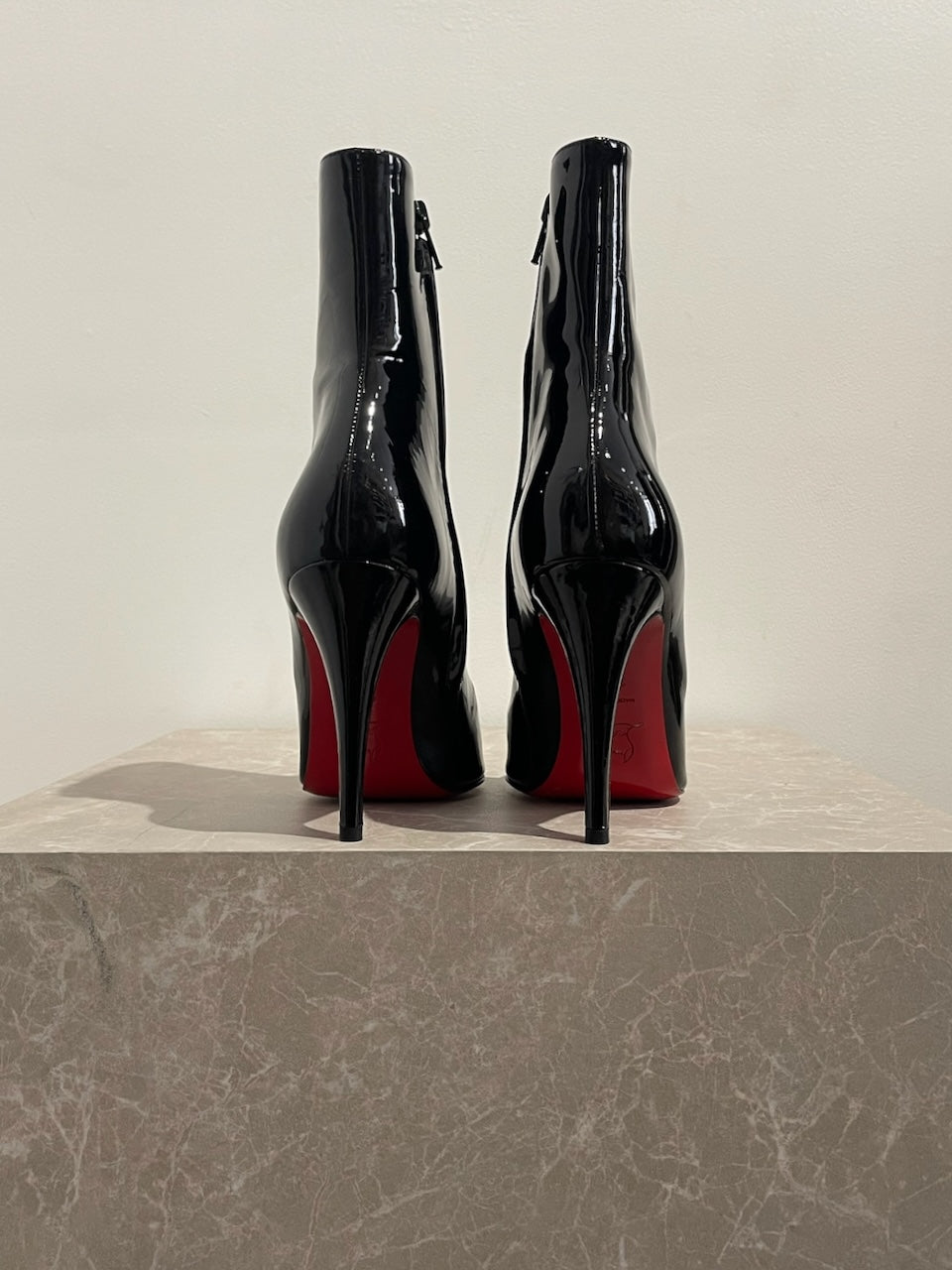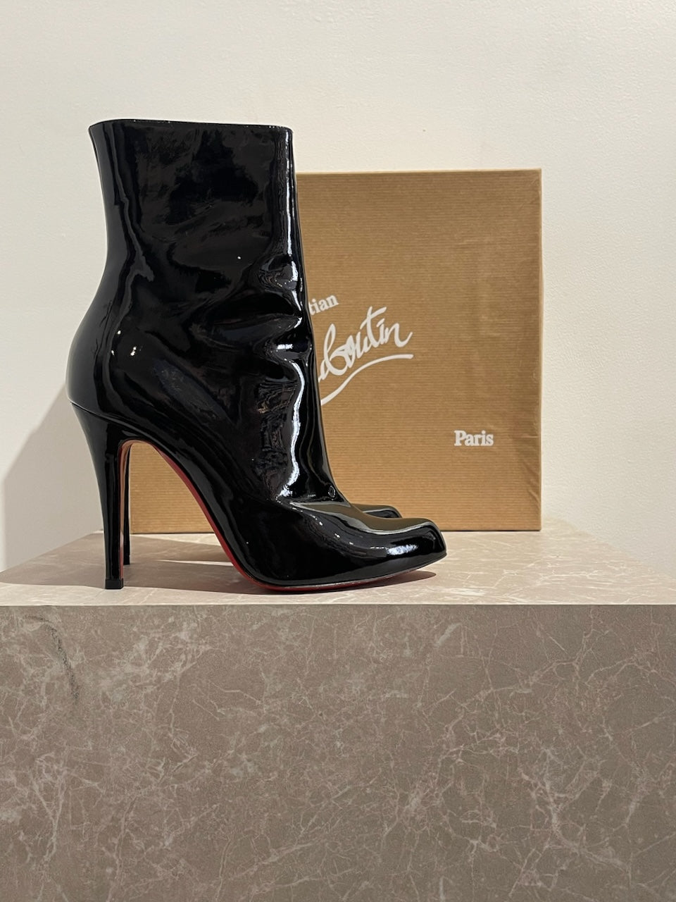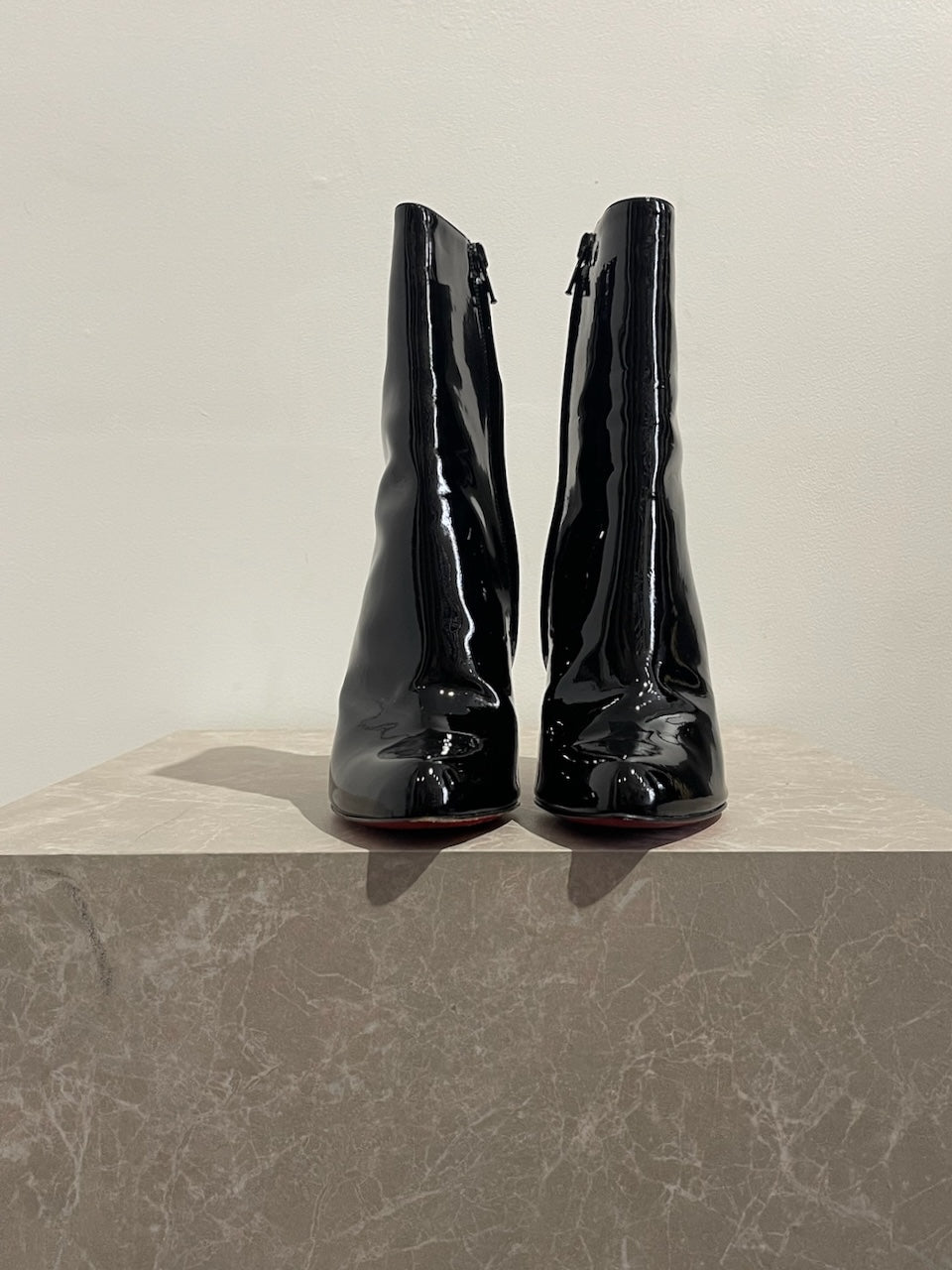 Bottines à talons en cuir vernis noir. Fermeture zippée sur le côté.