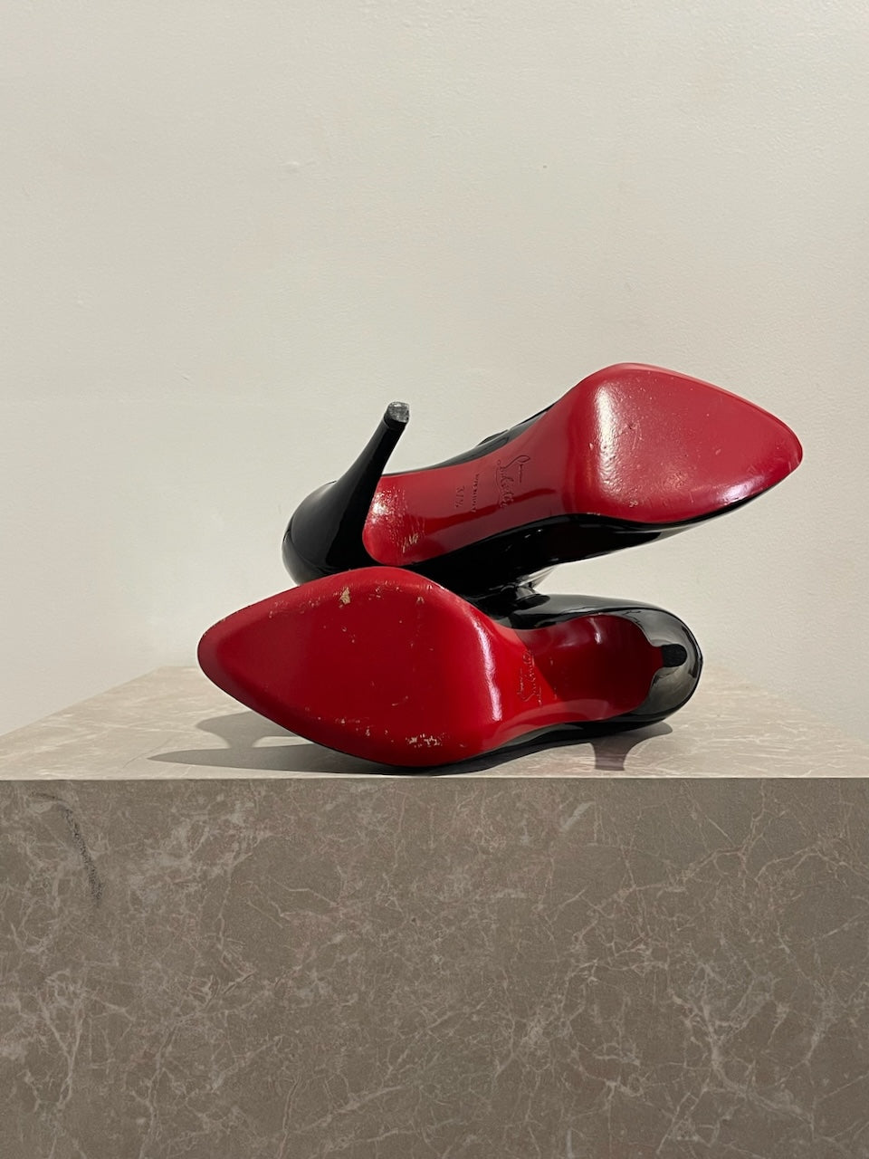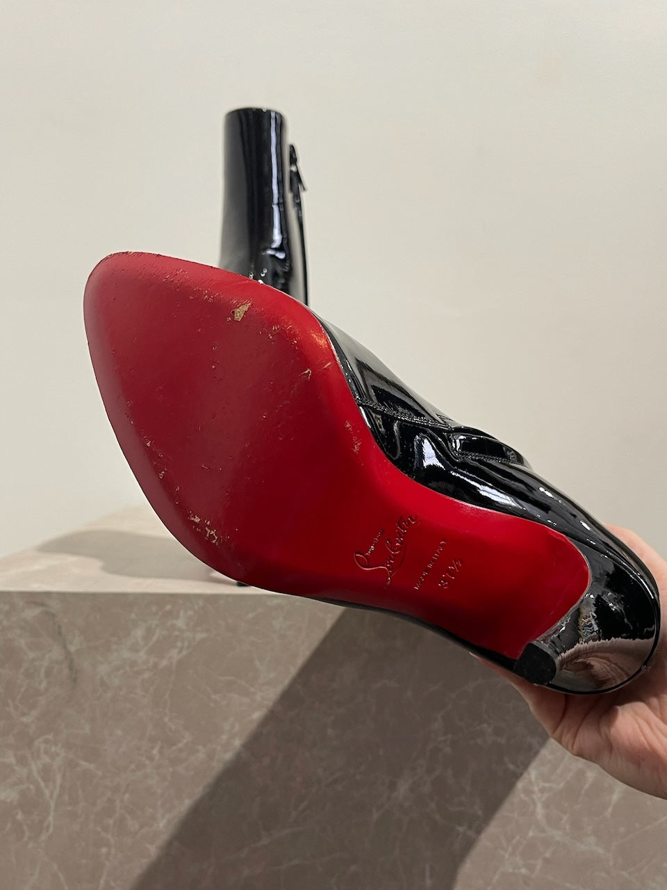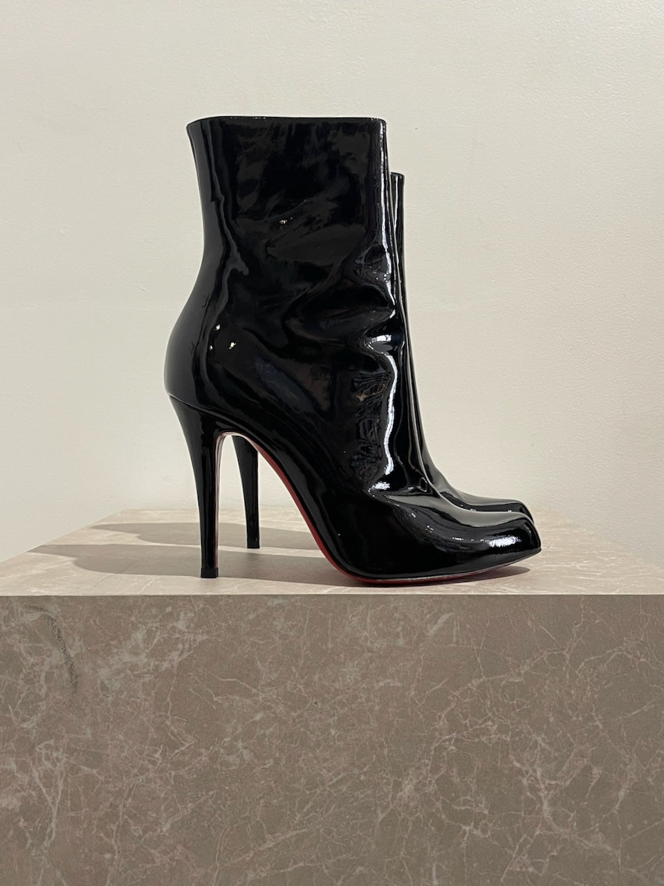 Bottines à talons en cuir vernis noir. Fermeture zippée sur le côté.
