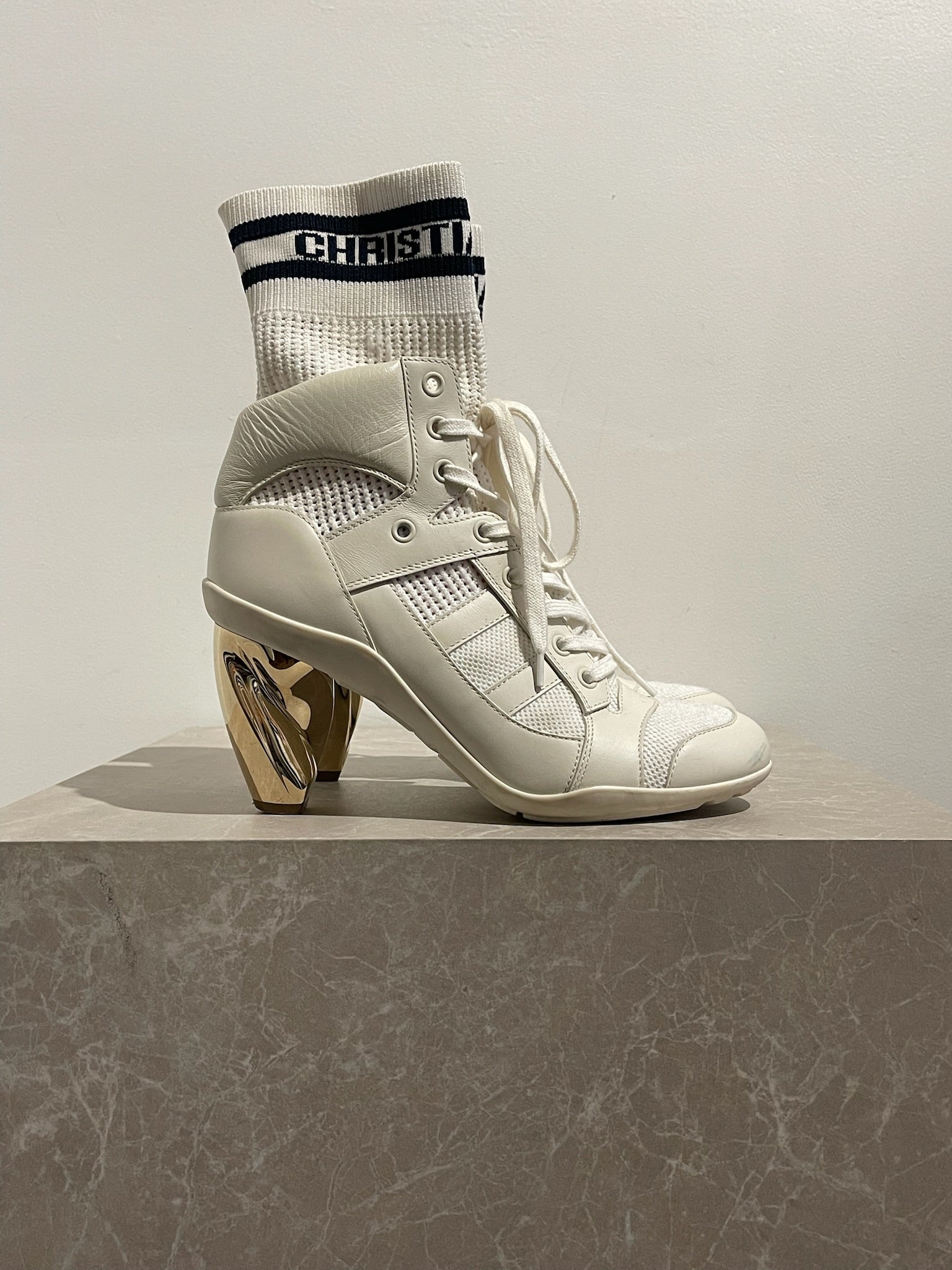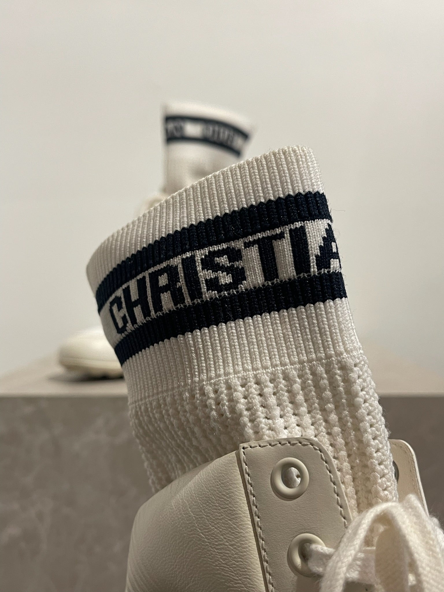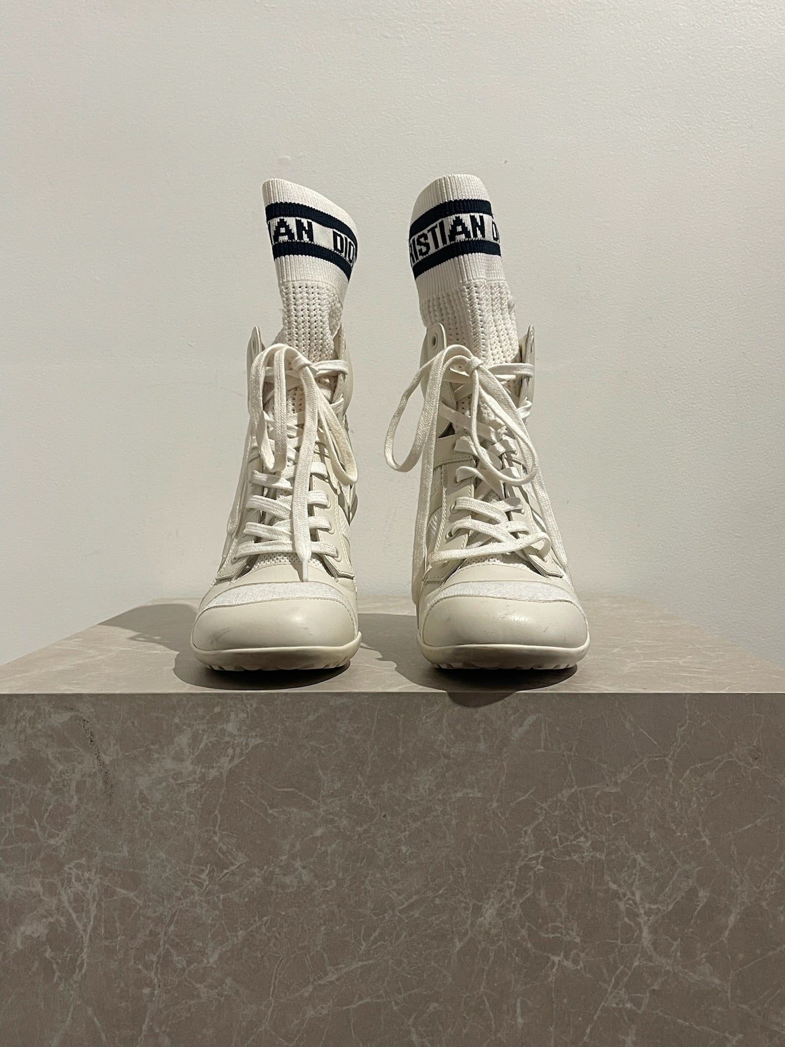 Bottines à talons en cuir blanc avec chaussettes en maille intégrées signée Christian Dior. Fermeture à lacets et talon doré.