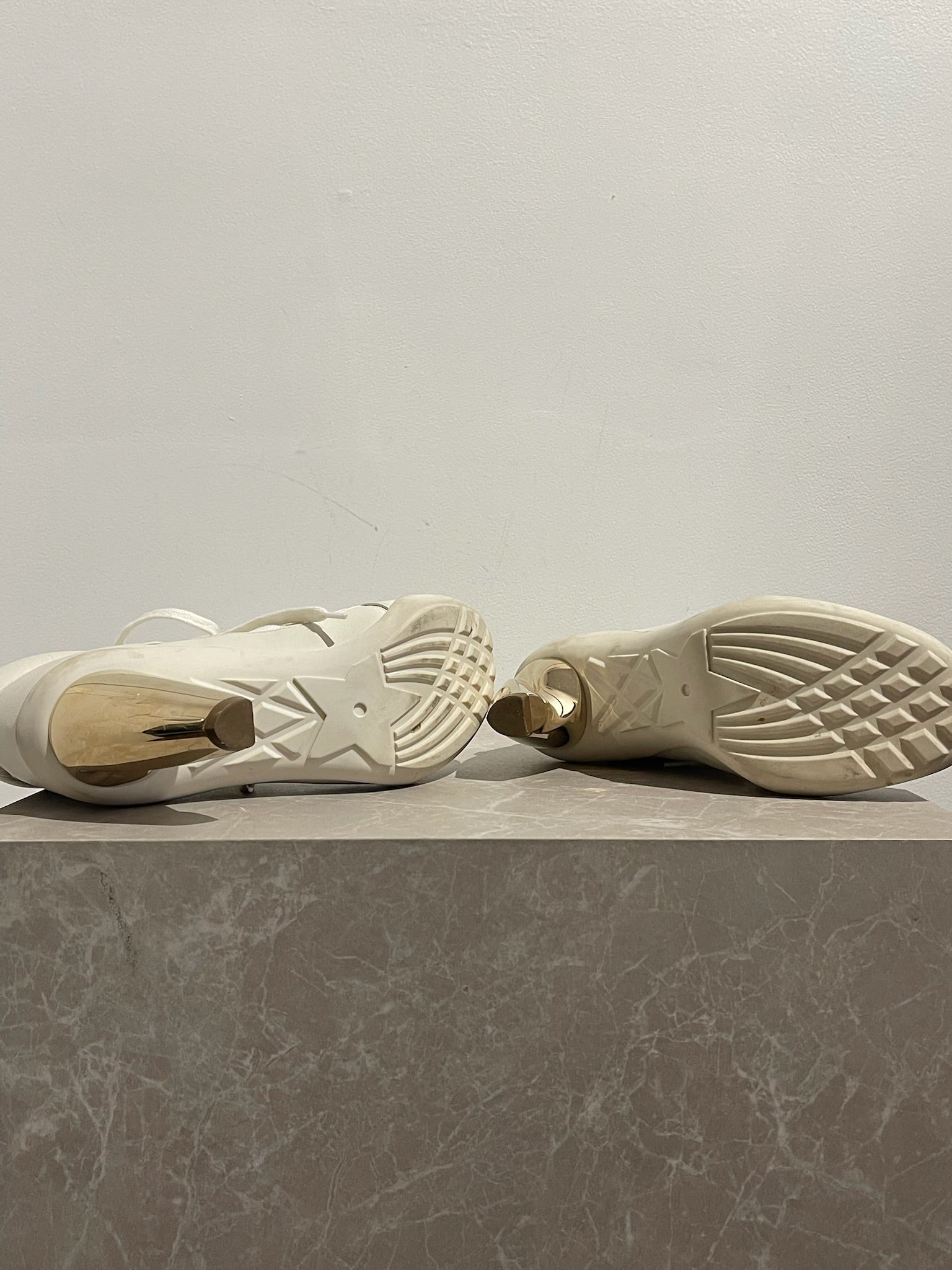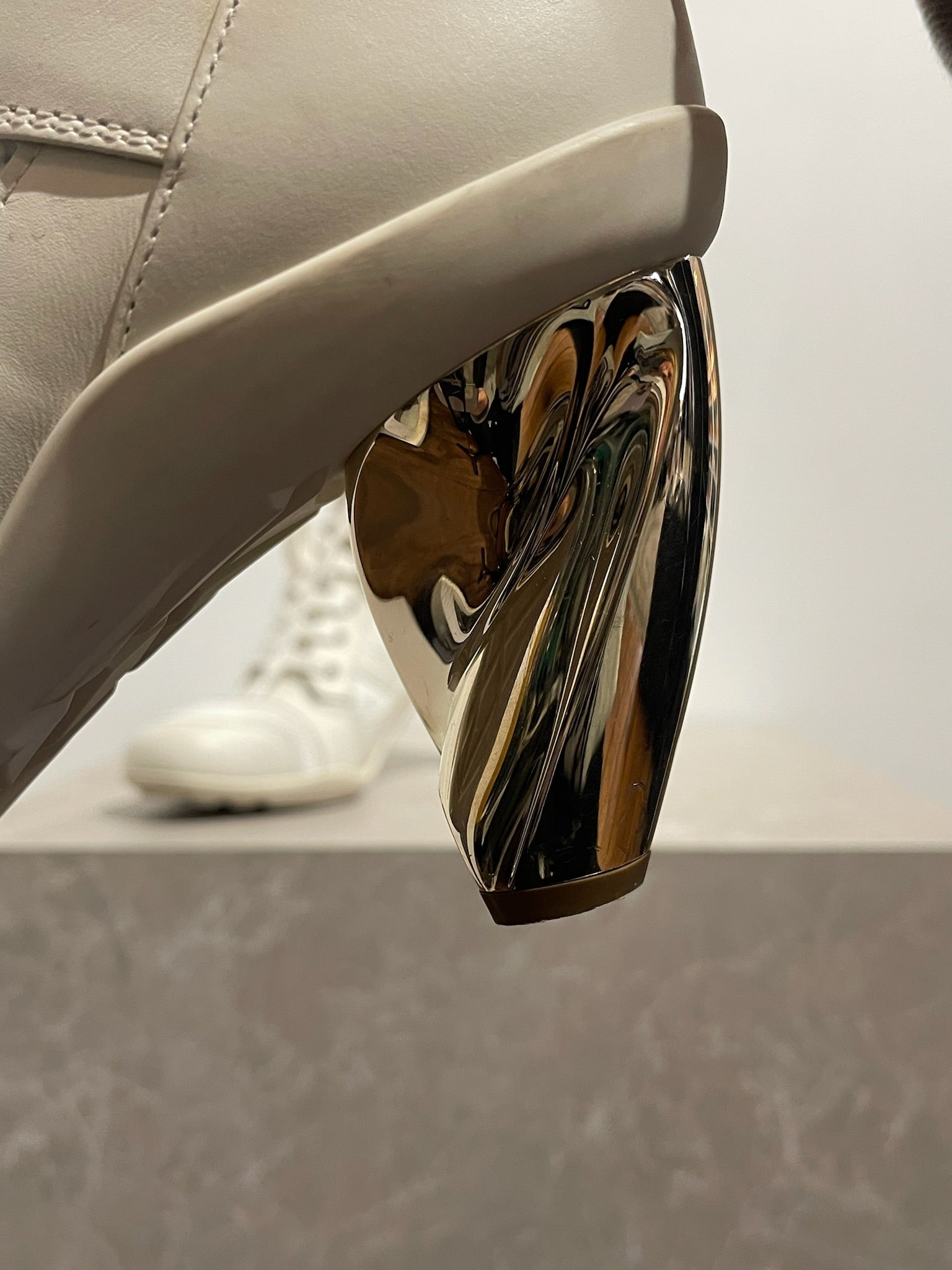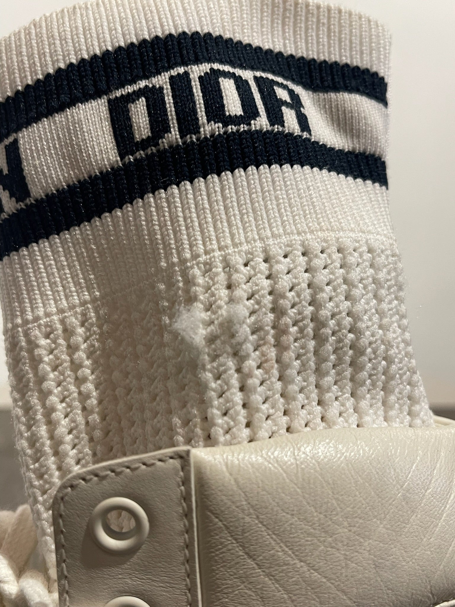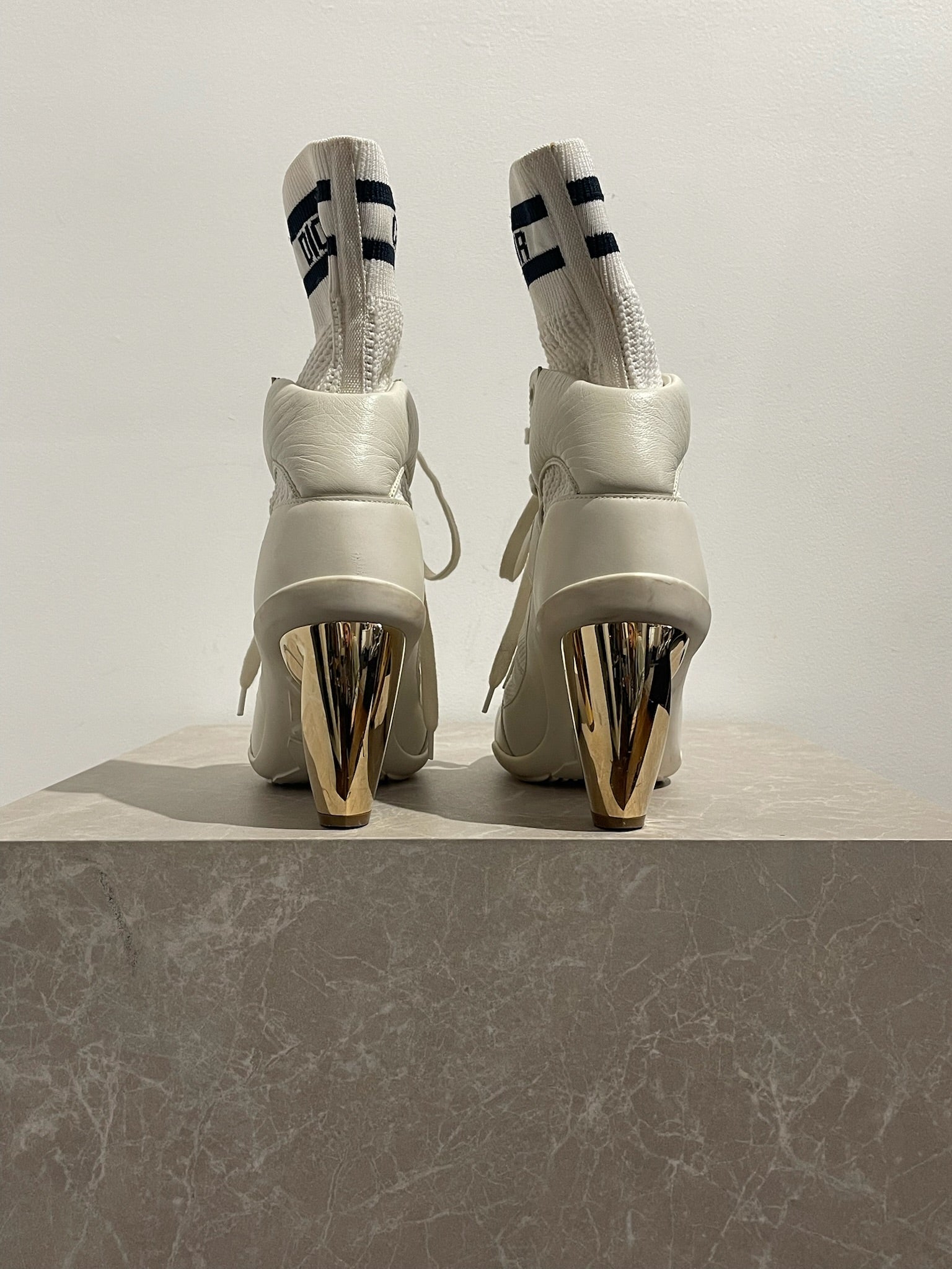 Bottines à talons en cuir blanc avec chaussettes en maille intégrées signée Christian Dior. Fermeture à lacets et talon doré.