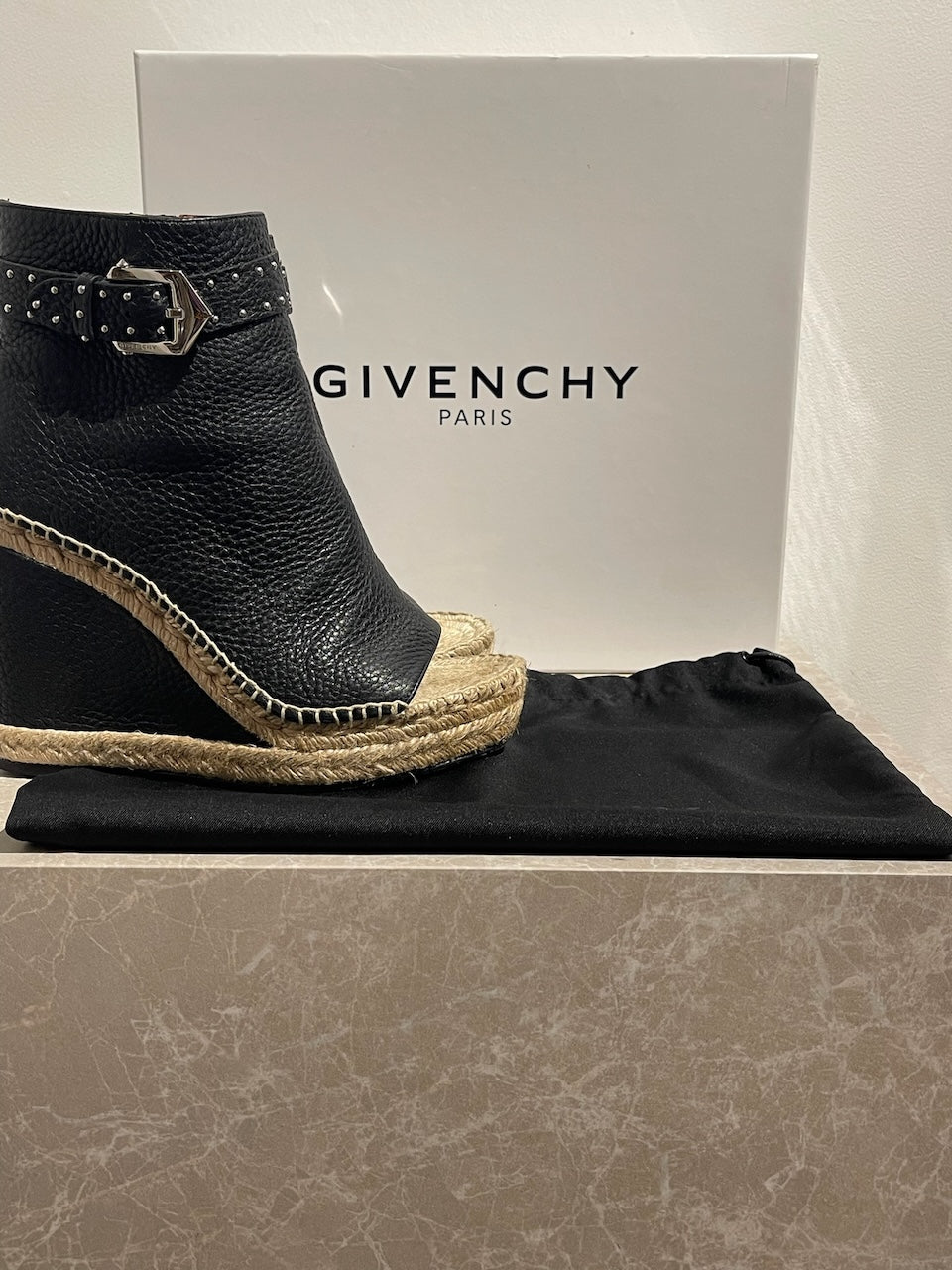 Boots en cuir noir avec bouts ouverts, sangle décorative à la cheville, fermeture zippée et talons compensés. Semelles en corde naturelle.