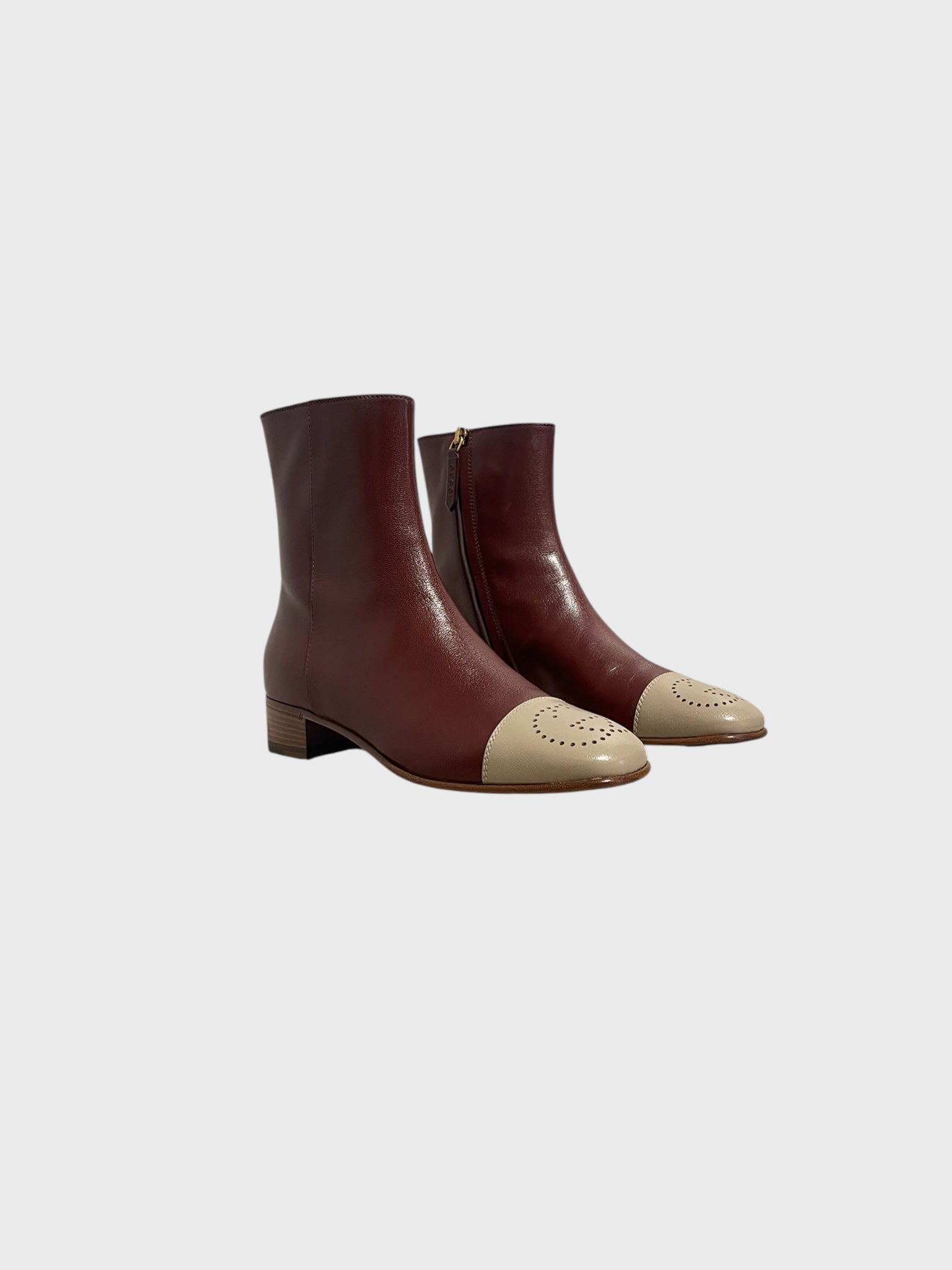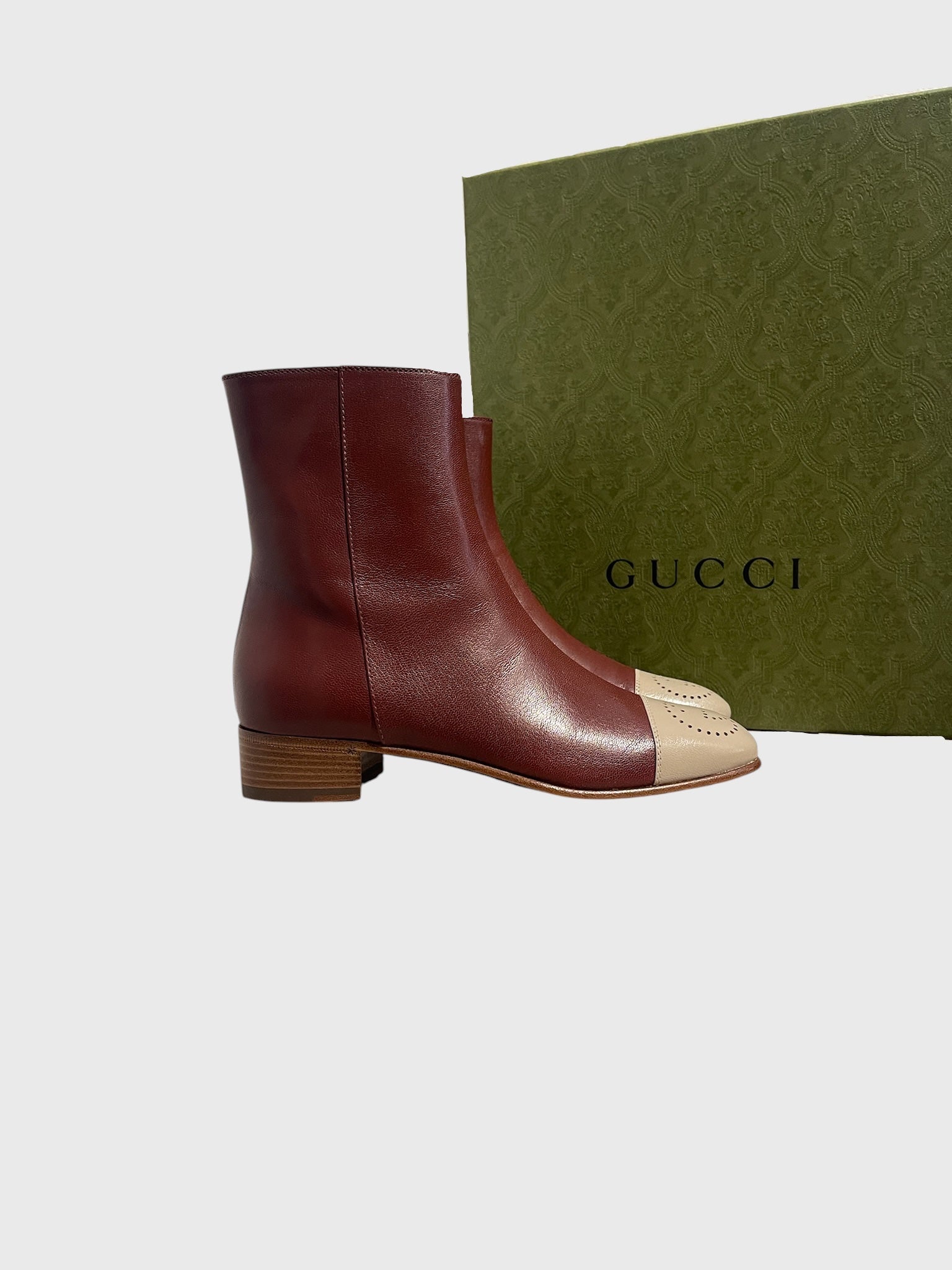 Bottines en cuir bordeaux avec bouts beiges ornés du logo GG perforé. Fermeture zippée avec médaillon signé Gucci. Petits talons.