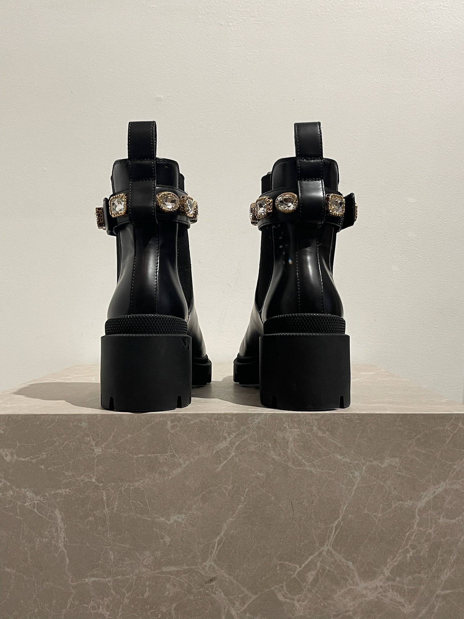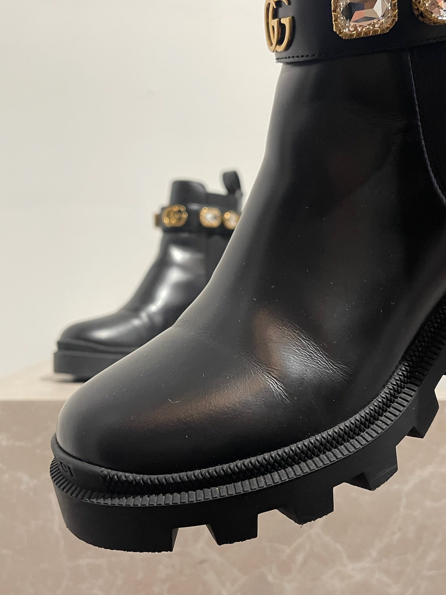 Boots Chelsea en cuir noir à bouts ronds et élastiques aux côtés. Cristaux décoratifs et logo GG amovible à la cheville.