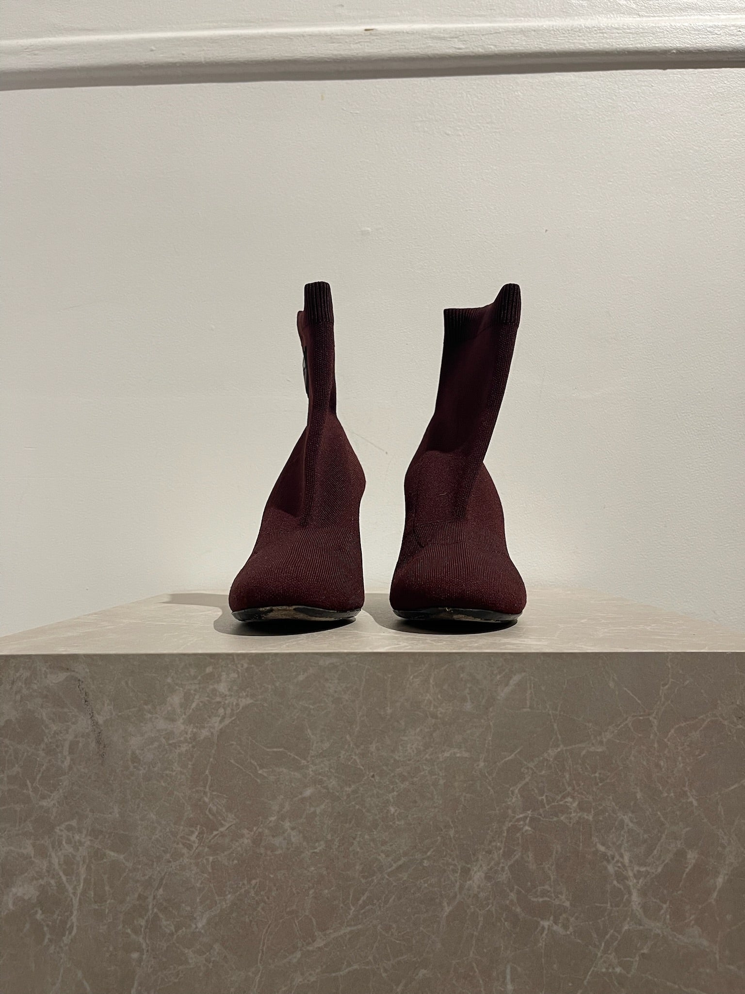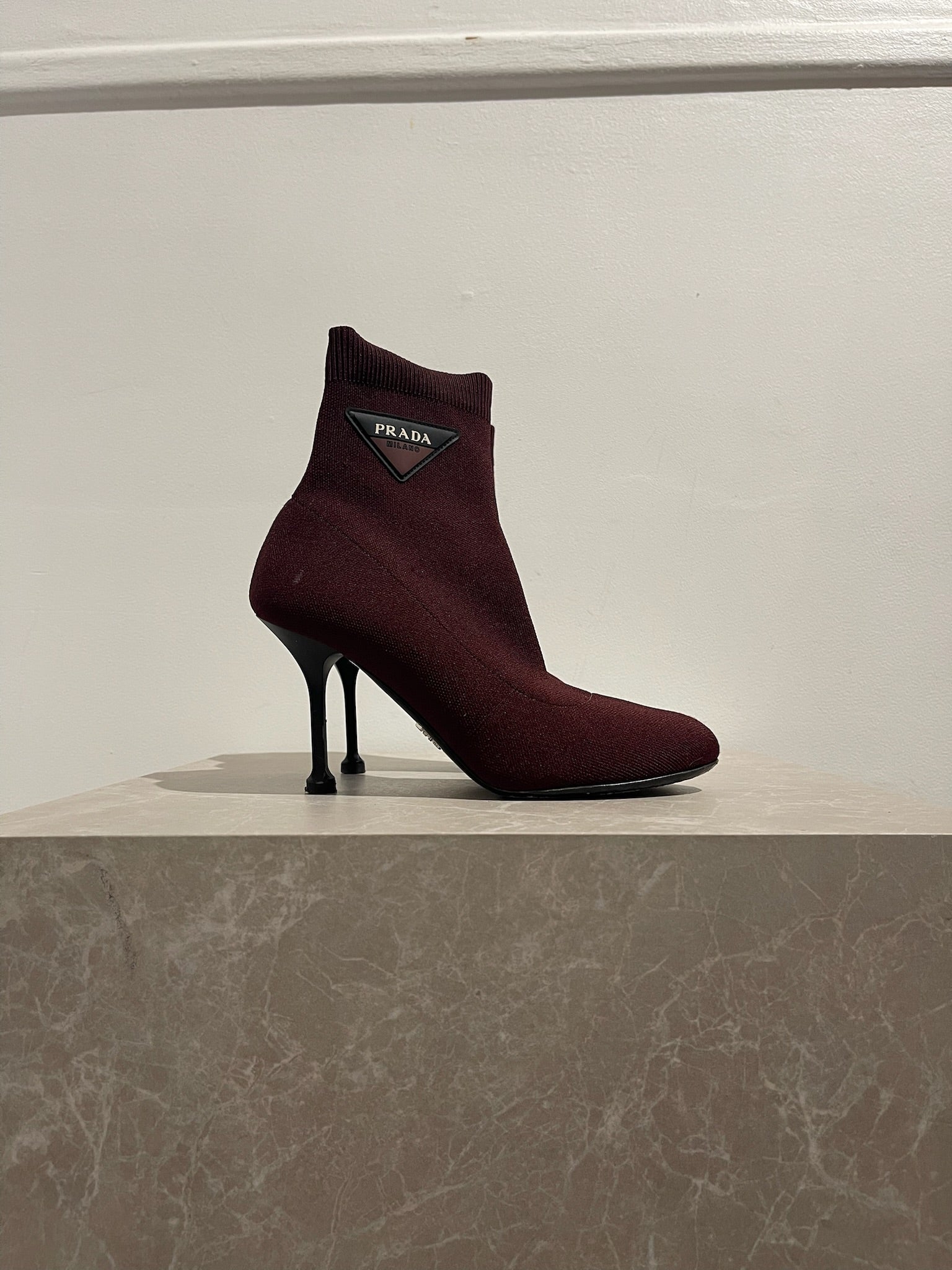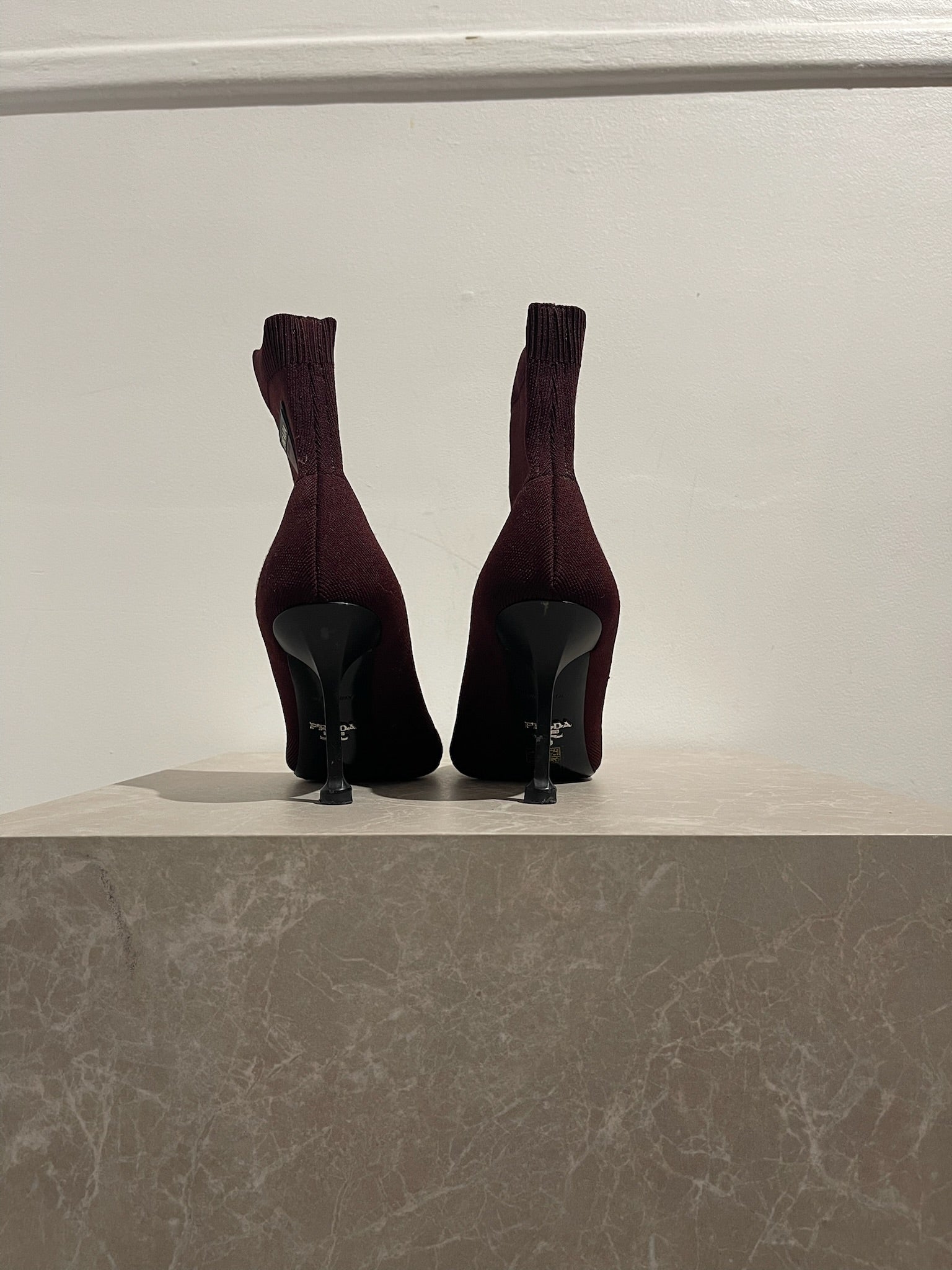 Bottines en maille bordeaux, façon chaussettes, avec logo Prada sur les cotés en caoutchouc.. Talons aiguilles.