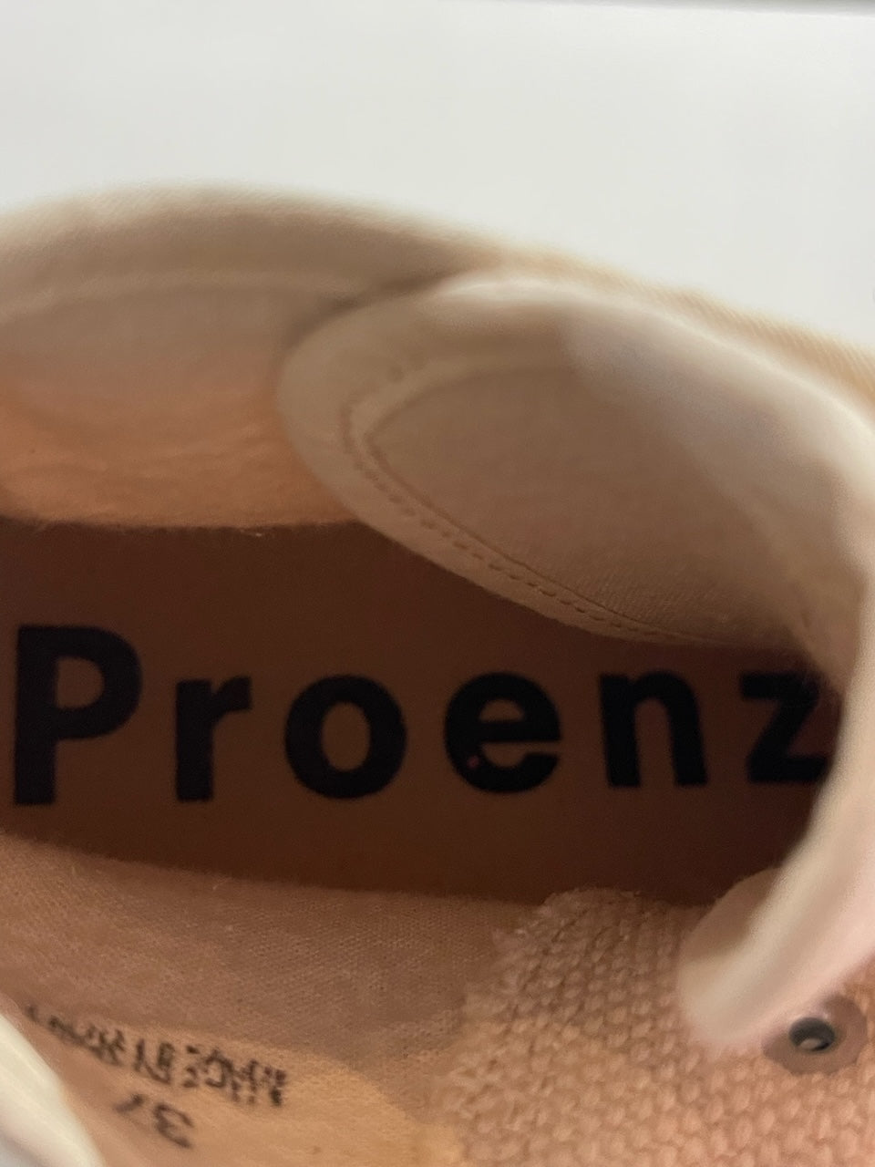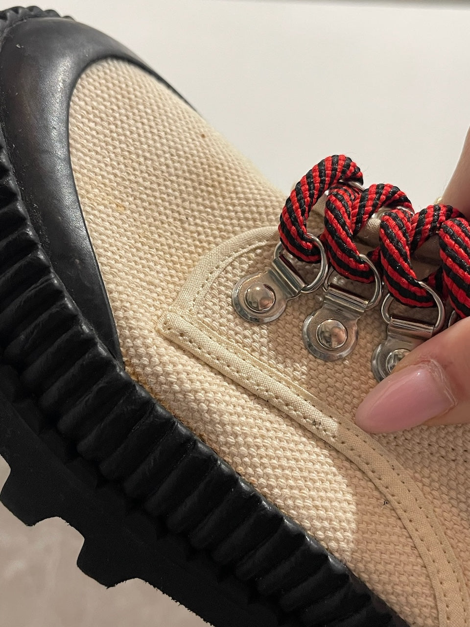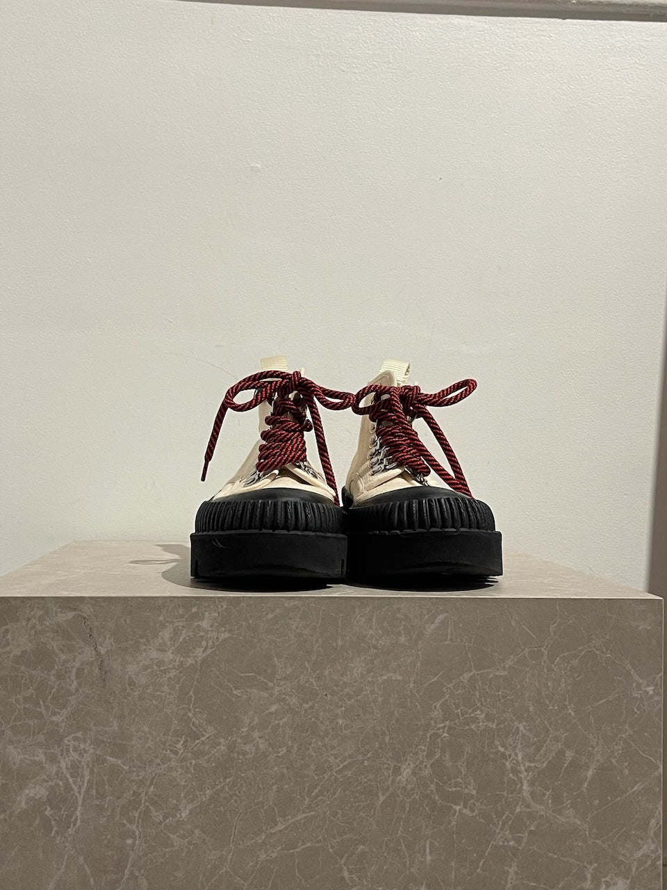 Bottines rangers en toile écrue avec fermeture à lacets rouge et semelles épaisses en gomme noire. Languette PS sur le côté.