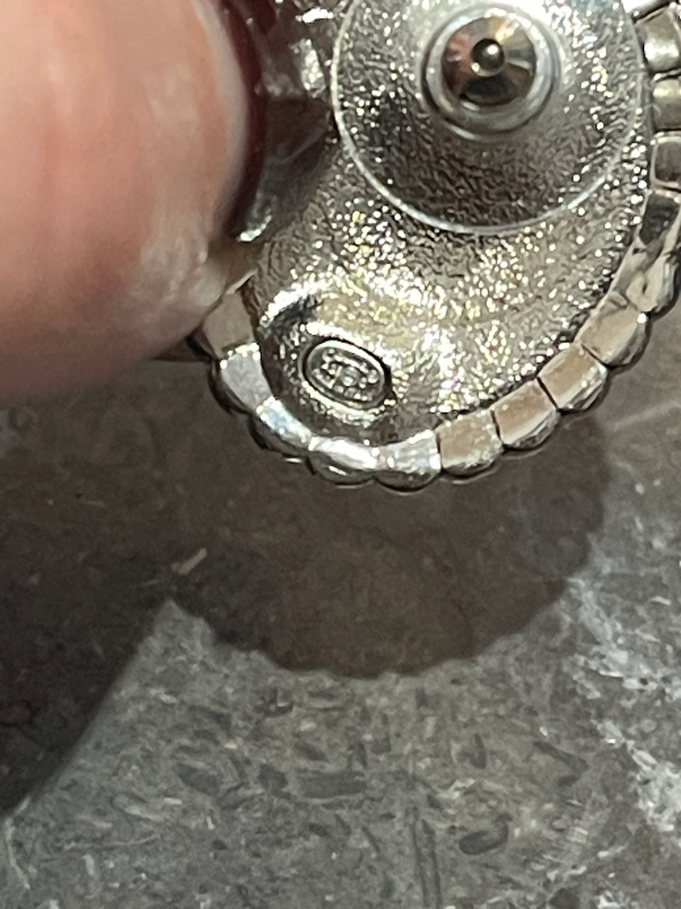 Boucles d'oreille en métal argent, forme ovale ornées du logo CC en résine blanche. Fermoir clous. Poinçon Chanel.
