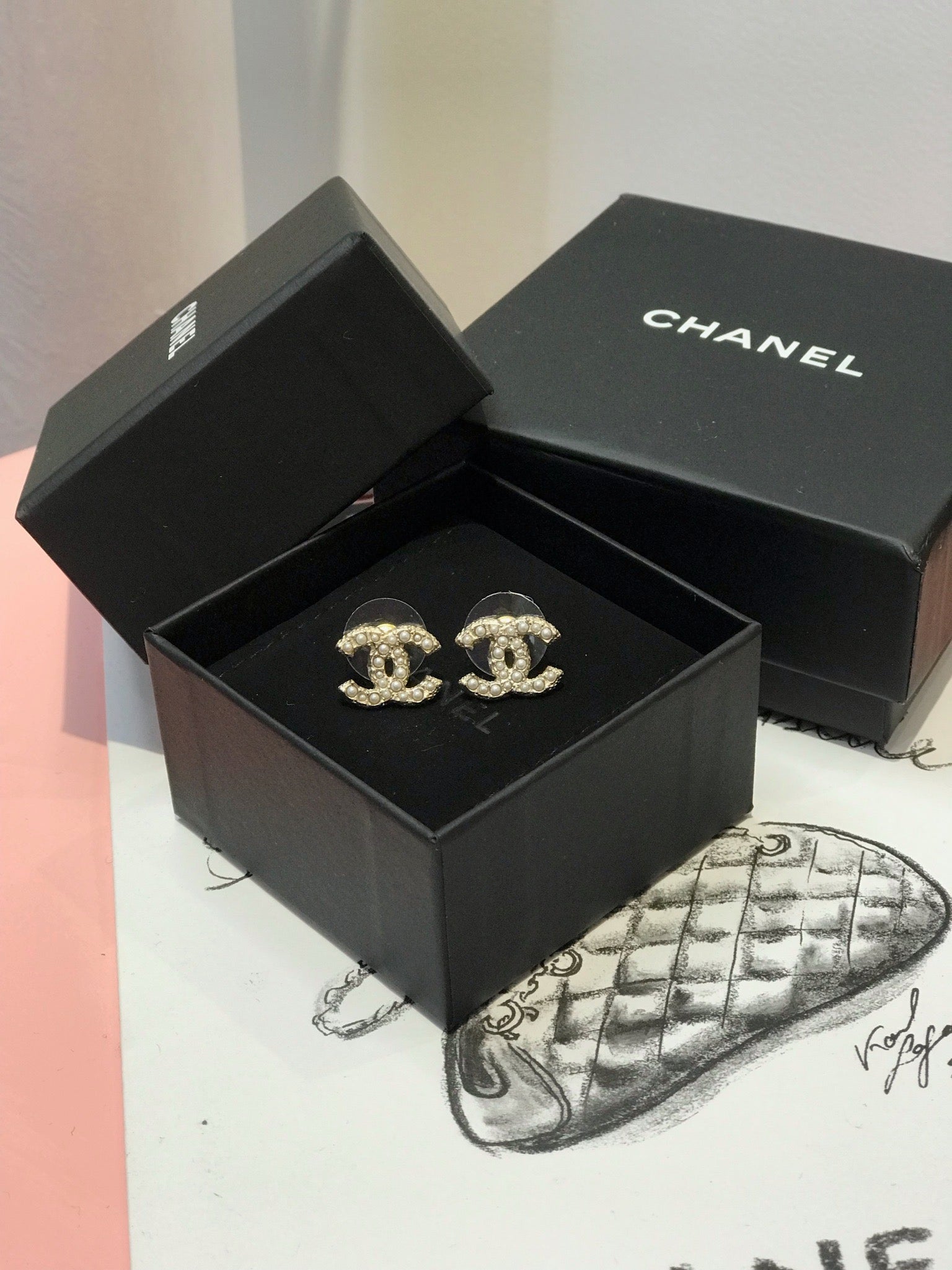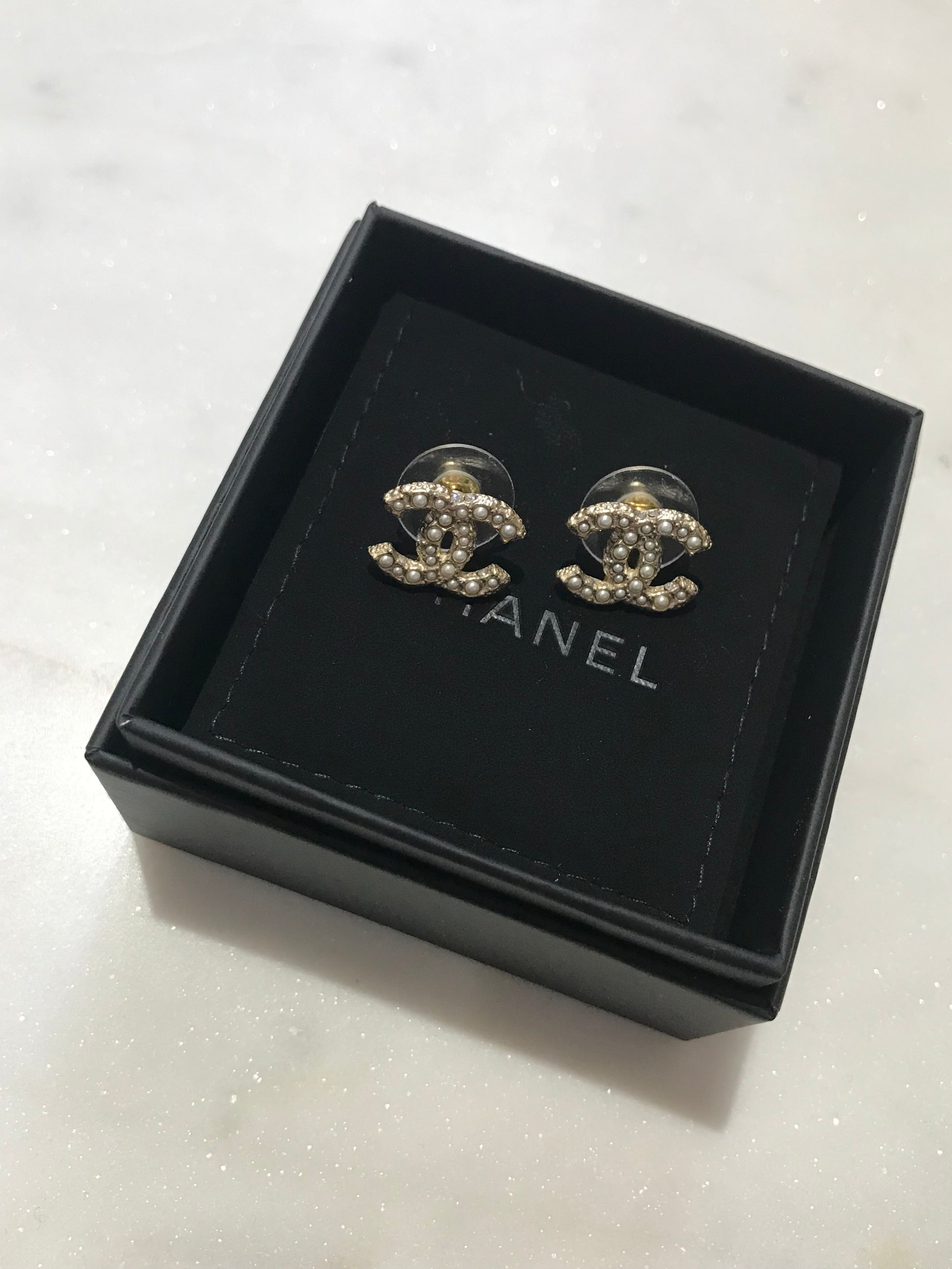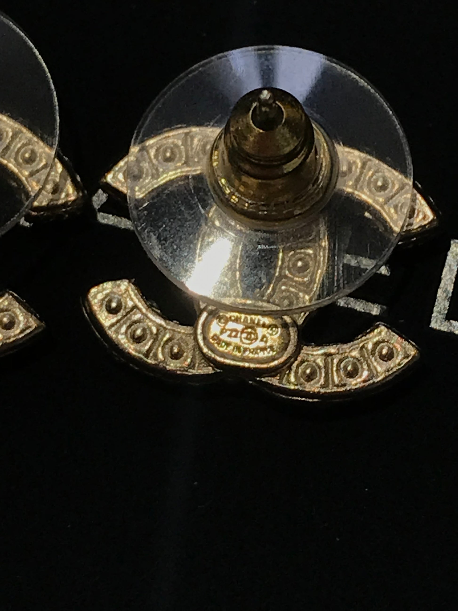 Boucles d'oreilles Chanel en métal doré, forme CC ornés de perles.