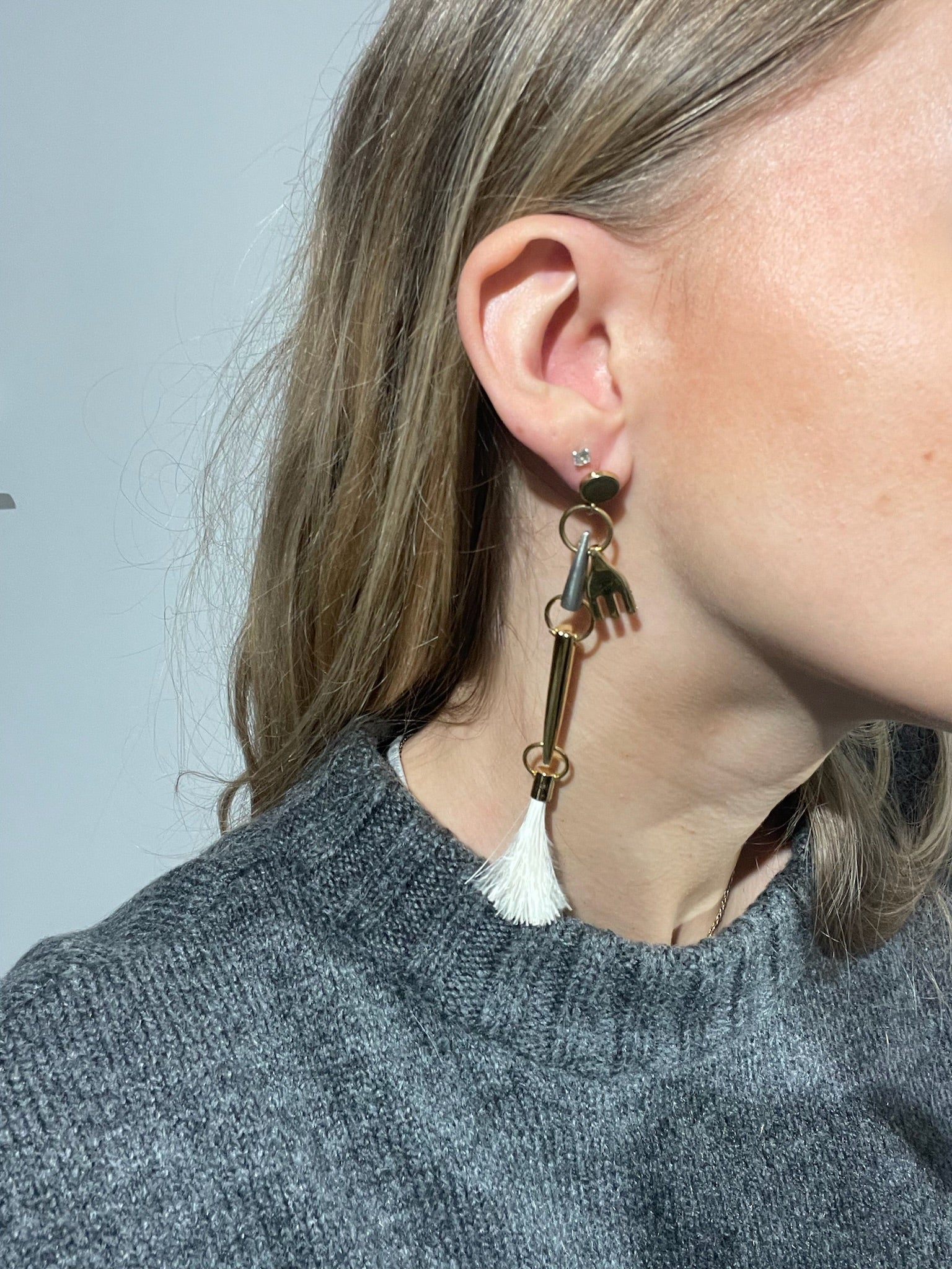Boucles d'oreilles pendantes en métal doré à breloque en forme de goutte et plumes. By Natacha Ramsay-Levi, collection automne 2019
