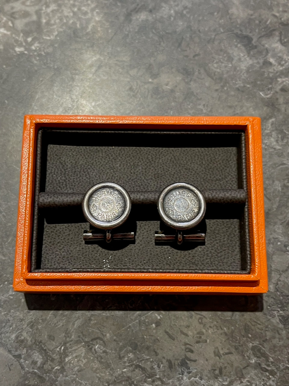 Boutons de manchettes en argent, forme ronde. Signature Hermès Paris.