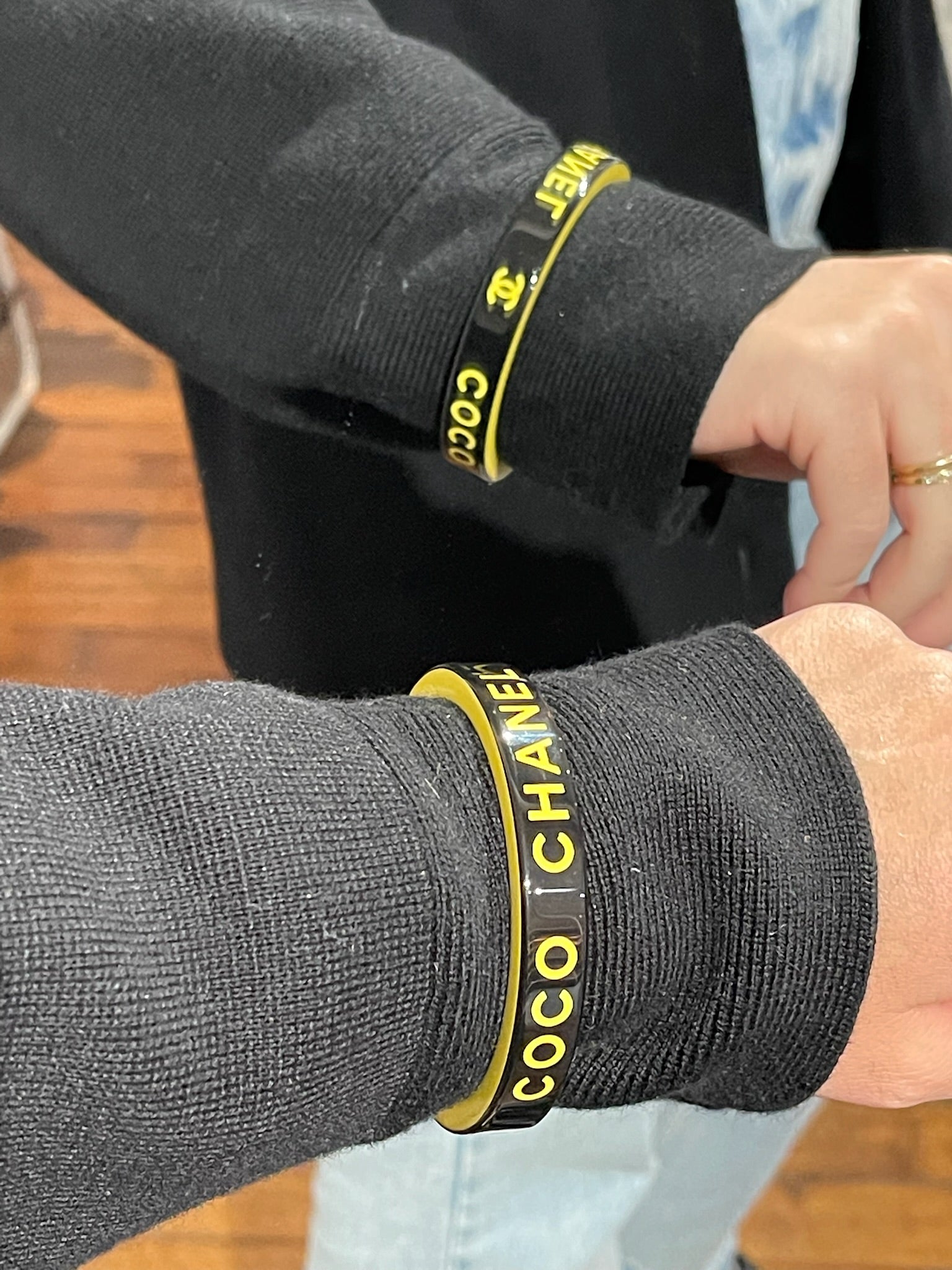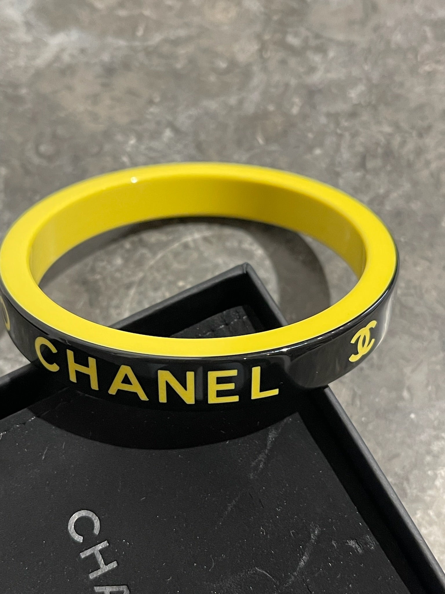 Jonc en résine noir et intérieur jaune avec inscription COCO Chanel CC en jaune.