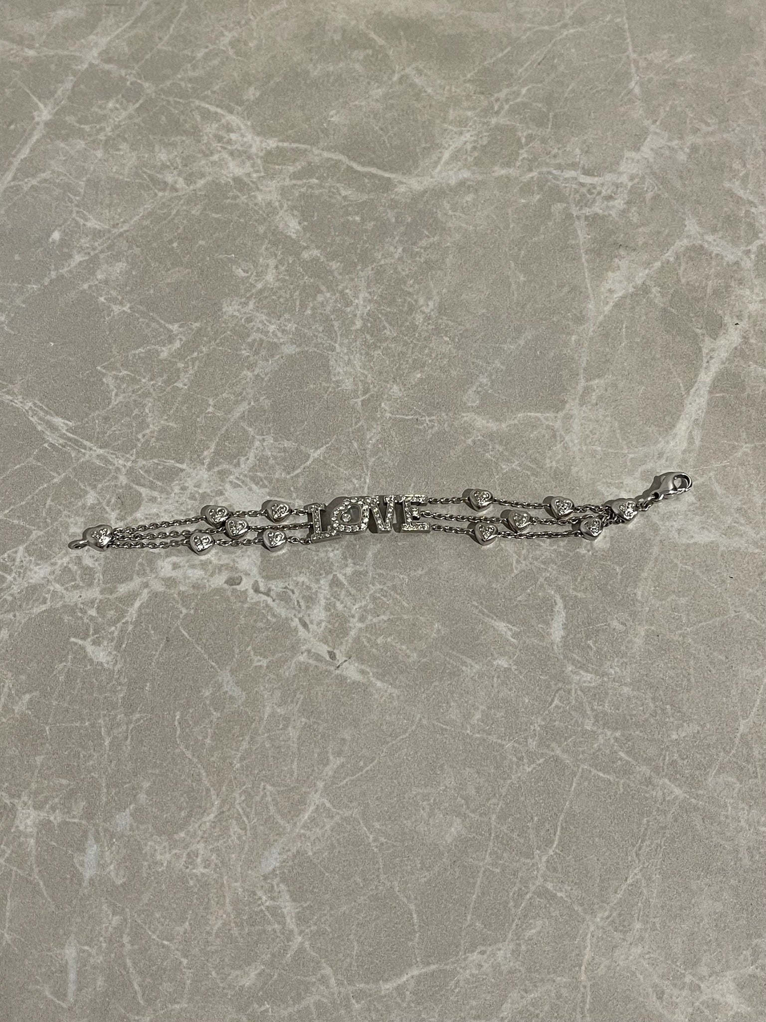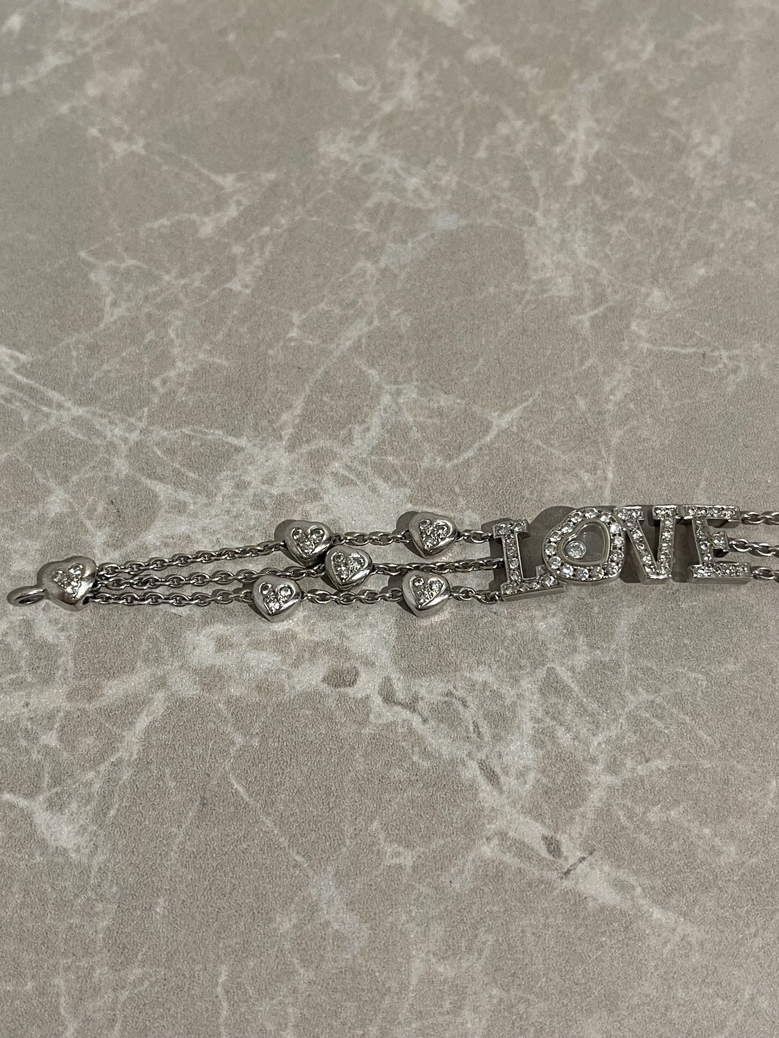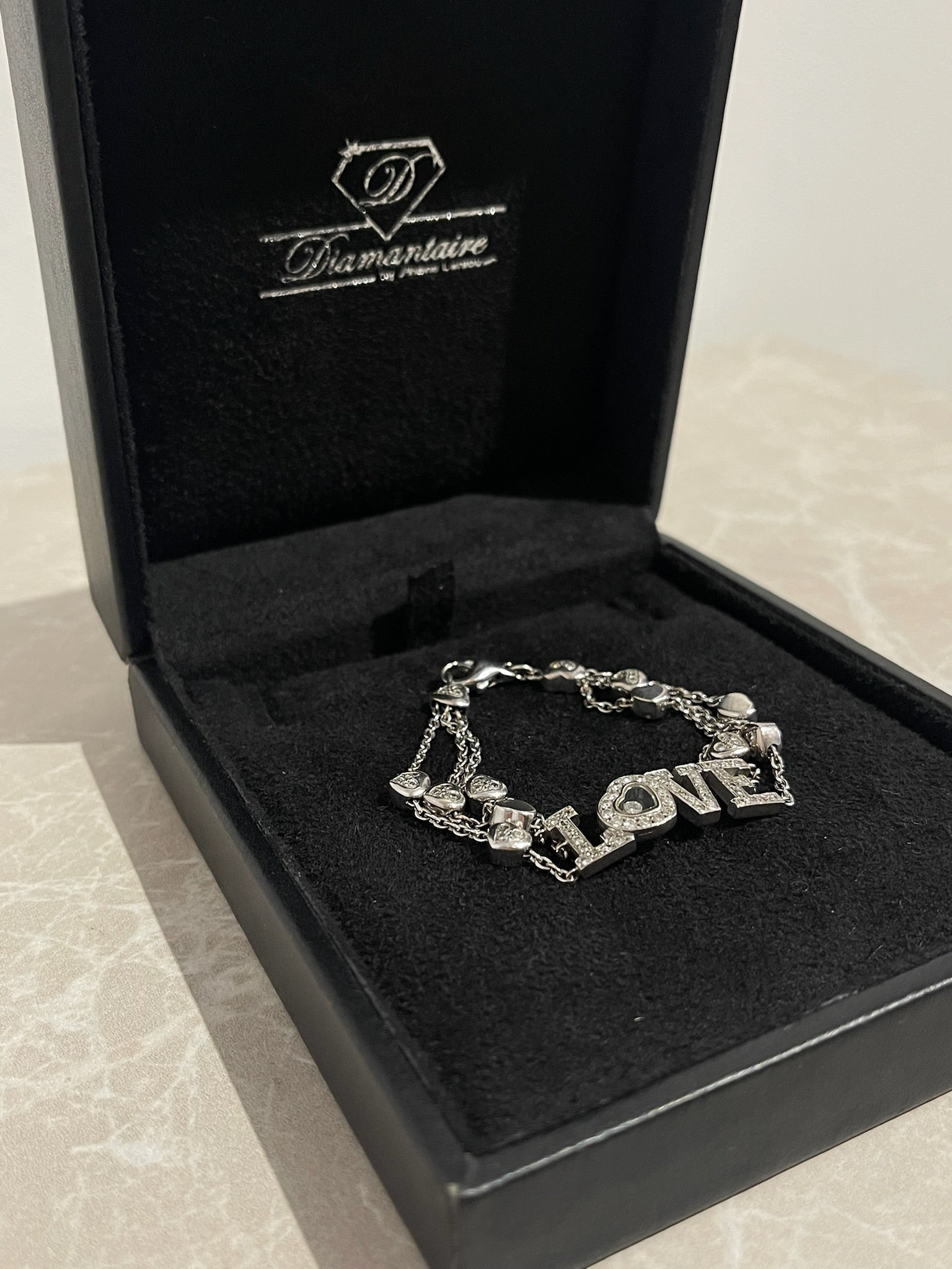 Bracelet à chaine en or blanc, orné de coeur serti de diamant. Composé du mot "love" serti de diamant, dont le O figure un coeur. Fermoir mousqueton.