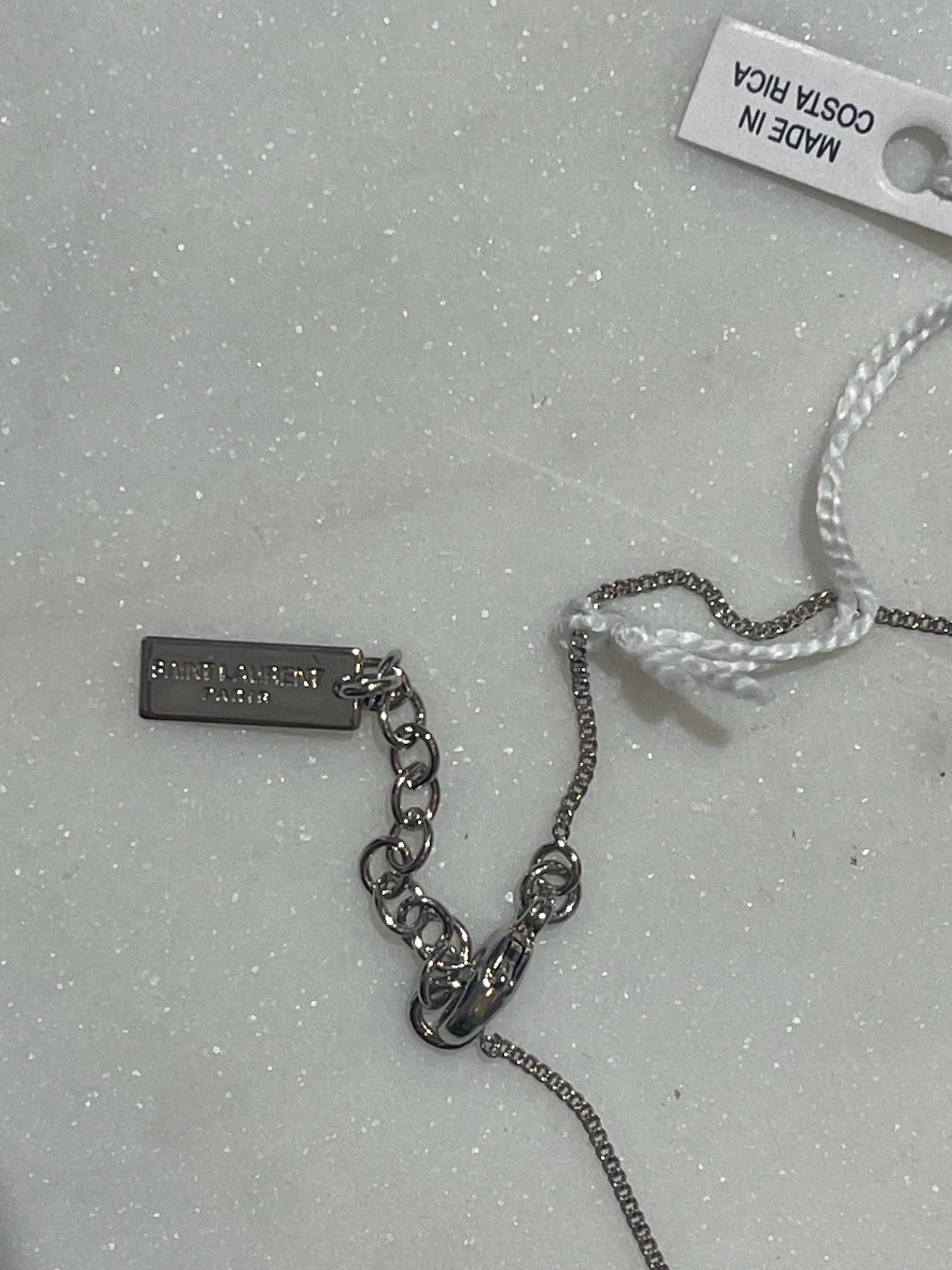 Bracelet chaine en métal argent, orné du logo YSL. Fermoir mousqueton, réglable. Plaque signée Saint Laurent.