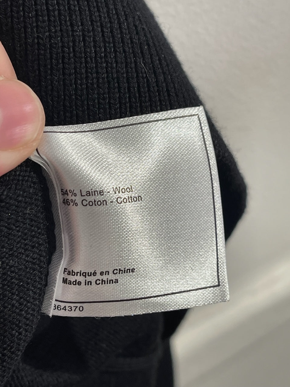 Cardigan en laine et coton noir avec col V, fermeture à boutons signés CC et tête de lion. Poches avant. Bords en maille côtelée.